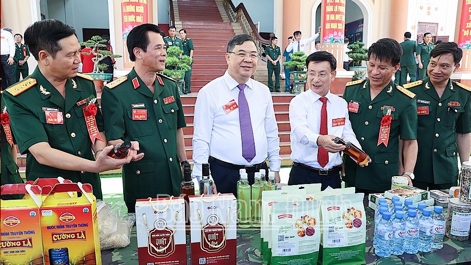 | Các đồng chí Bí thư Tỉnh ủy Phạm Gia Túc; Chủ tịch UBND tỉnh Phạm Đình Nghị; Trung tướng Nguyễn Quang Cường, Bí thư Đảng ủy, Chính ủy Quân khu 3 tham quan khu trưng bày sản phẩm OCOP của cán bộ, chiến sĩ LLVT tỉnh. |