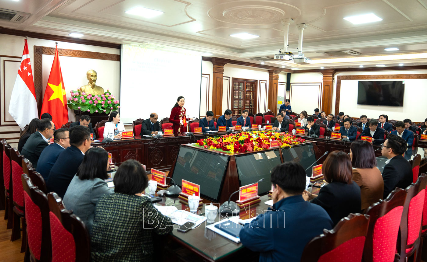 Phát biểu chào mừng đoàn công tác của Đại sứ đặc mệnh toàn quyền Singapore tại Việt Nam, đồng chí Bí thư Tỉnh ủy Lê Thị Thủy bày tỏ niềm vui được đón tiếp đoàn công tác nhân dịp năm mới 2025. Đồng chí Bí thư Tỉnh ủy nhấn mạnh: Tỉnh Hà Nam nằm ở vùng đồng bằng sông Hồng, có hệ thống giao thông kết nối với thành phố Hà Nội, Hải Phòng và các tỉnh trong khu vực tương đối thuận lợi.