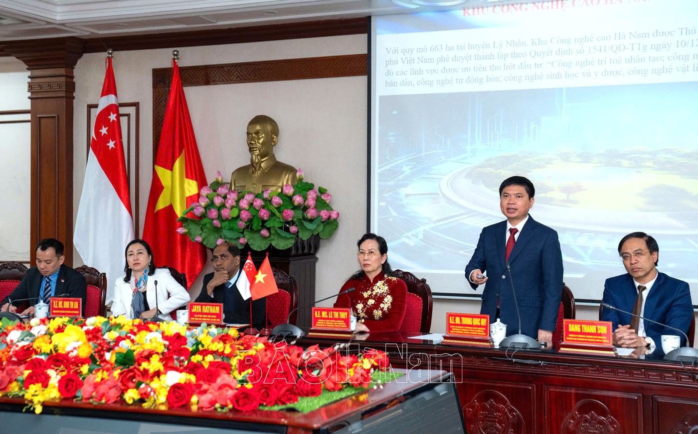 Tỉnh được Thủ tướng cho phép thành lập Khu Công nghệ cao có diện tích 663 ha tại huyện Lý Nhân, có hệ thống đường giao thông thuận tiện. Đây cũng là Khu Công nghệ cao thứ 5 trên địa bàn toàn quốc. Với điều kiện thuận lợi, tỉnh Hà Nam mong muốn Đại sứ tiếp tục hỗ trợ, quảng bá, giới thiệu môi trường đầu tư của tỉnh tới các nhà đầu tư Singapore và các nhà đầu tư trên thế giới. Tỉnh Hà Nam cam kết tạo điều kiện thuận lợi nhất cho các nhà đầu tư vào tỉnh. Đồng chí Bí thư Tỉnh ủy tin tưởng, với truyền thống hữu nghị và sự hợp tác chặt chẽ thời gian qua, mối quan hệ cũng như sự hợp tác thời gian tới giữa Đại sứ quán Singapore và tỉnh Hà Nam sẽ thành công tốt đẹp hơn nữa, góp phần đưa quan hệ Việt Nam - Singapore lên tầm cao mới.