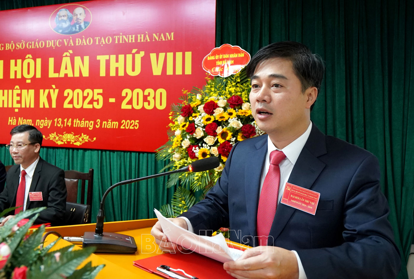 Trong đó, Đảng bộ cần chú trọng công tác xây dựng Đảng; lãnh đạo thực hiện nhiệm vụ chính trị của cơ quan và toàn ngành; tăng cường các giải pháp nâng cao chất lượng giáo dục toàn diện ở tất cả các cấp học; quan tâm lĩnh vực giáo dục nghề nghiệp mới; huy động các nguồn lực phát triển hệ thống cơ sở giáo dục; tiếp tục giữ vững chất lượng phổ cập giáo dục THCS, phổ cập giáo dục tiểu học, phổ cập giáo dục mầm non cho trẻ 5 tuổi; rà soát các điều kiện chuẩn bị phổ cập cho trẻ mẫu giáo 3, 4 tuổi; tiếp tục tham mưu UBND tỉnh chỉ đạo thực hiện tốt các điều kiện nâng cao chất lượng giáo dục, như: tuyển dụng và đào tạo, bồi dưỡng giáo viên, xây dựng trường lớp, trang thiết bị giáo dục theo hướng hiện đại, đáp ứng tiêu chuẩn trường chuẩn quốc gia; chuẩn bị tốt các điều kiện, cơ chế, chính sách về GD&ĐT để hội nhập khu vực; bảo đảm vận hành hệ thống GD&ĐT khi sáp nhập tỉnh theo chỉ đạo của Trung ương; bám sát mục tiêu, nhiệm vụ, giải pháp để tổ chức thực hiện có trọng tâm, trọng điểm gắn với lộ trình phù hợp với đặc điểm tình hình của ngành nhằm thực hiện Nghị quyết 29–NQ/TW của Ban Chấp hành Trung ương Đảng khóa XI về đổi mới căn bản, toàn diện GD&ĐT, đáp ứng nhu cầu công nghiệp hóa, hiện đại hóa trong điều kiện kinh tế thị trường định hướng xã hội chủ nghĩa và hội nhập quốc tế” gắn với thực hiện Nghị quyết số 57-NQ/TW của Bộ Chính trị về đột phá phát triển khoa học, công nghệ, đổi mới sáng tạo và chuyển đổi số, Nghị quyết số 24-NQ/TU của Tỉnh uỷ về chuyển đổi số tỉnh Hà Nam đến năm 2025, định hướng đến năm 2030…