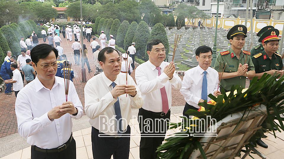 Trong không khí trang nghiêm, Đoàn đại biểu đã thành kính đặt vòng hoa mang dòng chữ “Đời đời nhớ ơn các Anh hùng Liệt sĩ” và dâng hương tưởng nhớ các Anh hùng Liệt sĩ đã anh dũng chiến đấu, hy sinh vì nền độc lập, tự do của Tổ quốc, vì nghĩa vụ quốc tế cao cả. Trước anh linh các Anh hùng Liệt sĩ, Đảng bộ, chính quyền và nhân dân toàn tỉnh nguyện phát huy truyền thống anh hùng của các thế hệ cha anh đi trước, đoàn kết, đồng lòng phấn đấu xây dựng tỉnh Nam Định trở thành tỉnh khá của cả nước vào năm 2030, xứng đáng với sự hy sinh to lớn của các Anh hùng Liệt sĩ.