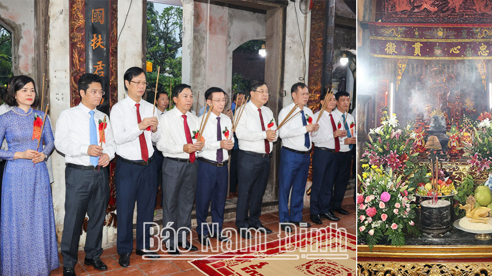 | Các đồng chí: Bí thư Tỉnh ủy Phạm Gia Túc; Phó Bí thư Thường trực Tỉnh ủy Lê Quốc Chỉnh; Chủ tịch UBND tỉnh Phạm Đình Nghị và các đồng chí lãnh đạo tỉnh dâng hương tưởng niệm các vị vua Trần và Quốc công Tiết chế Hưng Đạo Đại vương Trần Quốc Tuấn tại Đền Thiên Trường, phường Lộc Vượng (thành phố Nam Định). |