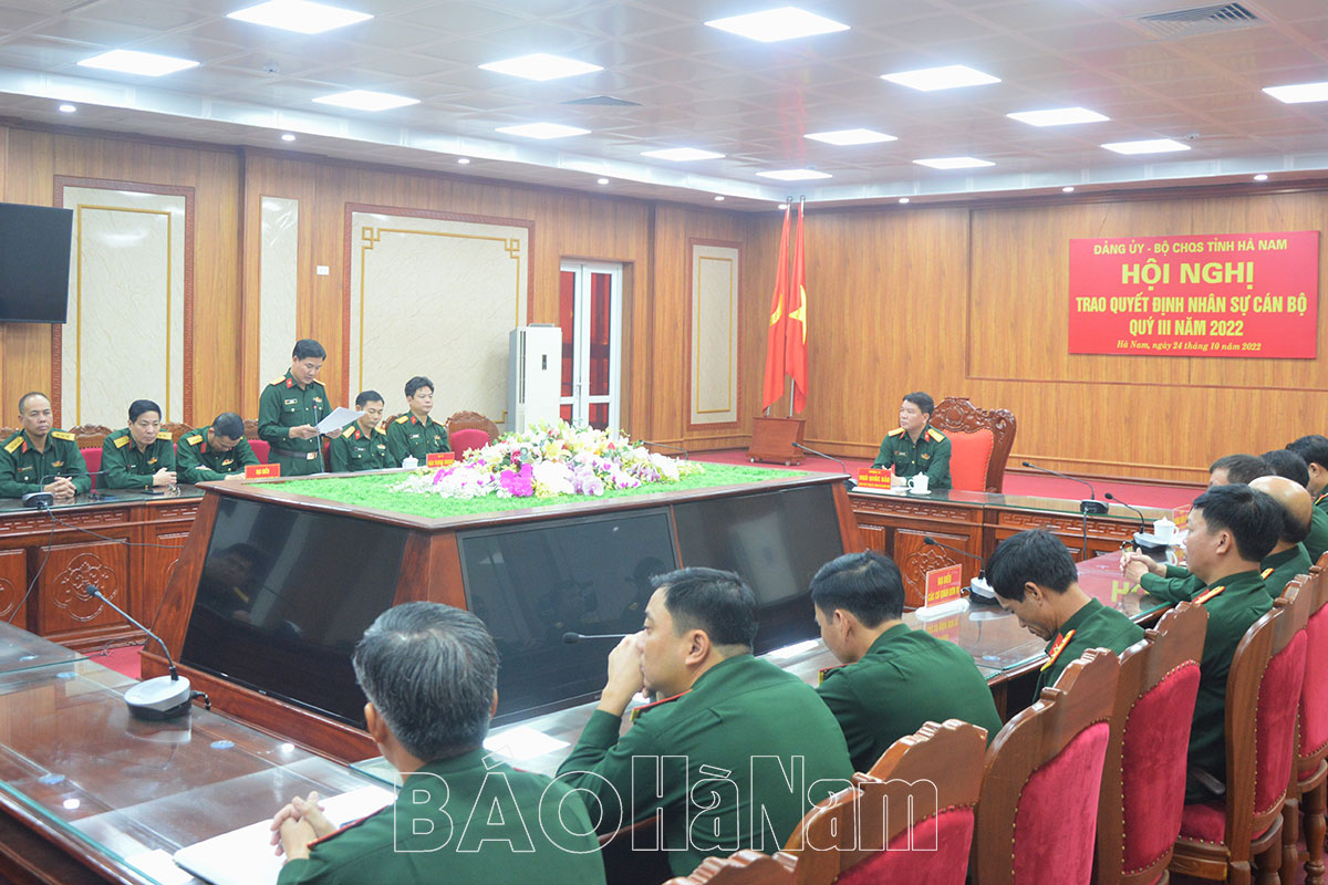 Theo đó, quý III/2022, Bộ CHQS tỉnh Hà Nam có 11 đồng chí được nhận Quyết định của Bộ Quốc phòng và Quân khu 3, trong đó có 4 đồng chí nhận Quyết định nghỉ hưu; 01 đồng chí nhận Quyết định nghỉ chờ hưu và 6 đồng chí được nhận Quyết định bổ nhiệm lại chức vụ và bổ nhiệm chức vụ mới.