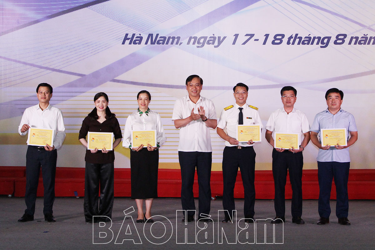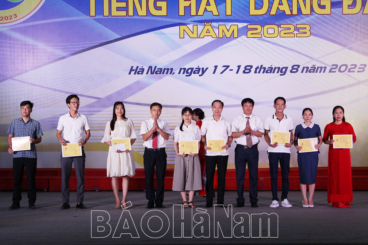12 giải Ba cho các tiết mục của Đảng bộ Liên đoàn Lao đông tỉnh; Chi bộ Ban Nội chính Tỉnh ủy; Chi bộ Tỉnh đoàn Hà Nam; Đảng bộ Cục Quản lý thị trường; Đảng bộ Sở Công thương; Đảng bộ Sở Lao động Thương binh và Xã hội; Đảng bộ Sở Tư pháp; Đảng bộ Ngân hàng Nhà nước tỉnh; Đảng bộ Sở Kế hoạch và Đầu tư; Chi bộ Hội Liên hiệp Phụ nữ tỉnh; Chi bộ Cơ quan Ủy ban Kiểm tra Tỉnh ủy ; Chi bộ Ban Tuyên giáo Tỉnh ủy và 12 giải Khuyến khích cho các đơn vị.