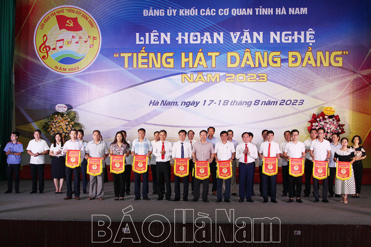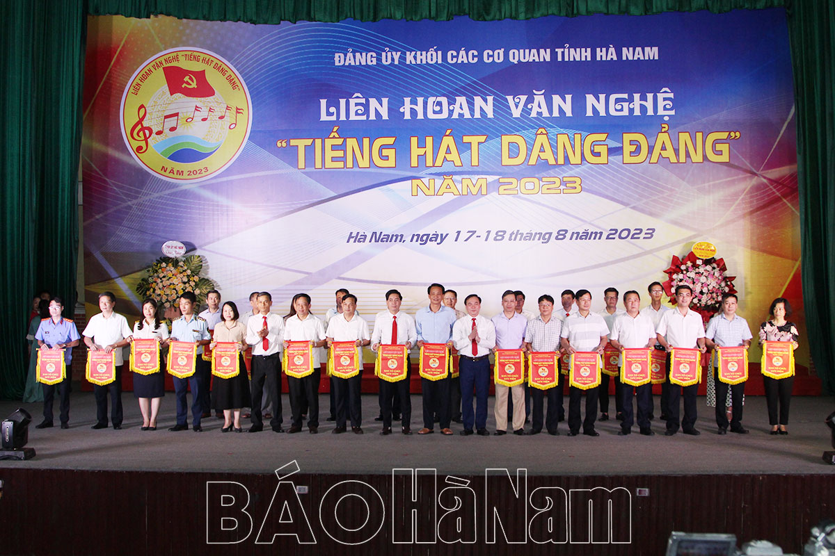 Đại diện Thường trực Đảng ủy Khối các cơ quan tỉnh tặng cờ lưu niệm cho các đơn vị tham dự liên hoan.