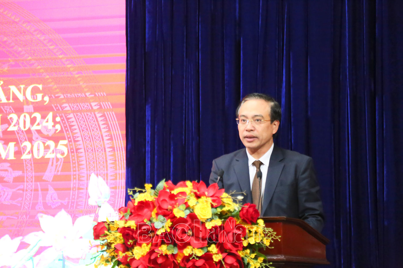 Phát biểu chỉ đạo hội nghị, đồng chí Phó Chủ tịch Thường trực HĐND tỉnh Đặng Thanh Sơn biểu dương, ghi nhận kết quả đạt được của Đảng bộ Khối các cơ quan tỉnh trong năm 2024. Để thực hiện tốt nhiệm vụ đề ra trong năm 2025 đồng chí đề nghị Đảng bộ Khối các cơ quan tỉnh tập trung lãnh đạo, chỉ đạo, triển khai thực hiện khẩn trương, nghiêm túc, đồng bộ, hiệu quả tổng kết Nghị quyết 18 của BCH Trung ương khoá XII một số vấn đề về tiếp tục đổi mới, sắp xếp tổ chức bộ máy của hệ thống chính trị tinh gọn, hoạt động hiệu lực, hiệu quả theo đúng tiến độ; sắp xếp tổ chức bộ máy, phân công CBĐV, công chức, viên chức theo định hướng, chỉ đạo của BTV Tỉnh ủy, Ban Chỉ đạo tổng kết Nghị quyết 18 của tỉnh. Tiếp tục tập trung lãnh đạo, chỉ đạo thực hiện có hiệu quả các nhiệm vụ, giải pháp trọng tâm được đề ra, phấn đấu hoàn thành, hoàn thành vượt mức các chỉ tiêu Nghị quyết Đại hội Đảng bộ tỉnh lần thứ XX, nhiệm kỳ 2020 - 2025; chuẩn bị tốt, tổ chức thành công đại hội đảng bộ các cấp nhiệm kỳ 2025 - 2030. Đổi mới công tác tuyên truyền bằng nhiều hình thức phù hợp; nâng cao chất lượng hiệu quả công tác học tập, quán triệt, triển khai thực hiện, sơ kết, tổng kết các nghị quyết, chỉ thị, kết luận của Trung ương, của tỉnh. Chú trọng xây dựng tổ chức cơ sở đảng; nâng cao năng lực lãnh đạo, sức chiến đấu của tổ chức cơ sở đảng và đội ngũ CBĐV; đổi mới, nâng cao chất lượng sinh hoạt chuyên đề. Tăng cường, nâng cao hiệu quả công tác KTGS thi hành kỷ luật Đảng. Lãnh đạo, chỉ đạo cấp ủy cơ sở phát huy vai trò hạt nhân, chủ động tăng cường trách nhiệm trong phối hợp với thủ trưởng cơ quan, đơn vị lãnh đạo CBĐV, công chức và người lao động;...