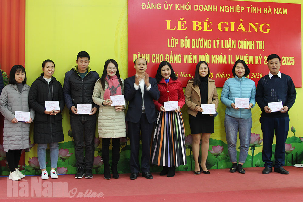 Đại diện lãnh đạo Đảng ủy Khối Doanh nghiệp tỉnh trao Giấy Chứng nhận hoàn thành chương trình bồi dưỡng lý luận chính trị cho đảng viên mới.
