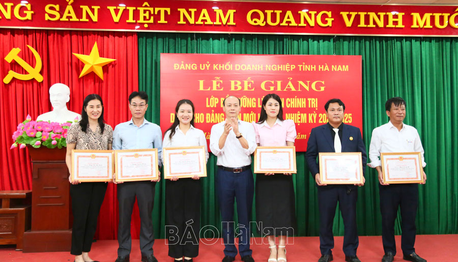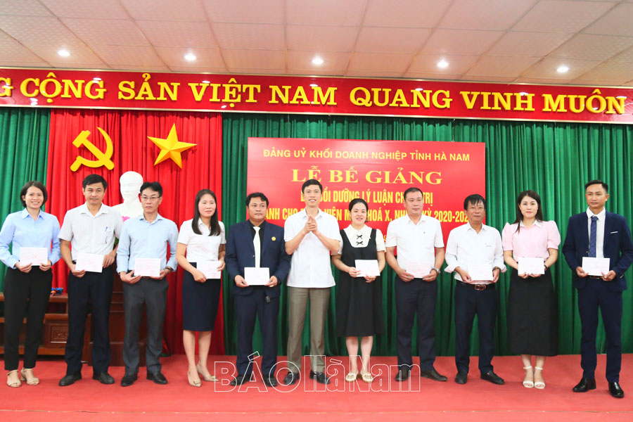 Lãnh đạo Đảng ủy Khối Doanh nghiệp khen thưởng cho các học viên có thành tích xuất sắc.Lãnh đạo Đảng ủy Khối Doanh nghiệp trao giấy chứng nhận cho các học viên.