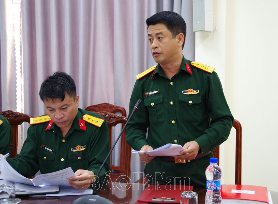 Đại diện ĐUQS huyện Bình Lục trình bày dự thảo nghị quyết lãnh đạo thực hiện nhiệm vụ năm 2025.