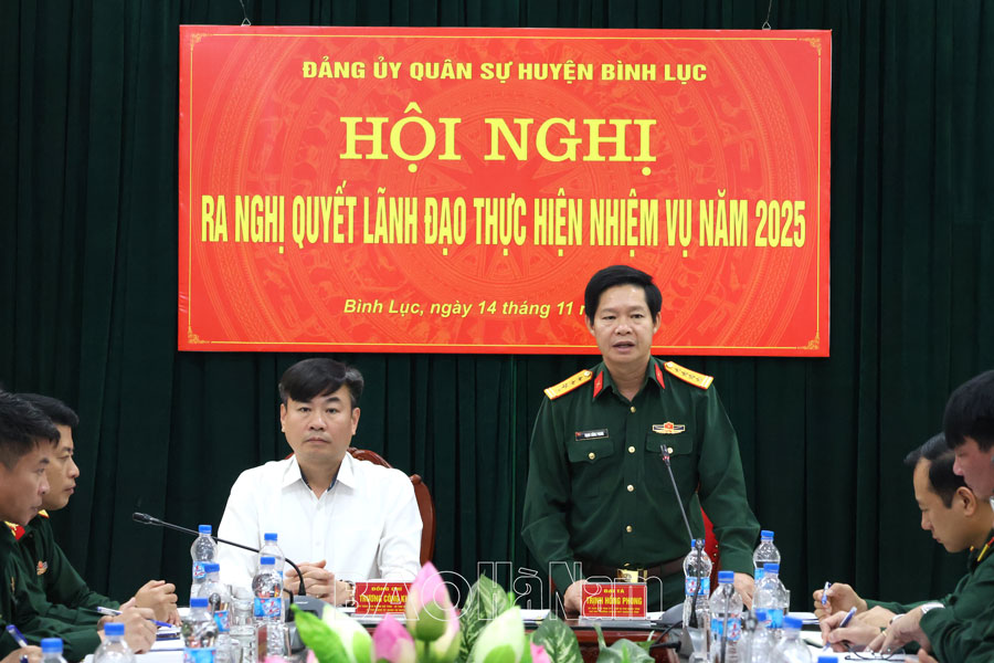 Phát biểu chỉ đạo tại hội nghị, đồng chí Trịnh Hồng Phong, Chỉ huy trưởng Bộ CHQS tỉnh ghi nhận những kết quả mà Đảng bộ Quân sự và LLVT huyện Bình Lục đạt được trong năm 2024. Đồng thời, đề nghị ĐUQS huyện Bình Lục bám sát chỉ tiêu nghị quyết của Huyện uỷ, ĐUQS tỉnh, tiếp tục thực hiện tốt việc tham mưu, đề xuất với cấp ủy, chính quyền địa phương lãnh đạo, thực hiện có hiệu quả công tác quản lý Nhà nước về nhiệm vụ quốc phòng; đẩy nhanh tiến độ xây dựng các công trình quân sự trong căn cứ chiến đấu huyện; thực hiện Đề án xây dựng trụ sở Ban CHQS cấp xã; tham mưu công tác quy hoạch, sử dụng nguồn cán bộ quân sự cấp xã đã qua đào tạo; phối hợp với các doanh nghiệp trên địa bàn tạo điều kiện việc làm cho quân nhân hoàn thành nghĩa vụ quân sự trở về địa phương; lãnh đạo tiếp tục đổi mới, nâng cao chất lượng công tác giáo dục chính trị, tư tưởng; tăng cường phổ biến giáo dục pháp luật, bảo đảm 100% cán bộ, chiến sĩ có bản lĩnh chính trị vững vàng, sẵn sàng nhận và hoàn thành tốt mọi nhiệm vụ được giao; lãnh đạo bảo đảm tốt công tác hậu cần, kỹ thuật, tài chính cho các nhiệm vụ. Quan tâm chăm lo xây dựng Đảng trong sạch, vững mạnh gắn với xây dựng đơn vị vững mạnh toàn diện “Mẫu mực, tiêu biểu”. Làm tốt công tác chuẩn bị và tổ chức thành công đại hội đảng bộ các cấp nhiệm kỳ 2025-2030.