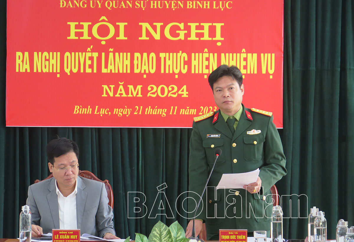 Phát biểu tại hội nghị, Đại tá Trịnh Đức Thiêm, Uỷ viên BTV ĐUQS tỉnh, Phó Chỉ huy trưởng Bộ CHQS tỉnh ghi nhận, đánh giá cao những kết quả đạt được của ĐUQS huyện Bình Lục trong năm 2023. Đồng chí nhấn mạnh: năm 2024, nhiệm vụ đặt ra với LLVT khá lớn với nhiều nhiệm vụ mới. Trong bối cảnh tình hình còn nhiều khó khăn, phức tạp, để hoàn thành thắng lợi nhiệm vụ đề ra đề nghị tập thể ĐUQS huyện Bình Lục cần tập trung đổi mới phương pháp công tác lãnh đạo, làm tốt chức năng tham mưu cho cấp uỷ, chính quyền địa phương trong lãnh đạo, chỉ đạo thực hiện công tác QP, QSĐP. Duy trì nghiêm nền nếp chính quy, rèn luyện kỷ luật. Phối hợp nắm chắc tình hình địa bàn, góp phần giữ vững ổn định an ninh chính trị, trật tự an toàn xã hội… Xây dựng LLVT huyện vững mạnh, đáp ứng yêu cầu nhiệm vụ trong tình hình mới.