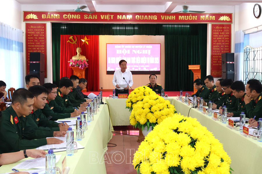 Phát biểu chỉ đạo tại hội nghị, Đại tá Đặng Văn Hoà, Chính uỷ Bộ CHQS tỉnh đề nghị, năm 2025 là năm tổ chức đại hội đảng bộ các cấp với nhiều nhiệm vụ cần tập trung thực hiện, ĐUQS huyện Lý Nhân cần lãnh đạo, chỉ đạo, làm tốt công tác nắm chắc tình hình, phối hợp giữ ổn định an ninh chính trị, trật tự an toàn địa bàn; tham mưu kịp thời với Huyện uỷ, UBND huyện lãnh đạo, chỉ đạo và tổ chức triển khai hoàn thành tốt nhiệm vụ QP, QSĐP. Thực hiện tốt công tác bồi dưỡng, tạo nguồn cán bộ quân sự cơ sở; làm tốt công tác tuyển quân; thực hiện nghiêm nền nếp, chế độ đơn vị. Tập trung nâng cao chất lượng tổng hợp, trình độ, khả năng sẵn sàng chiến đấu; huấn luyện, diễn tập, hội thi, hội thao. Nâng cao năng lực lãnh đạo, sức chiến đấu của các tổ chức đảng, xây dựng Đảng bộ Quân sự huyện vững mạnh về chính trị, tư tưởng, đạo đức, tổ chức và cán bộ.