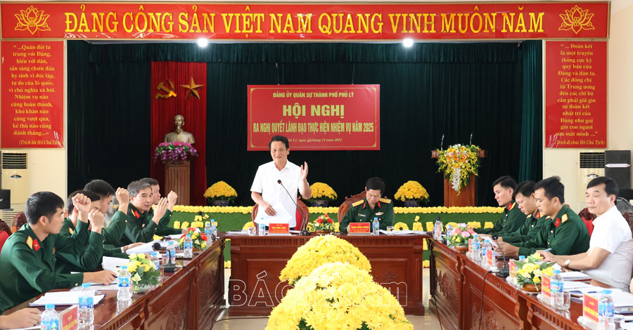 Chiều 20/11, Đảng ủy Quân sự (ĐUQS) thành phố Phủ Lý tổ chức hội nghị ra nghị quyết lãnh đạo thực hiện nhiệm vụ năm 2025. Đại tá Trịnh Hồng Phong, Ủy viên Ban Thường vụ (BTV) Tỉnh ủy, Phó Bí thư ĐUQS tỉnh, Chỉ huy trưởng Bộ CHQS tỉnh dự, chỉ đạo hội nghị. Đồng chí Đào Đình Tùng, Ủy viên BTV Tỉnh ủy, Bí thư Thành ủy, Bí thư ĐUQS thành phố Phủ Lý chủ trì hội nghị.