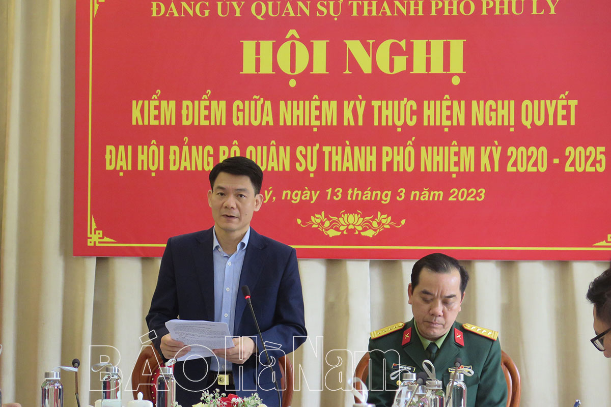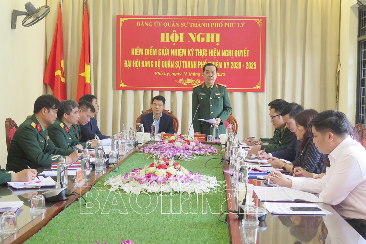 Chiều 13/3, Đảng uỷ Quân sự (ĐUQS) thành phố Phủ Lý tổ chức hội nghị kiểm điểm giữa nhiệm kỳ thực hiện Nghị quyết Đại hội Đảng bộ Quân sự thành phố nhiệm kỳ 2020-2025. Đại tá Lường Văn Thắng, Uỷ viên BTV Tỉnh uỷ, Chỉ huy trưởng Bộ CHQS tỉnh dự, chỉ đạo hội nghị. Đồng chí Nguyễn Đức Toàn, Uỷ viên BTV Tỉnh uỷ, Bí thư Thành uỷ, Bí thư ĐUQS thành phố, Chủ tịch HĐND thành phố chủ trì hội nghị.