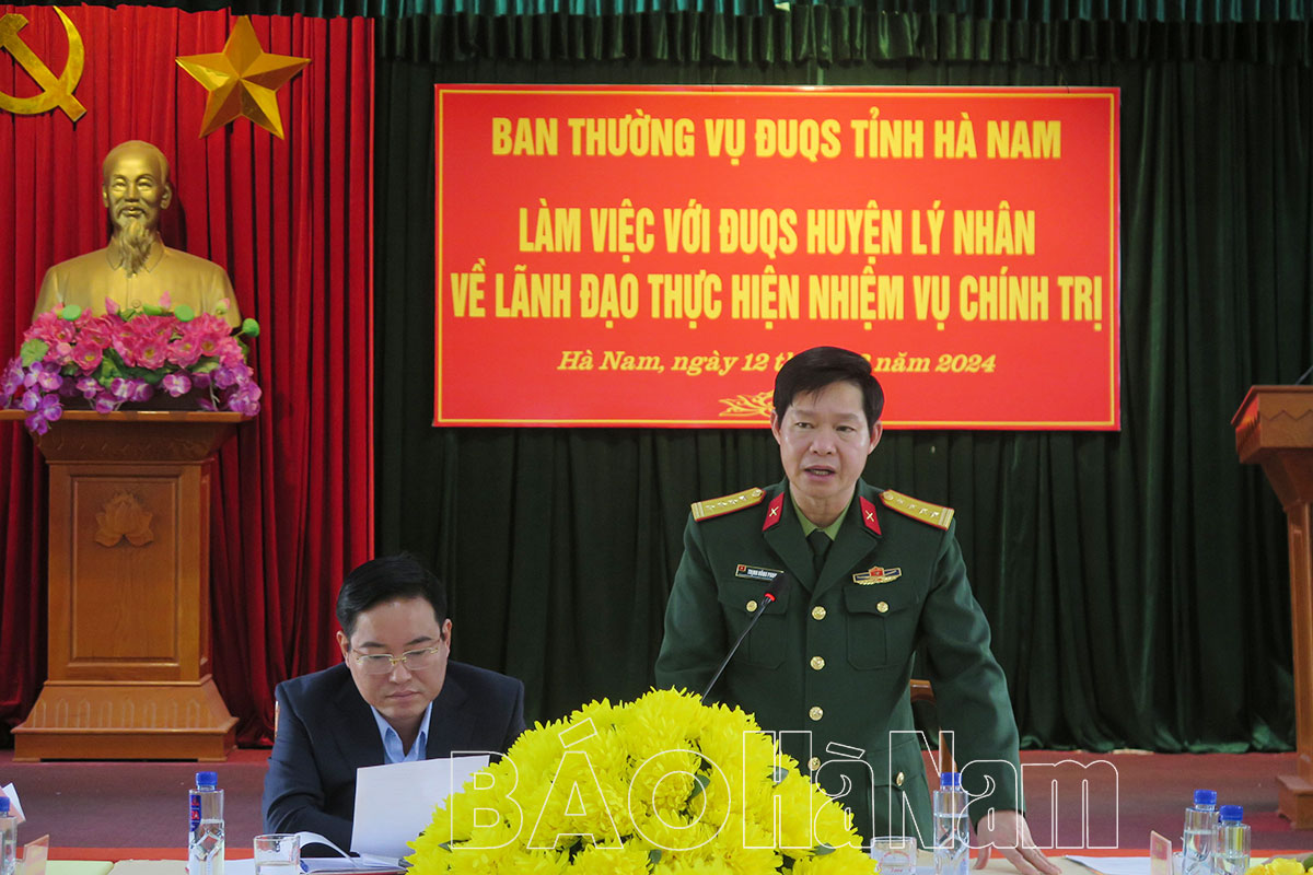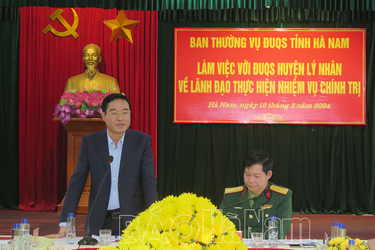 Chiều 12/3, Ban Thường vụ Đảng uỷ Quân sự (ĐUQS) tỉnh tổ chức hội nghị làm việc với ĐUQS huyện Lý Nhân về thực hiện nhiệm vụ chính trị. Đại tá Trịnh Hồng Phong, Phó Bí thư ĐUQS tỉnh, Chỉ huy trưởng Bộ CHQS tỉnh chủ trì hội nghị. Dự hội nghị có các đồng chí ủy viên Ban Thường vụ ĐUQS tỉnh; đại diện các cơ quan Bộ CHQS tỉnh, Huyện uỷ, UBND huyện và ĐUQS huyện Lý Nhân.