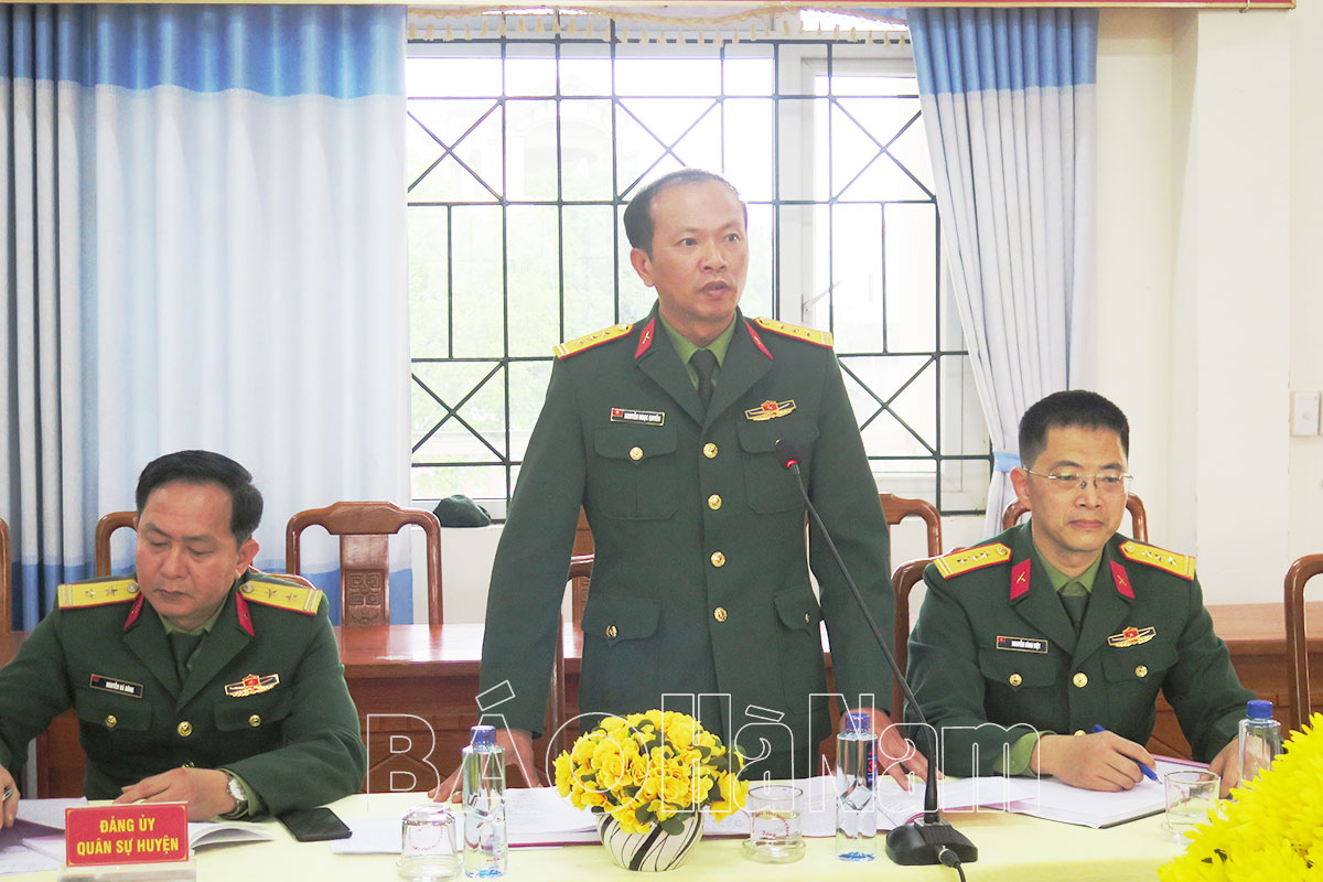 Thượng tá Nguyễn Ngọc Quyền, Chỉ huy trưởng Ban CHQS huyện Lý Nhân phát biểu tại hội nghị.Đồng chí Trần Đức Thuấn, Uỷ viên BCH Đảng bộ tỉnh, Bí thư Huyện uỷ, Bí thư ĐUQS huyện phát biểu tại hội nghị.Đồng chí Nguyễn Đức Nhương, Phó Bí thư Huyện uỷ, Chủ tịch UBND huyện Lý Nhân phát biểu tại hội nghị.Đại tá Trịnh Hồng Phong, Phó Bí thư ĐUQS tỉnh, Chỉ huy trưởng Bộ CHQS tỉnh phát biểu chỉ đạo tại hội nghị.