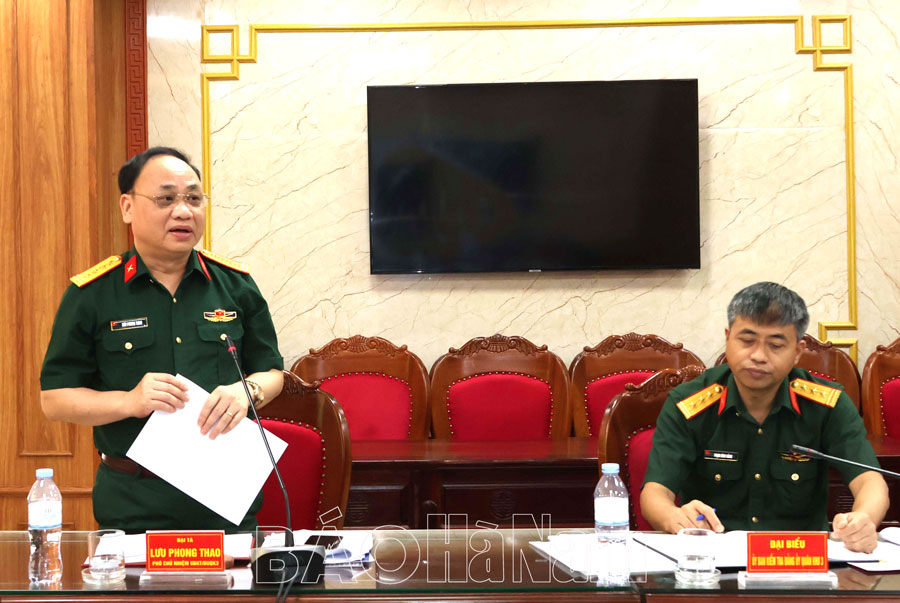 Đại tá Lưu Phong Thao, Phó Chủ nhiệm Ủy ban Kiểm tra, Đảng ủy Quân khu 3 phát biểu tại hội nghị.