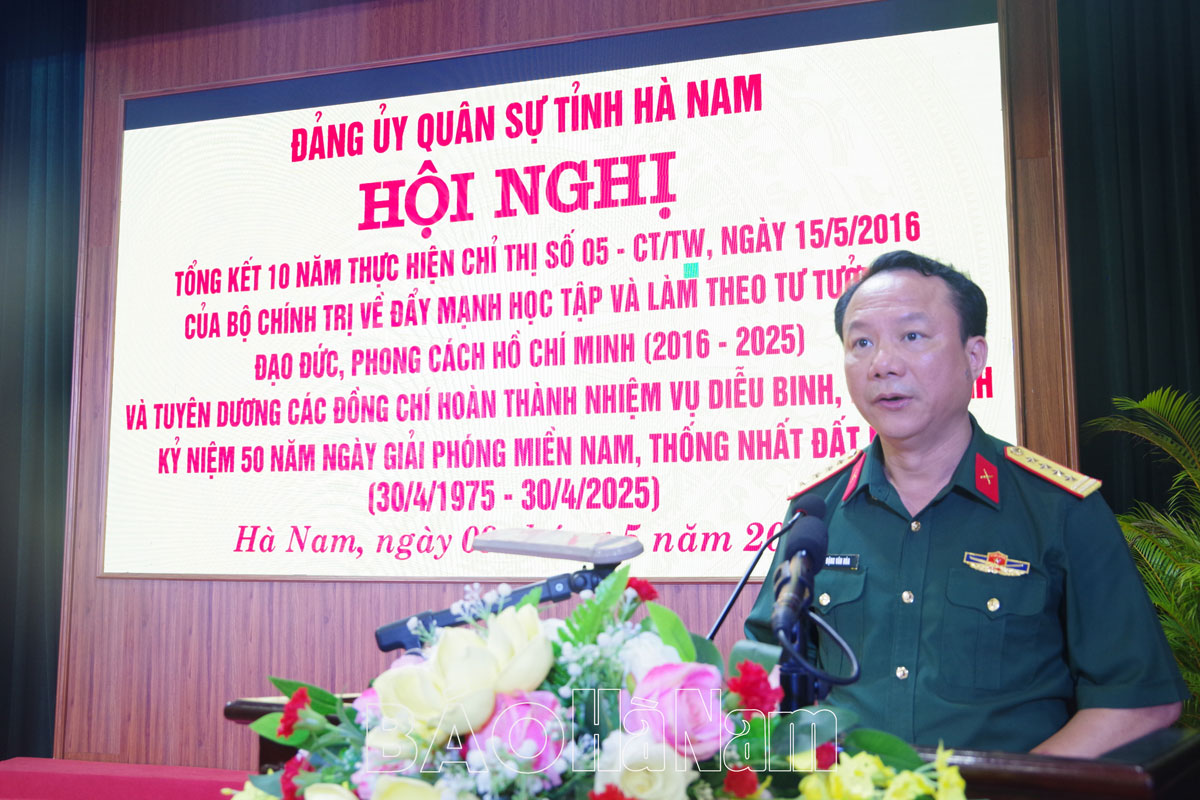 Sáng 9/5, Đảng ủy Quân sự (ĐUQS) tỉnh tổ chức hội nghị tổng kết 10 năm thực hiện Chỉ thị số 05 - CT/TW, ngày 15/5/2016 của Bộ Chính trị về đẩy mạnh học tập và làm theo tư tưởng, đạo đức, phong cách Hồ Chí Minh (Chỉ thị 05) trong Đảng bộ, lực lượng vũ trang (LLVT) tỉnh giai đoạn 2016 – 2025; tuyên dương khen thưởng các cán bộ, chiến sỹ (CBCS) hoàn thành nhiệm vụ diễu binh, diễu hành kỷ niệm 50 năm Ngày Giải phóng miền Nam, thống nhất đất nước. Dự, chỉ đạo hội nghị có đồng chí Đinh Thị Lụa, Phó Bí thư Thường trực Tỉnh ủy; Đại tá Trịnh Hồng Phong, Ủy viên Ban Thường vụ Tỉnh ủy, Chỉ huy trưởng Bộ CHQS tỉnh; lãnh đạo Ban Tuyên giáo và Dân vận Tỉnh ủy...