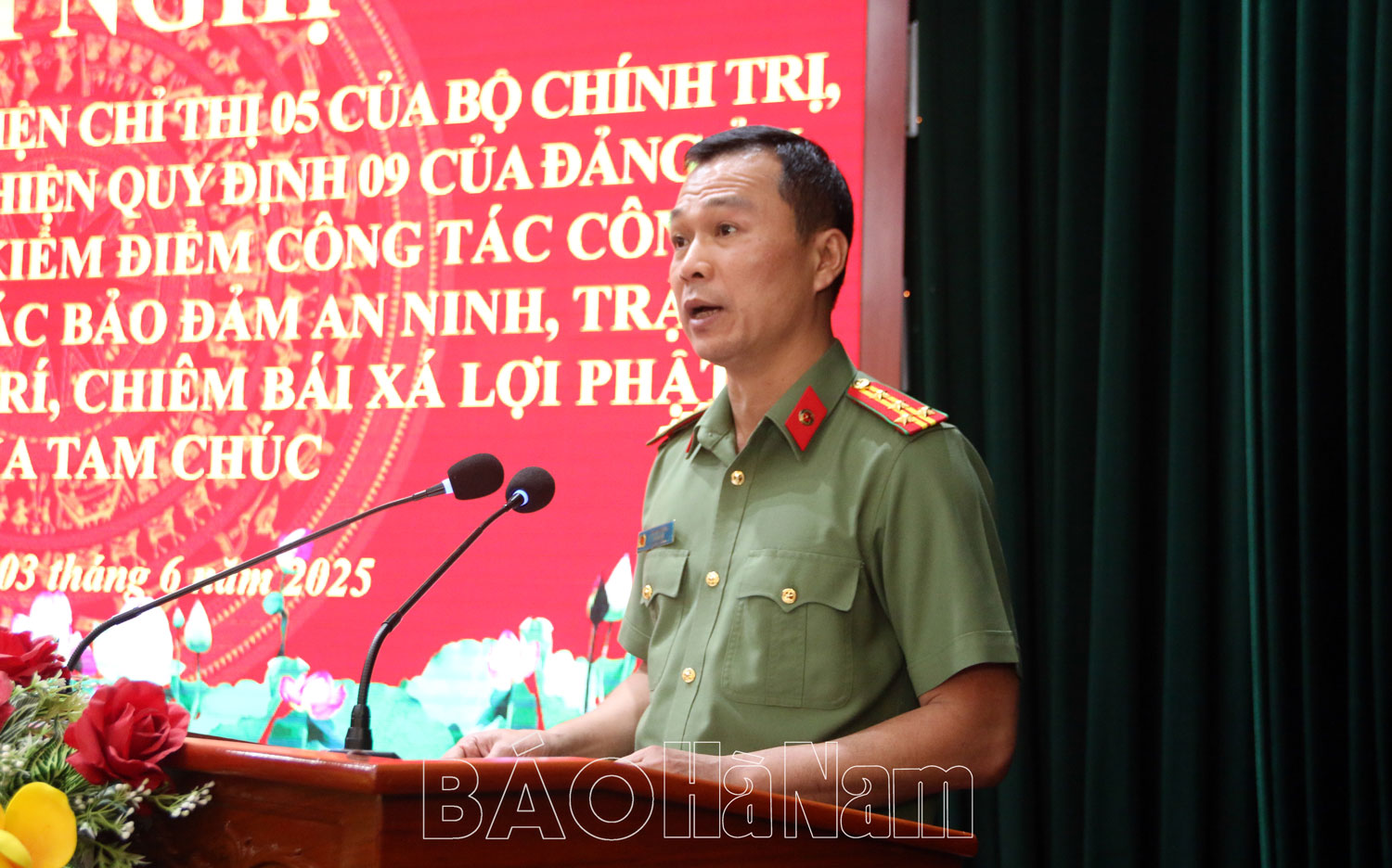 Chiều 3/6, Đảng ủy Công an tỉnh tổ chức hội nghị tổng kết 10 năm thực hiện Chỉ thị 05 - CT/TW của Bộ Chính trị về đẩy mạnh học tập và làm theo tư tưởng, đạo đức, phong cách Hồ Chí Minh; đánh giá 2 năm thực hiện Quy định 09 của Đảng ủy Công an Trung ương về chế độ học tập, thực hiện Sáu điều Bác Hồ dạy Công an nhân dân (CAND) và đánh giá công tác lãnh đạo, chỉ đạo thực hiện nhiệm vụ bảo đảm an ninh trật tự (ANTT) Lễ cung rước, tôn trí, chiêm bái xá lợi Đức Phật và Đại lễ Phật đản tại chùa Tam Chúc. Dự hội nghị có các đồng chí: Đinh Thị Lụa, Phó Bí thư Thường trực Tỉnh ủy; Nguyễn Anh Chức, Ủy viên Ban Thường vụ (BTV) Tỉnh ủy, Phó Chủ tịch Thường trực UBND tỉnh; Đại tá Tô Anh Dũng, Ủy viên BTV Tỉnh ủy, Bí thư Đảng ủy, Giám đốc Công an tỉnh.