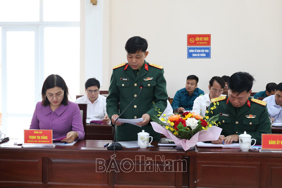 Đại diện lãnh đạo ĐUQS thị xã Duy Tiên trình bày dự thảo Nghị quyết lãnh đạo thực hiện nhiệm vụ năm 2025.