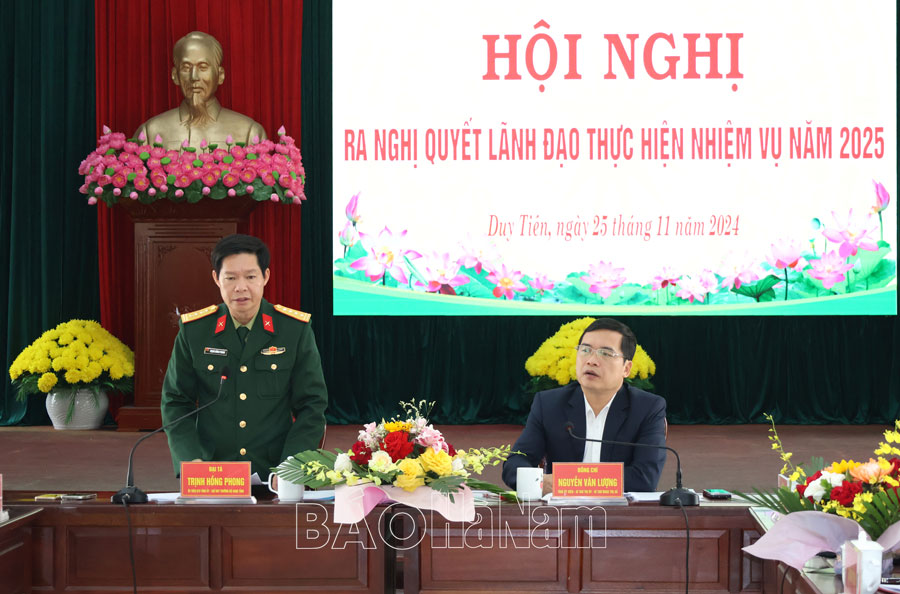 Sáng 25/11, Đảng ủy Quân sự (ĐUQS) thị xã Duy Tiên tổ chức hội nghị ra nghị quyết lãnh đạo thực hiện nhiệm vụ quốc phòng, quân sự địa phương (QP, QSĐP) năm 2025. Đại tá Trịnh Hồng Phong, Ủy viên Ban Thường vụ Tỉnh ủy, Phó Bí thư ĐUQS tỉnh, Chỉ huy trưởng Bộ CHQS tỉnh dự, chỉ đạo hội nghị.