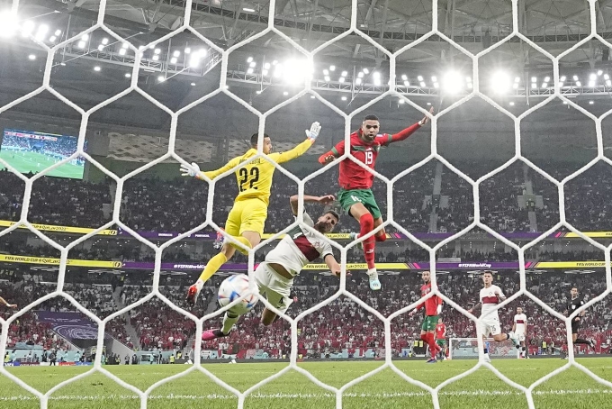 Youssef En-Nesyri (số 19) đánh đầu ghi bàn ở phút 42 trận tứ kết World Cup 2022 trên sân Al Thumama.