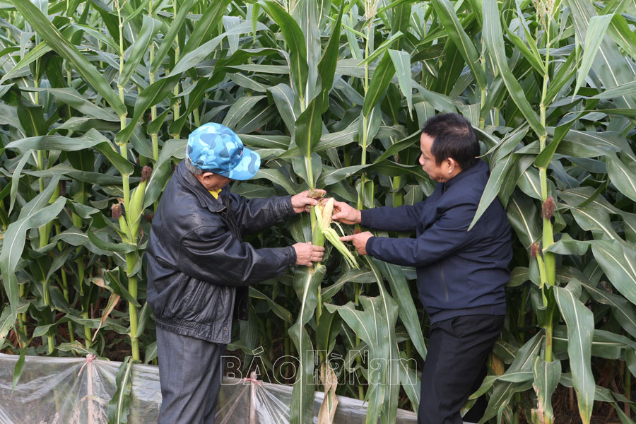 Kiểm tra chất lượng bắp ngô sinh khối tại mô hình sán xuất ở Mộc Bắc.