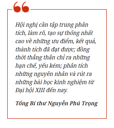 Tổng Bí thư mong Trung ương chú ý gắn việc kiểm điểm sự lãnh đạo, chỉ đạo của Bộ Chính trị, Ban Bí thư với đánh giá việc triển khai thực hiện Nghị quyết Đại hội XIII trong bối cảnh, tình hình trong nước và thế giới có nhiều khó khăn, thách thức mới xuất hiện và phức tạp, nặng nề hơn. Hội nghị cần tập trung phân tích, làm rõ, tạo sự thống nhất cao về những ưu điểm, kết quả, thành tích đã đạt được; đồng thời thẳng thắn chỉ ra những hạn chế, yếu kém; phân tích những nguyên nhân và rút ra những bài học kinh nghiệm từ Đại hội XIII đến nay. Đồng thời phân tích, dự báo một cách có cơ sở khoa học về bối cảnh, tình hình mới, để từ đó đề xuất những chủ trương, quyết sách lớn và những nhiệm vụ trọng tâm, giải pháp chủ yếu cần phải tập trung quyết liệt lãnh đạo, chỉ đạo thực hiện trong nửa cuối của nhiệm kỳ khóa XIII, góp phần thực hiện thắng lợi Nghị quyết Đại hội XIII của Đảng.