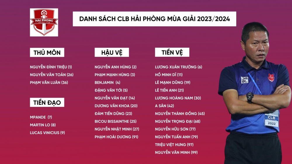Ngoài các ngoại binh, Hải Phòng FC cũng sở hữu dàn cầu thủ nội tương đối chất lượng. Với tài cầm quân của HLV Chu Đình Nghiêm, đội bóng đất cảng được kỳ vọng sẽ nằm trong nhóm đua vô địch tại V-League 2023/2024 và tiến sâu tại AFC Cup.