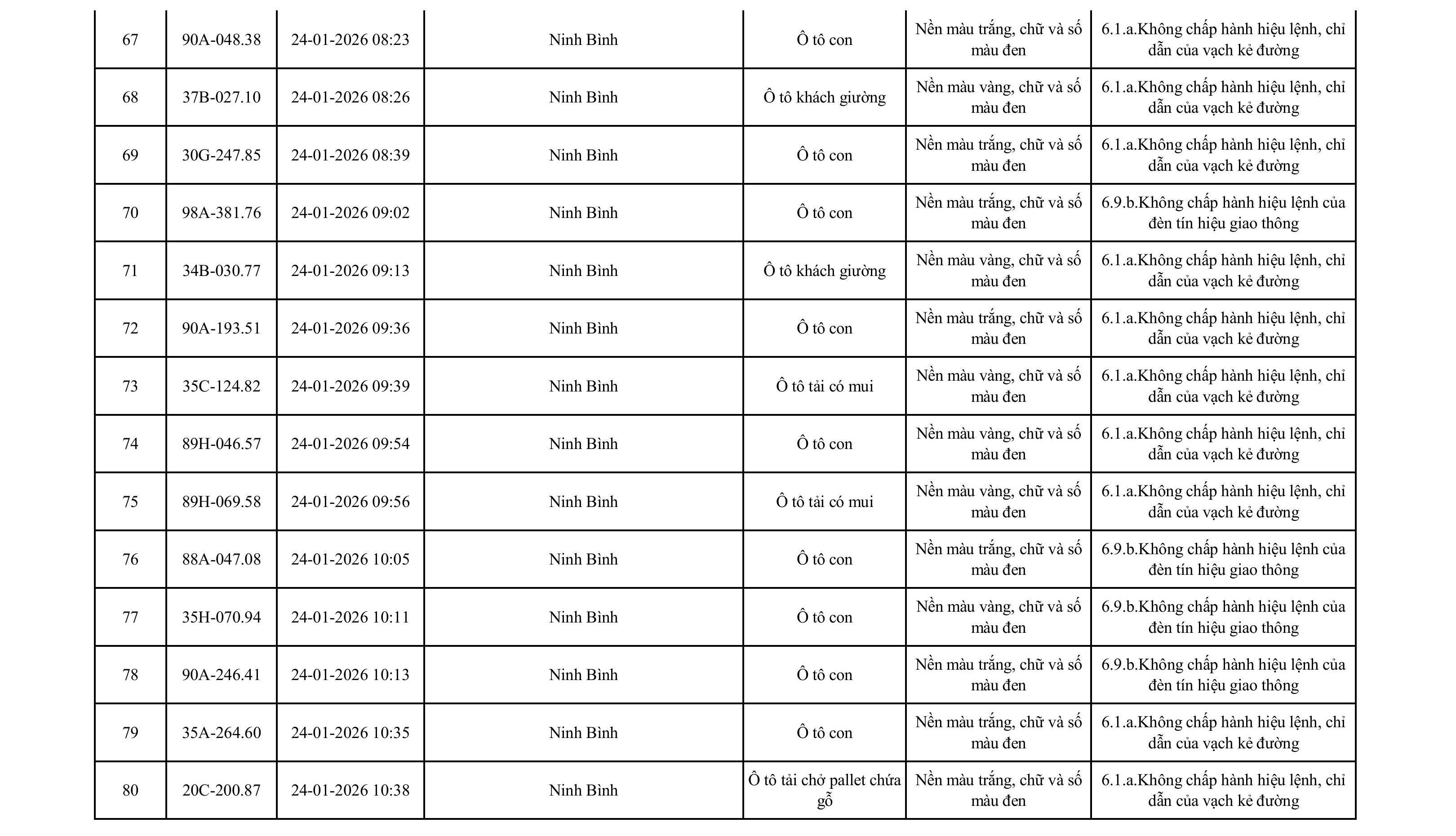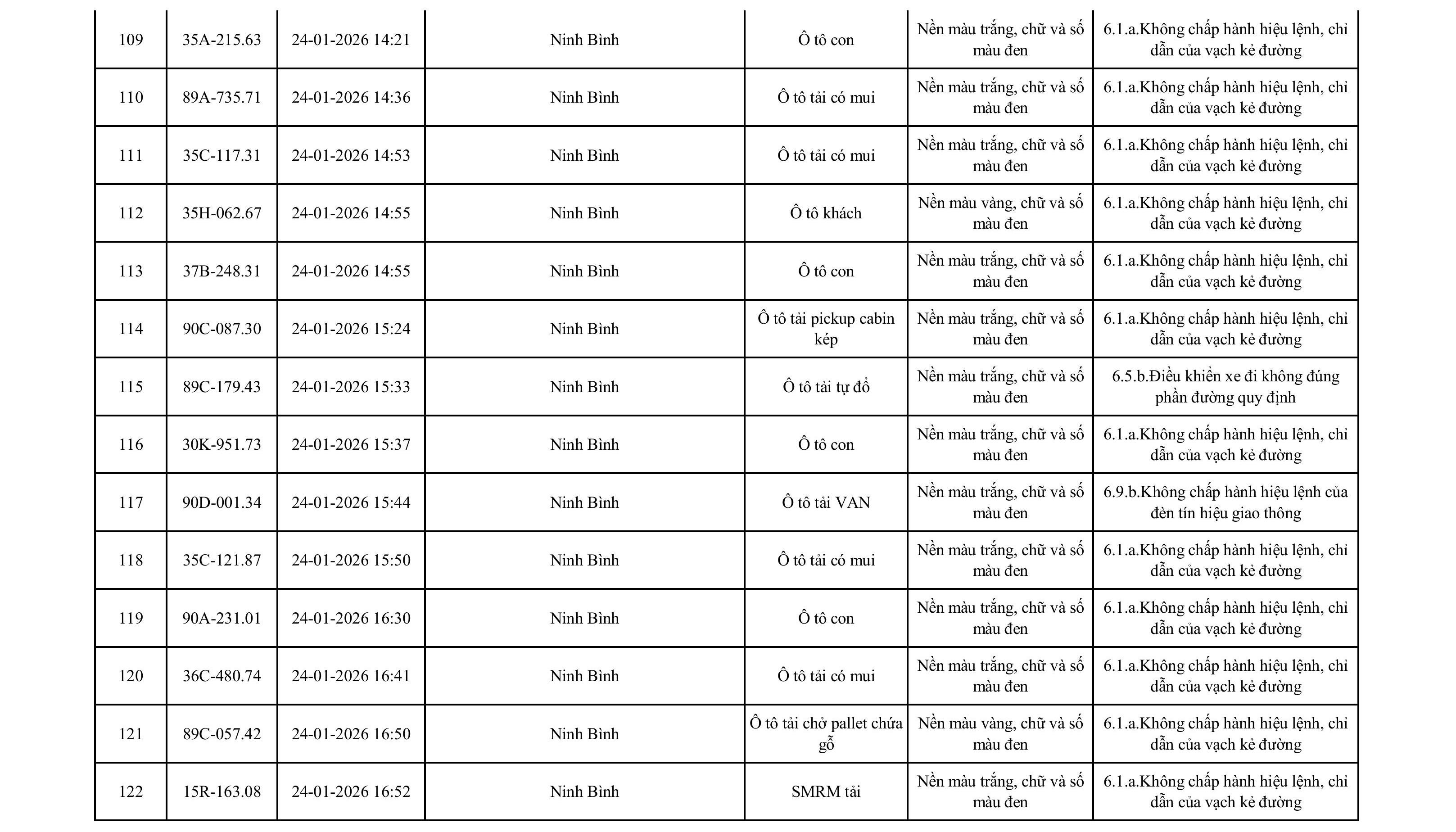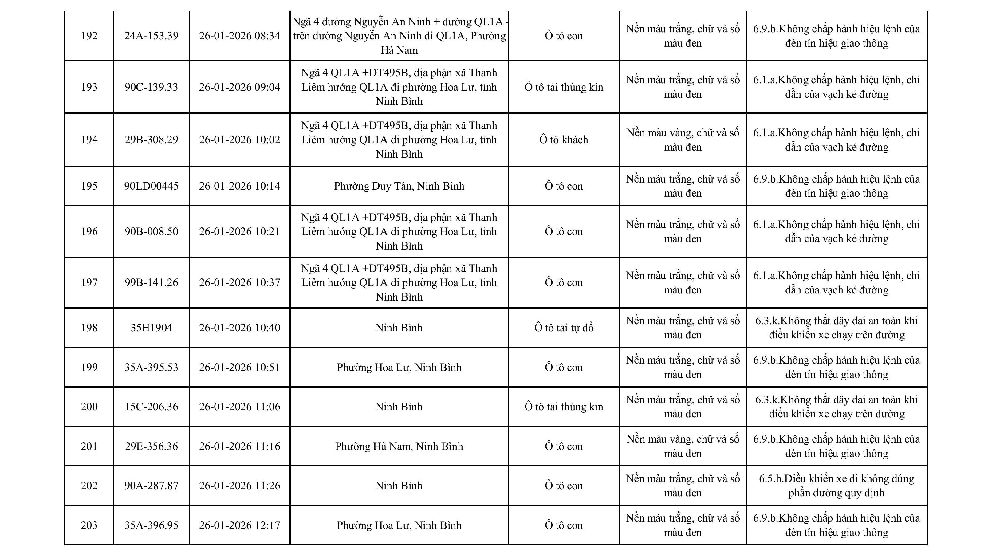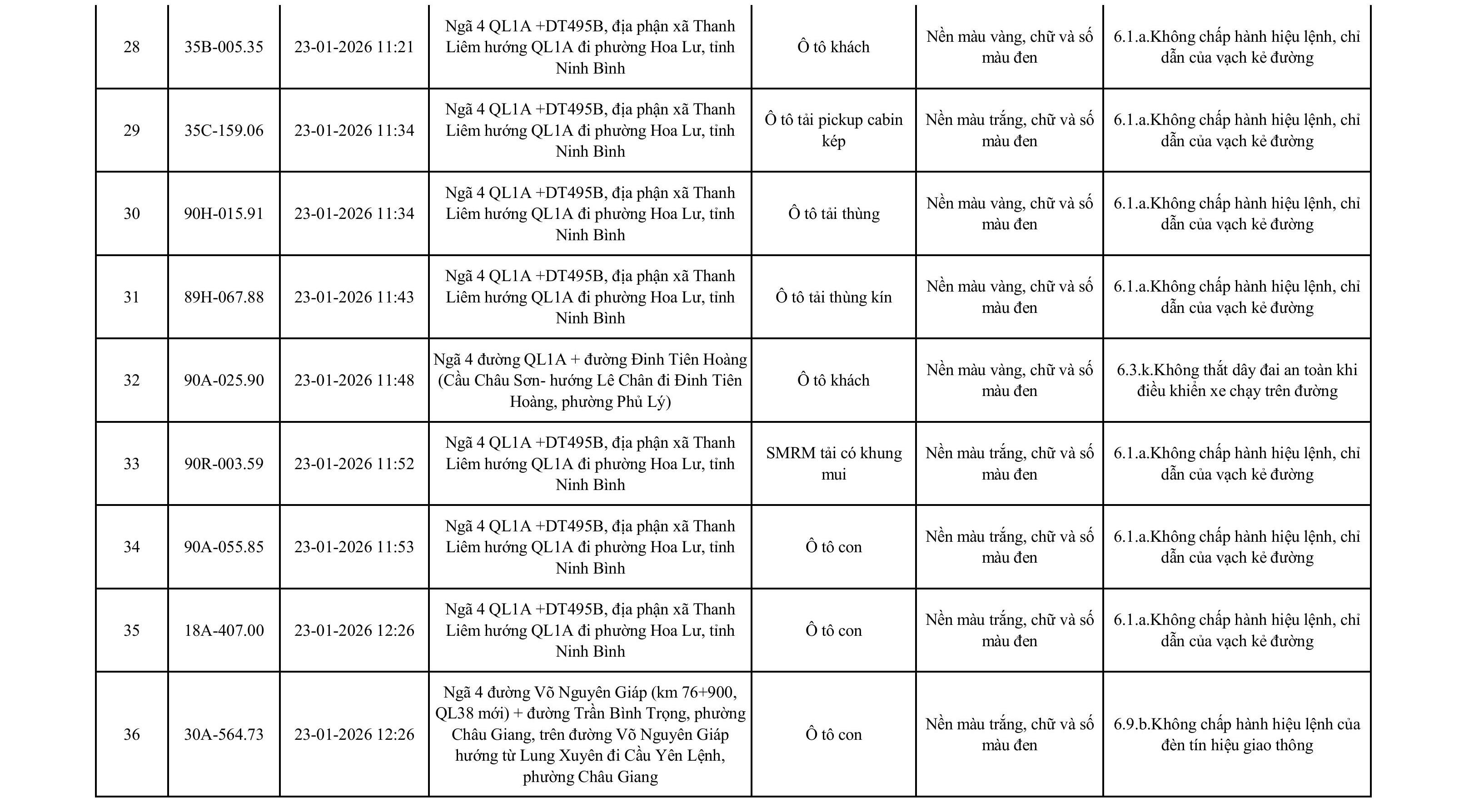Danh sách phương tiện vi phạm được phát hiện qua hệ thống giám sát và thiết bị nghiệp vụ tuần thứ tư tháng 1/2026
