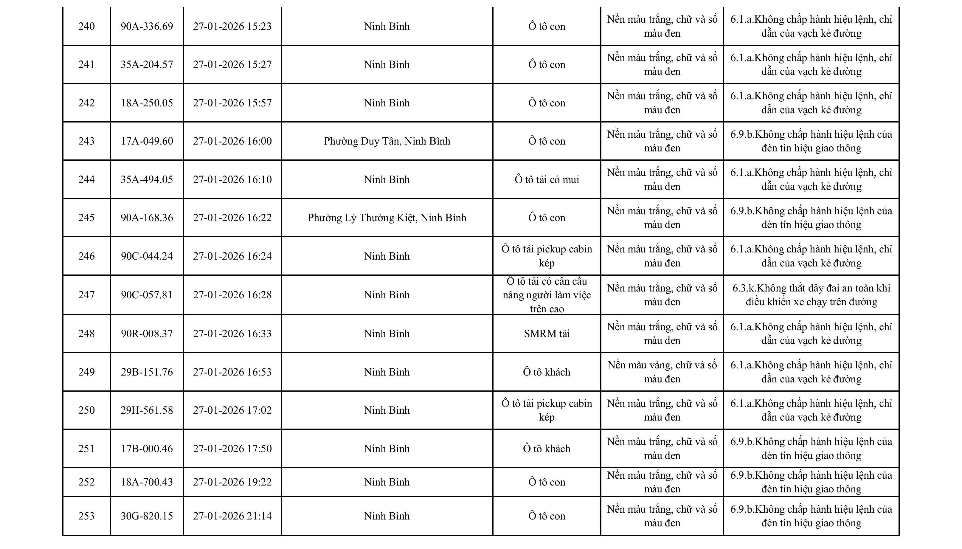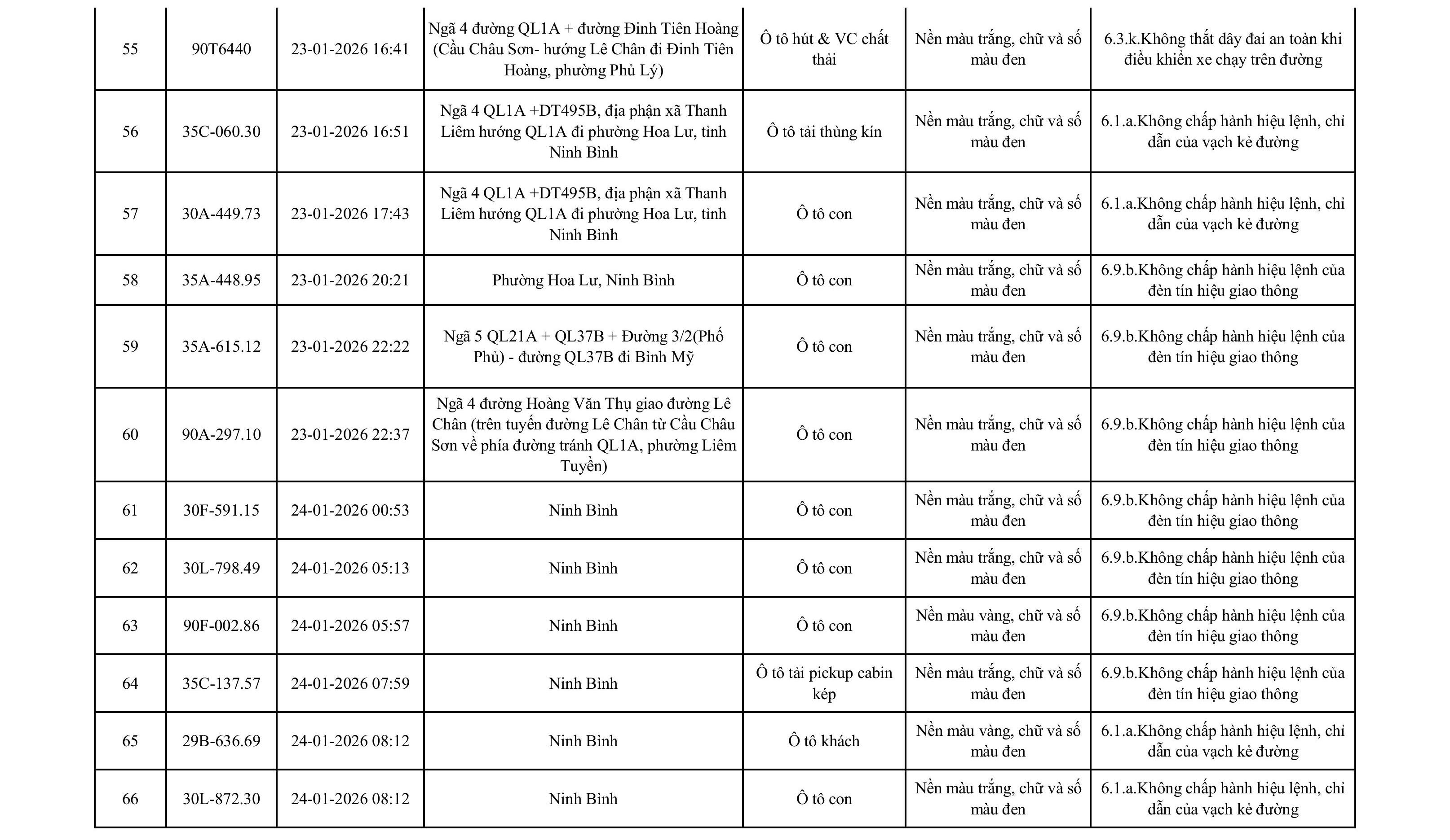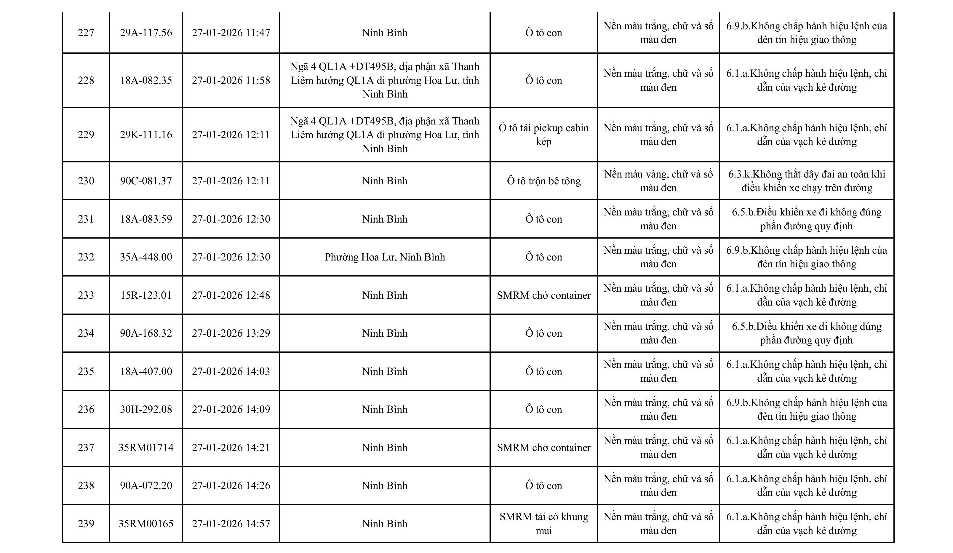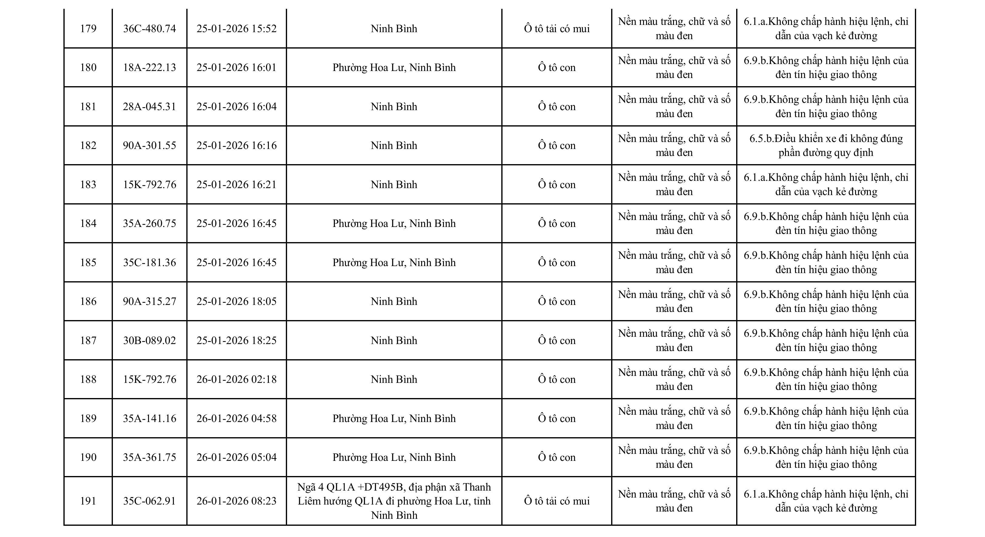 Danh sách phương tiện vi phạm được phát hiện qua hệ thống giám sát và thiết bị nghiệp vụ tuần thứ tư tháng 1/2026