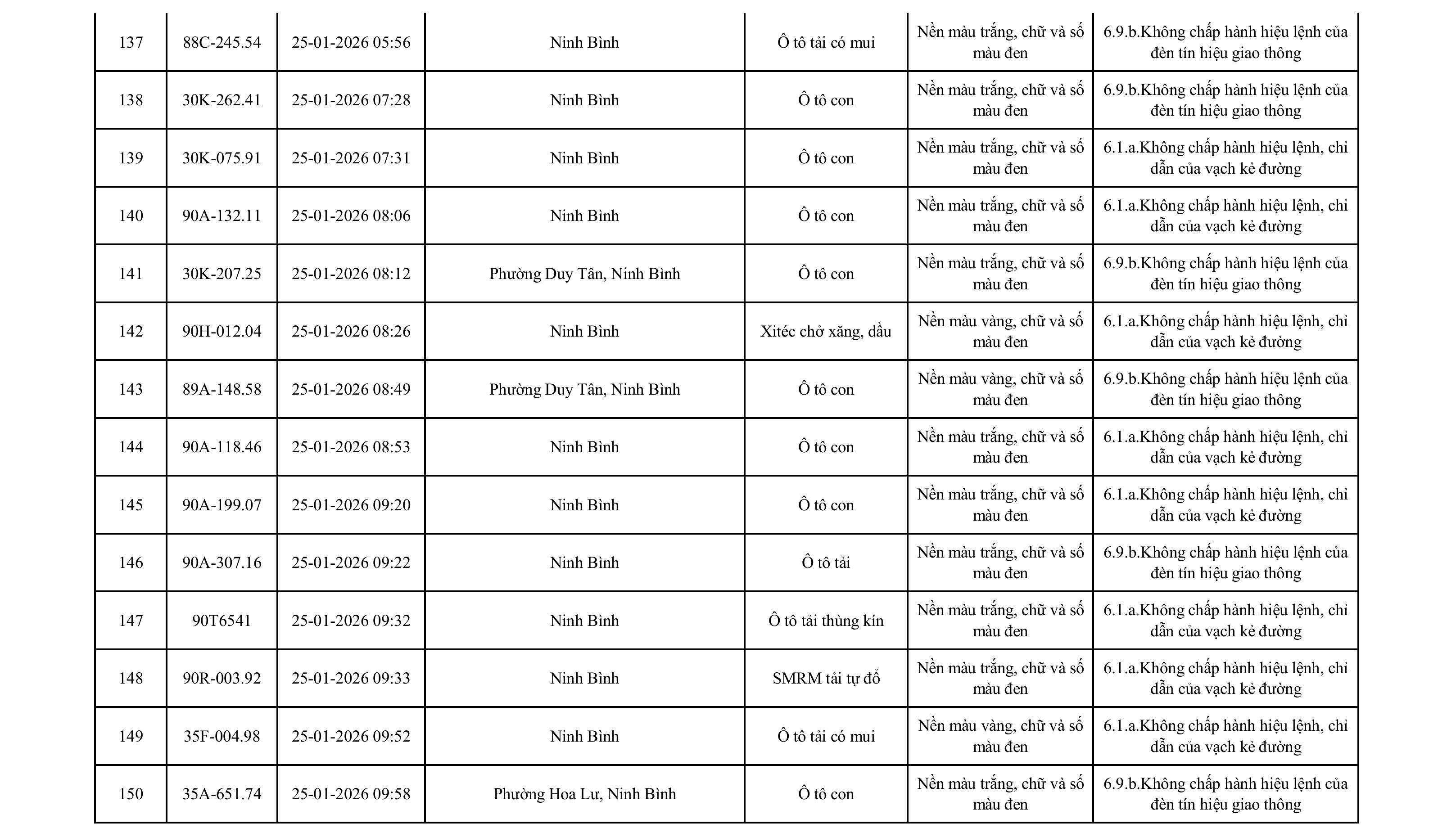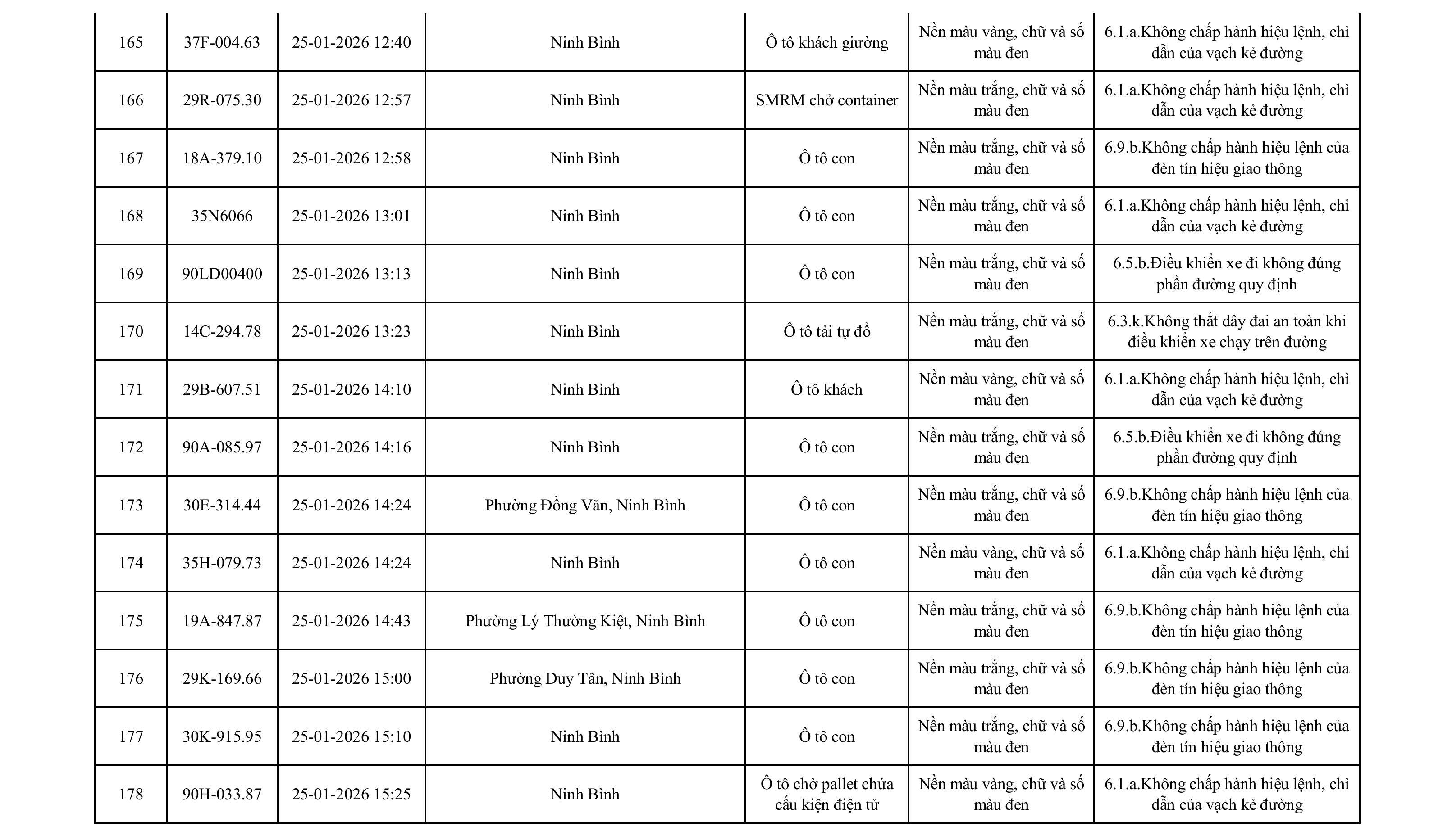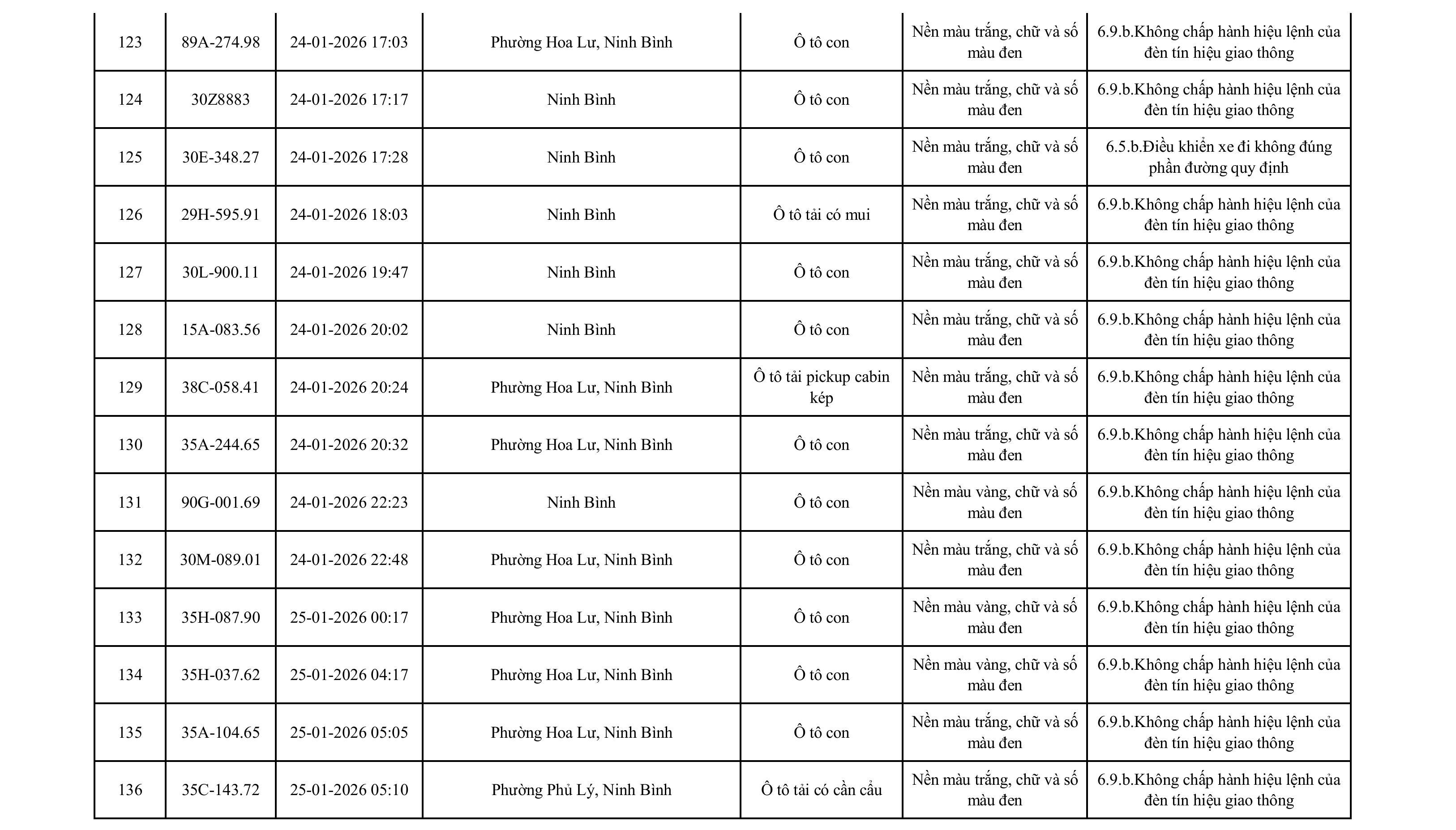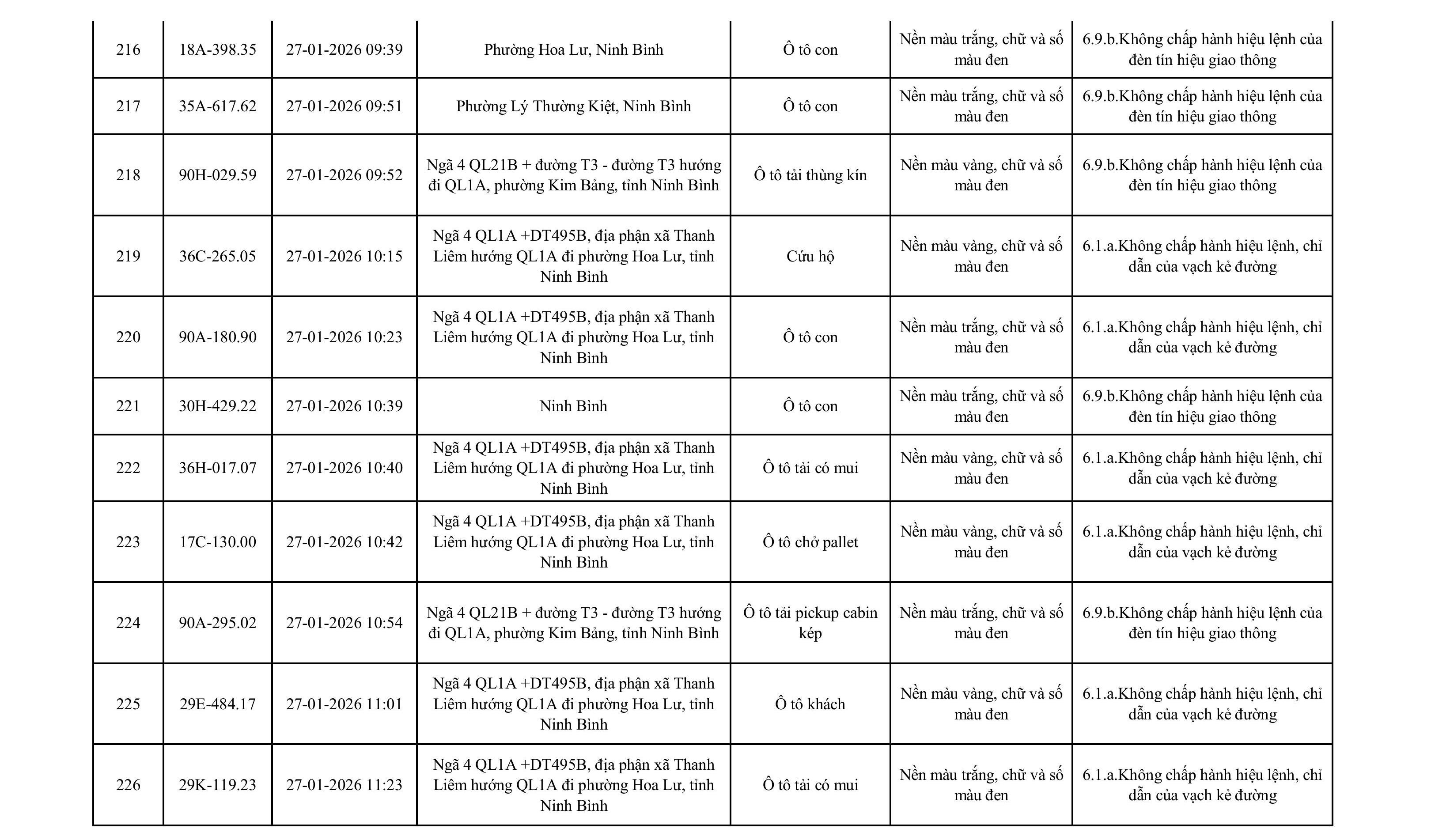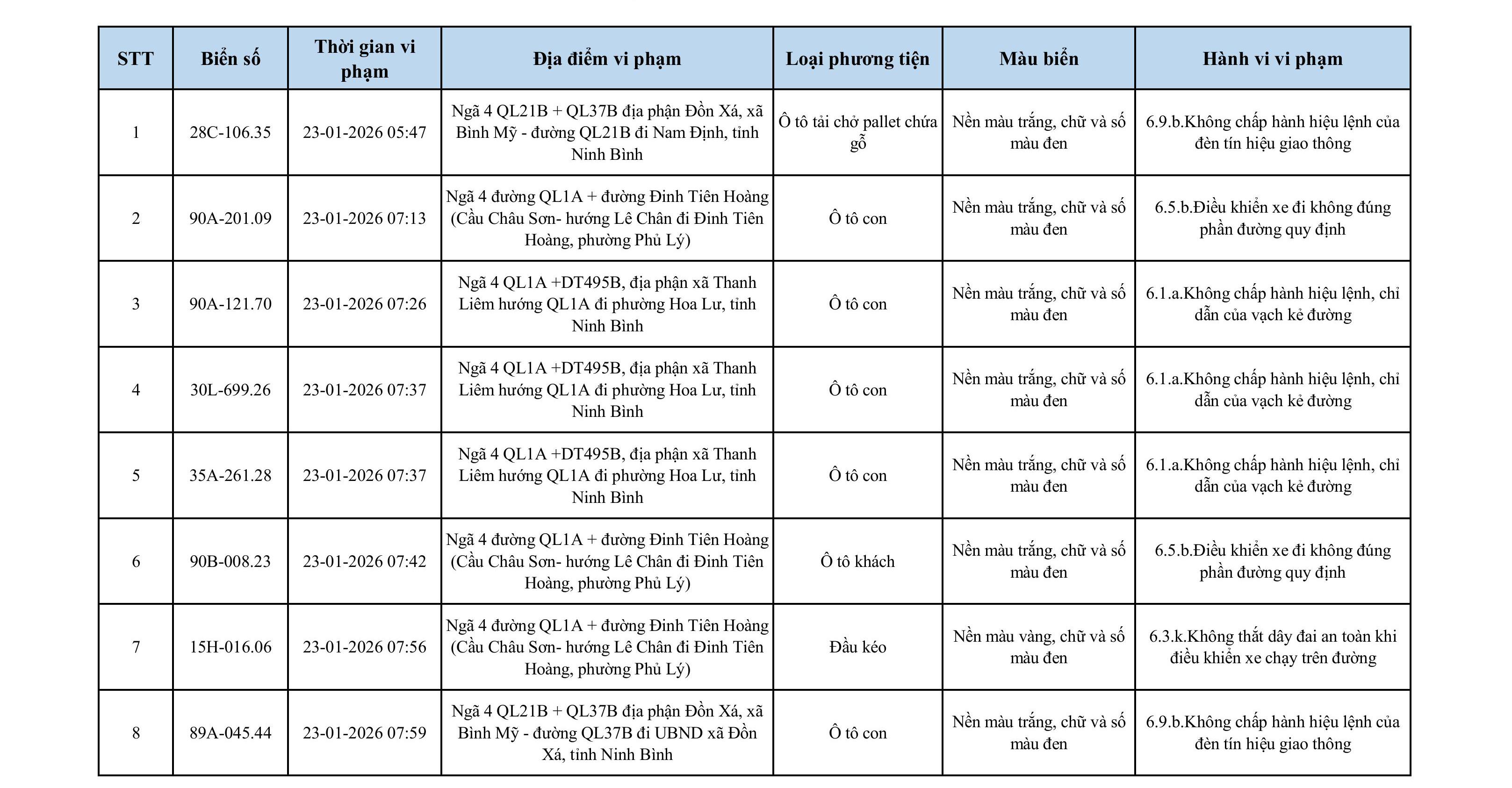 Danh sách phương tiện vi phạm được phát hiện qua hệ thống giám sát và thiết bị nghiệp vụ tuần thứ tư tháng 1/2026