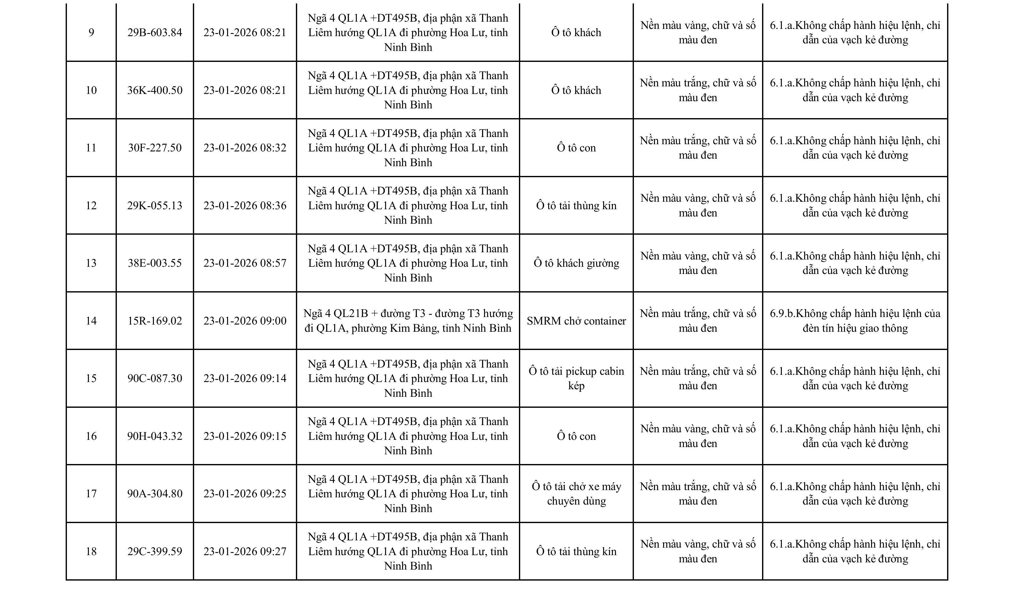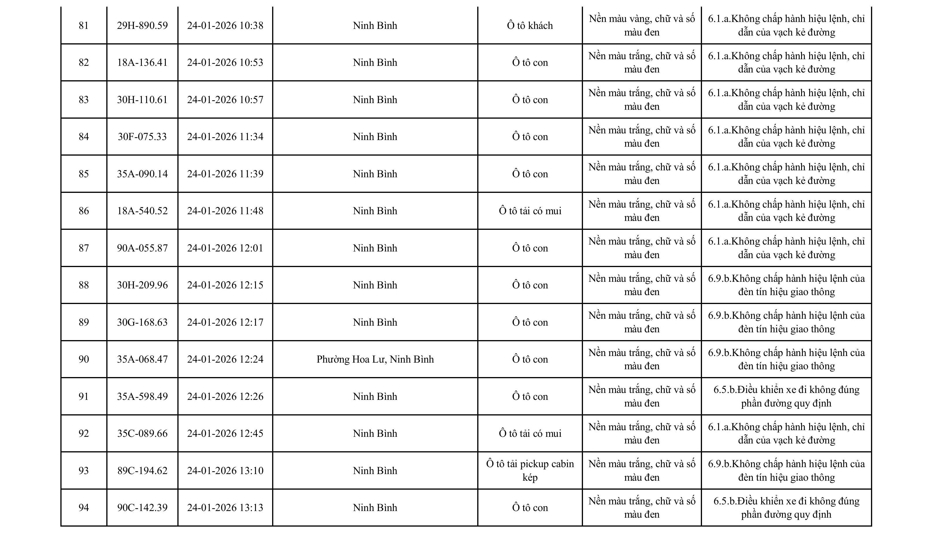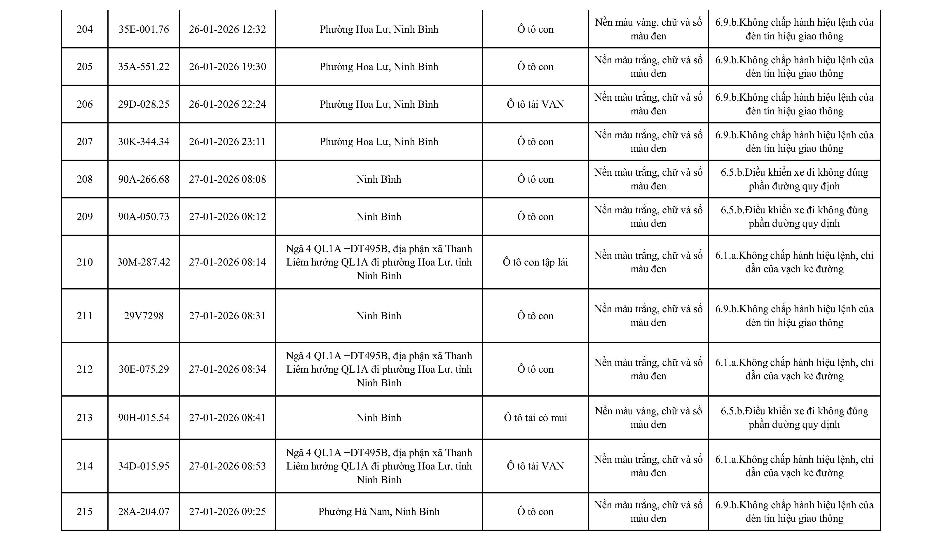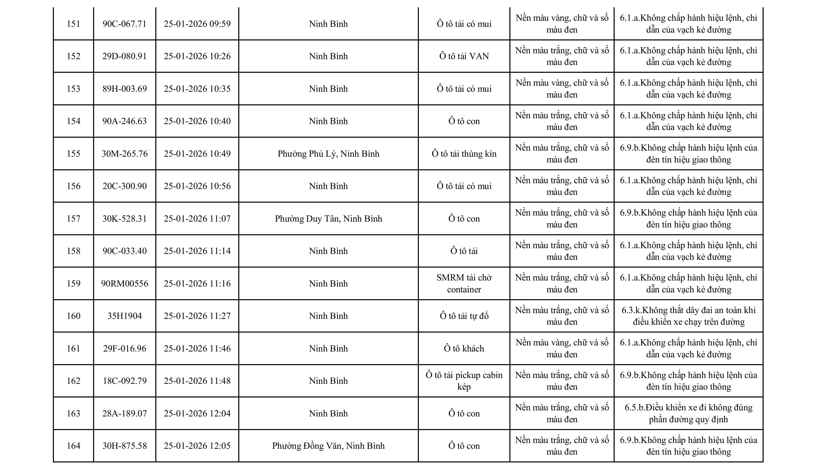 Danh sách phương tiện vi phạm được phát hiện qua hệ thống giám sát và thiết bị nghiệp vụ tuần thứ tư tháng 1/2026