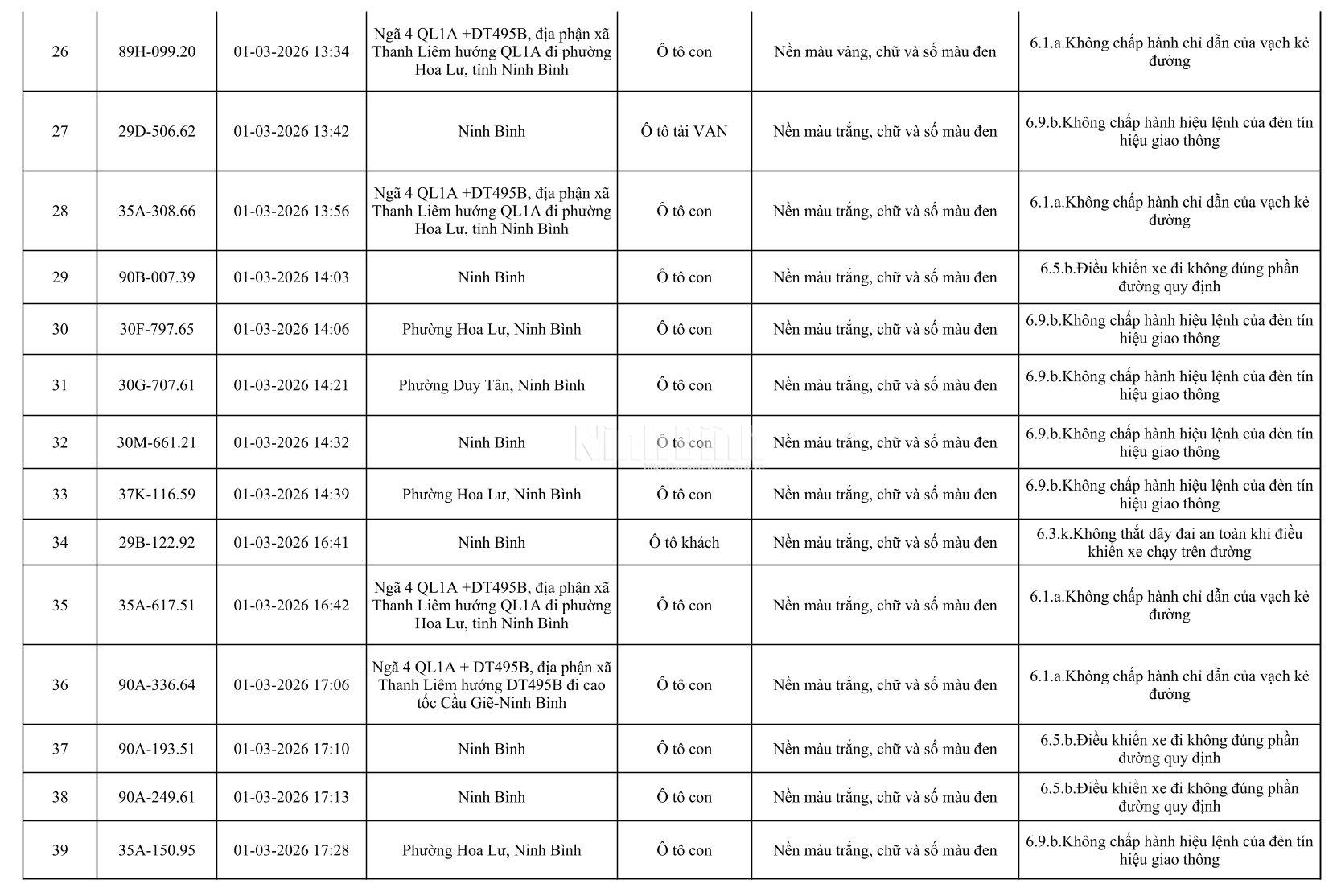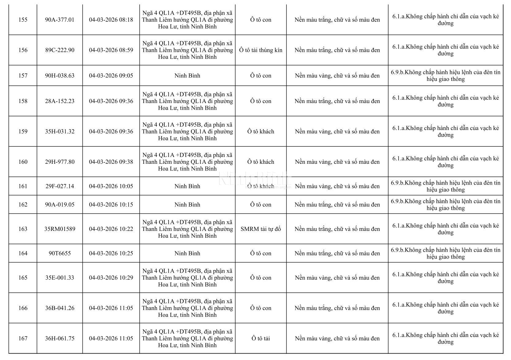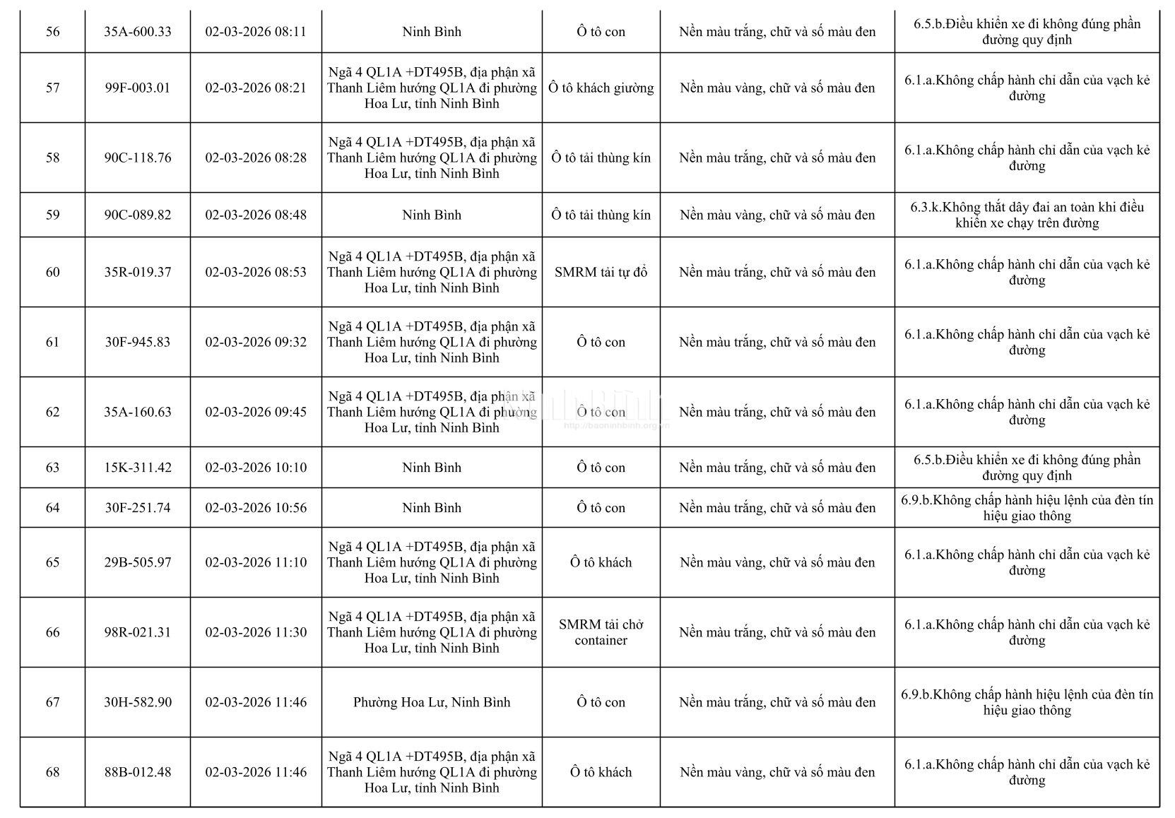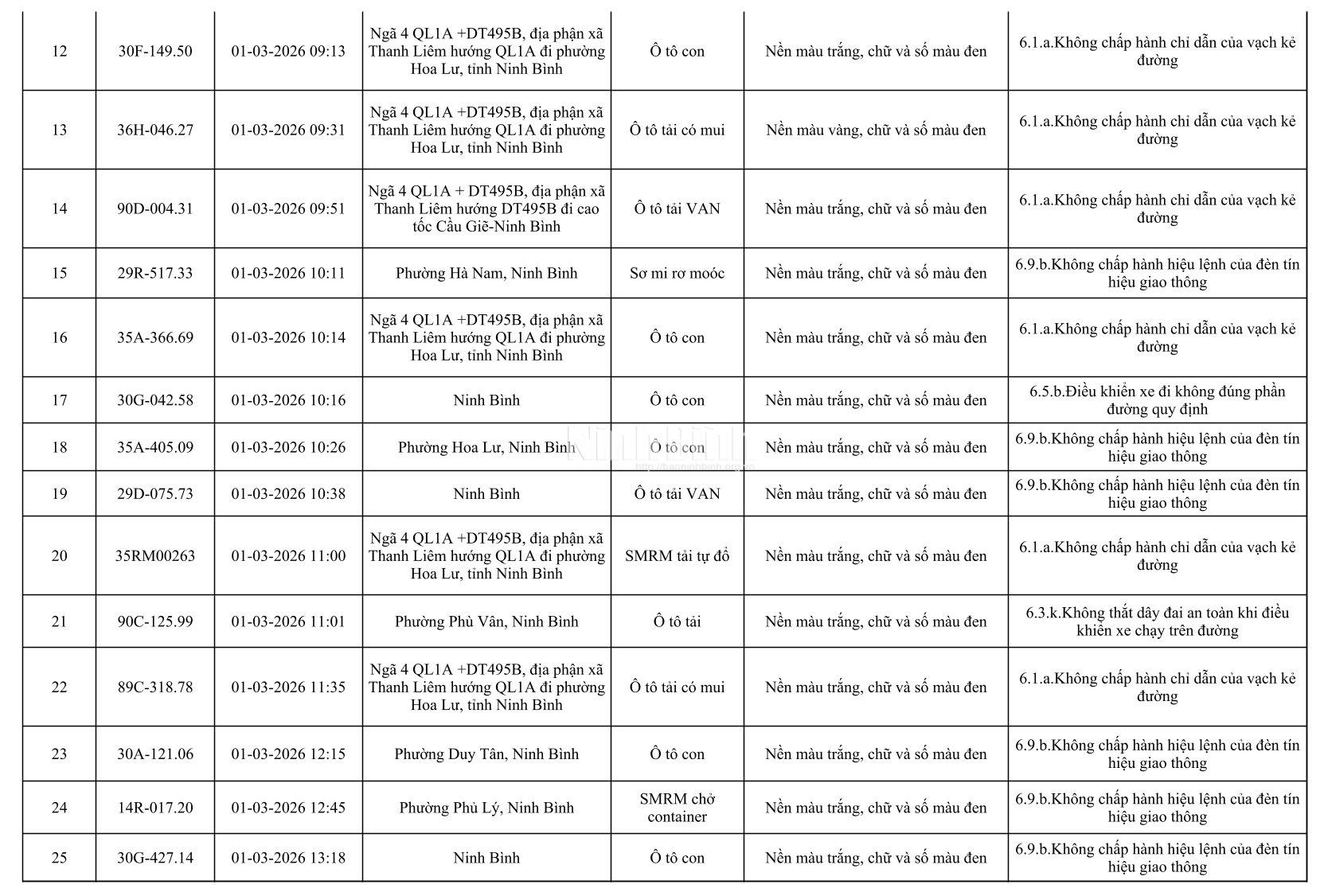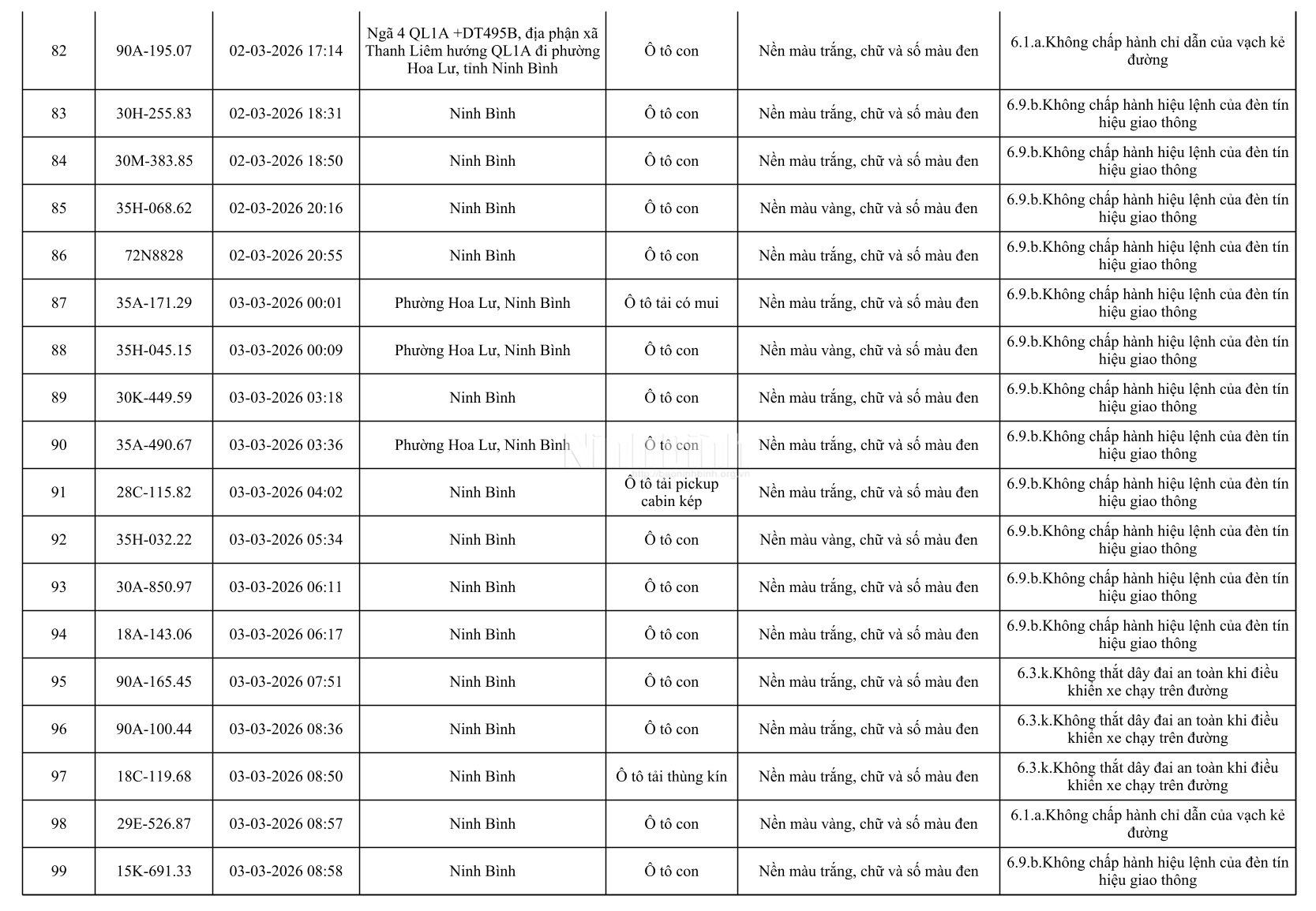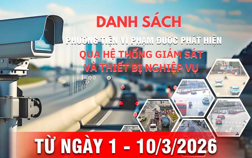 Danh sách phương tiện vi phạm giao thông được phát hiện qua hệ thống giám sát và thiết bị nghiệp vụ từ ngày 1-10/3/2026