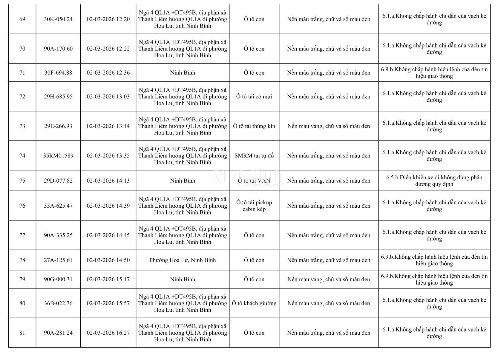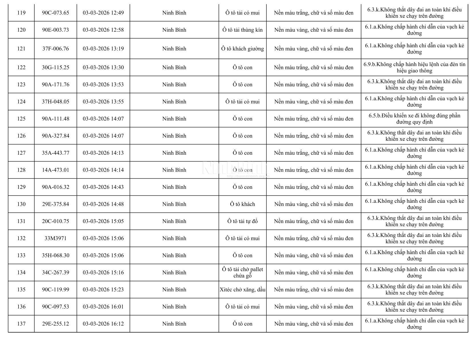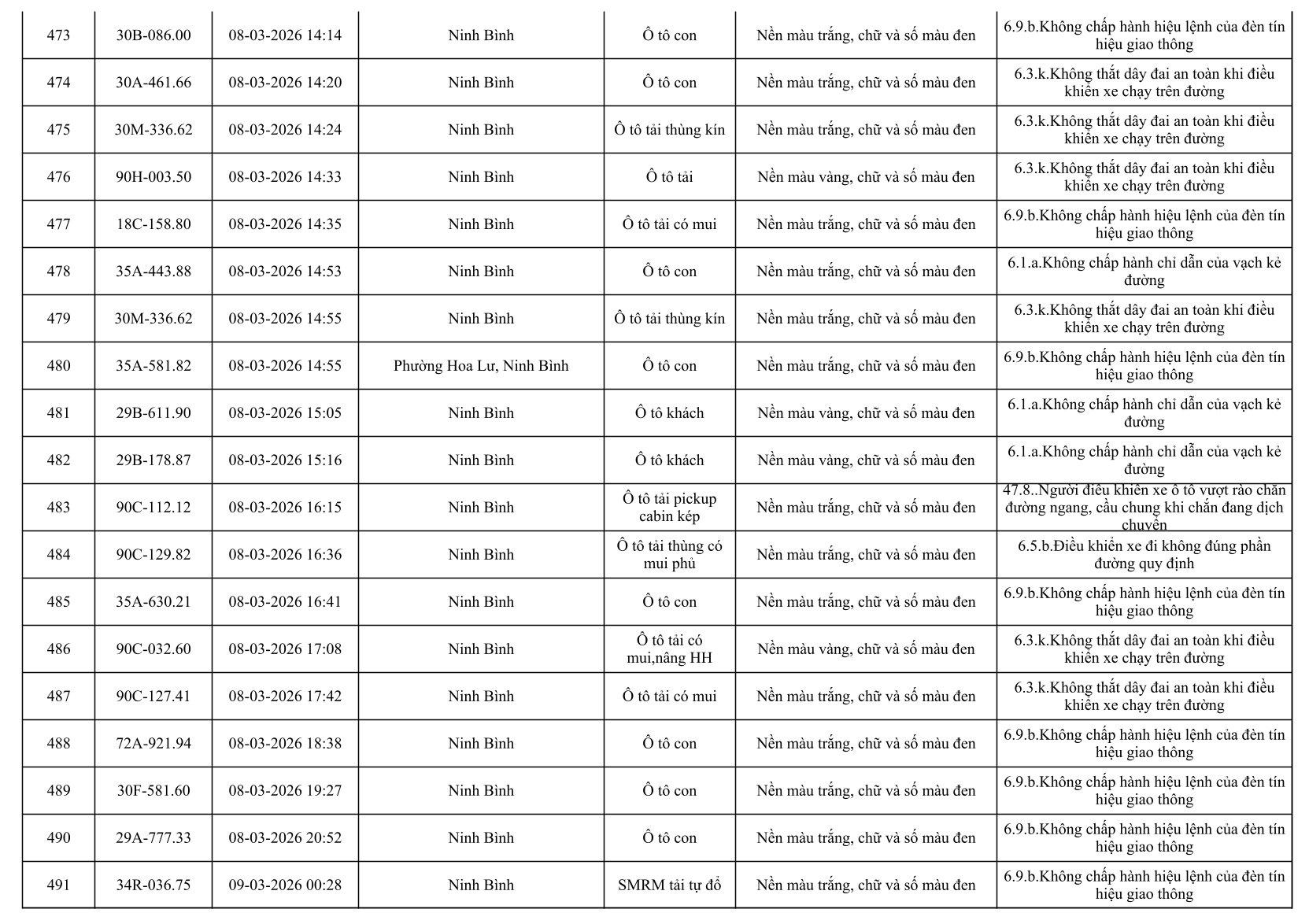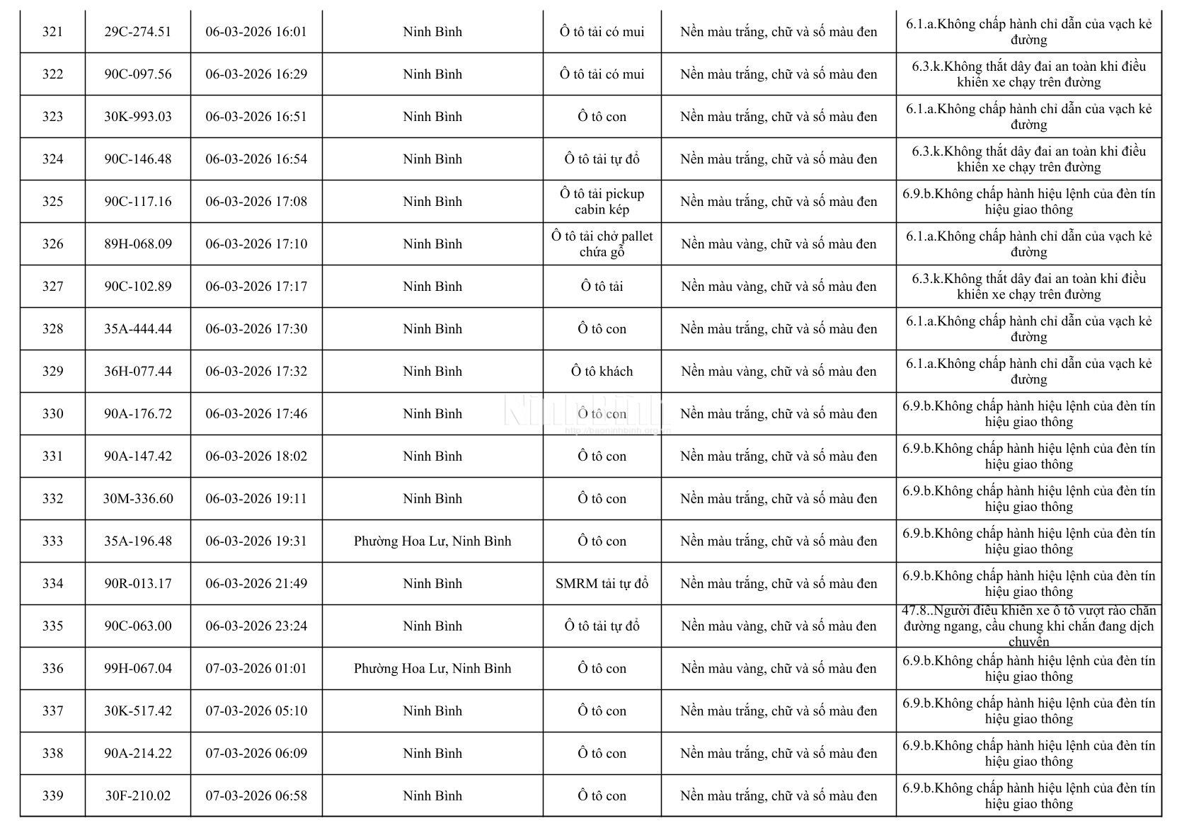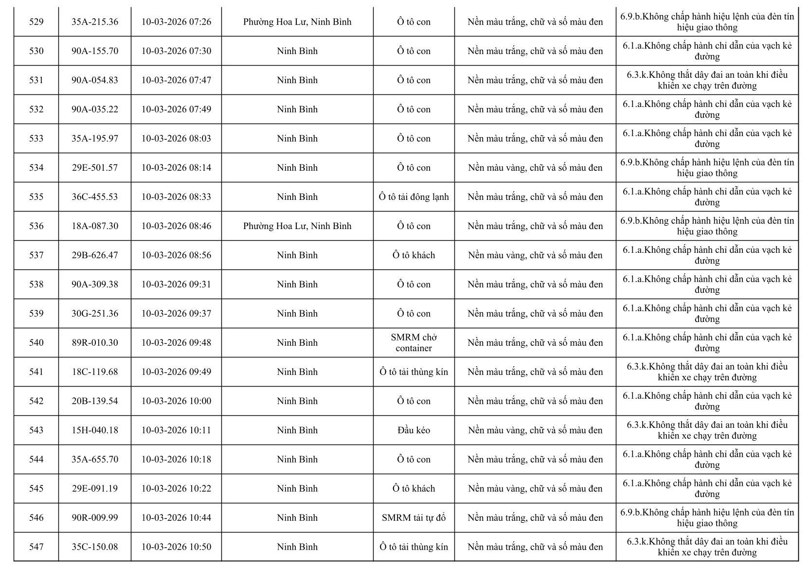 Danh sách phương tiện vi phạm giao thông được phát hiện qua hệ thống giám sát và thiết bị nghiệp vụ từ ngày 1-10/3/2026