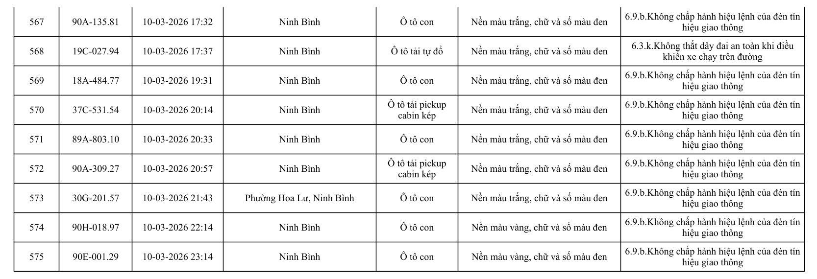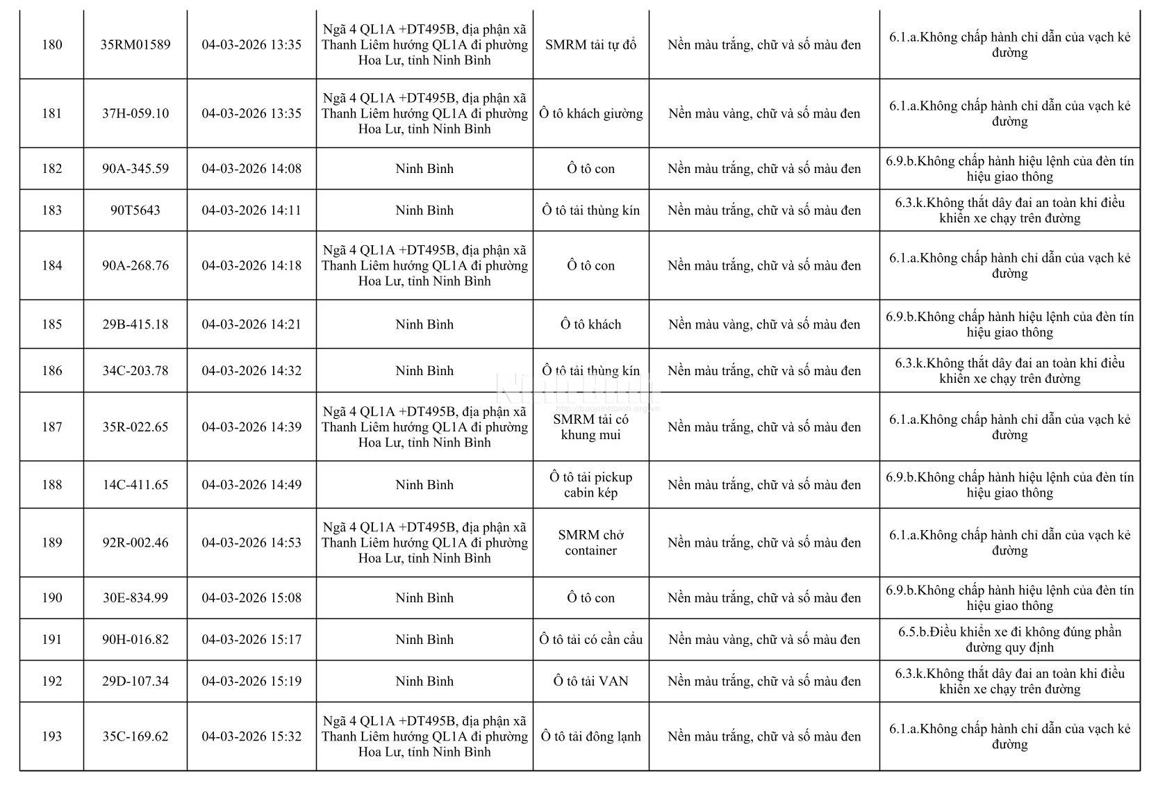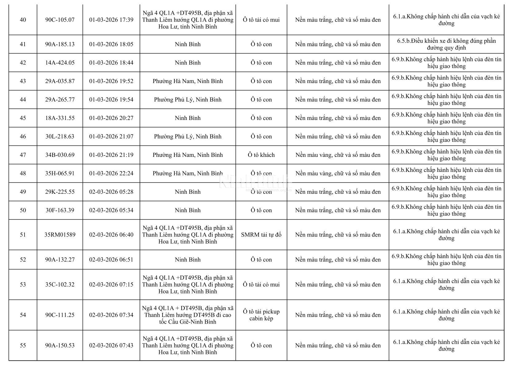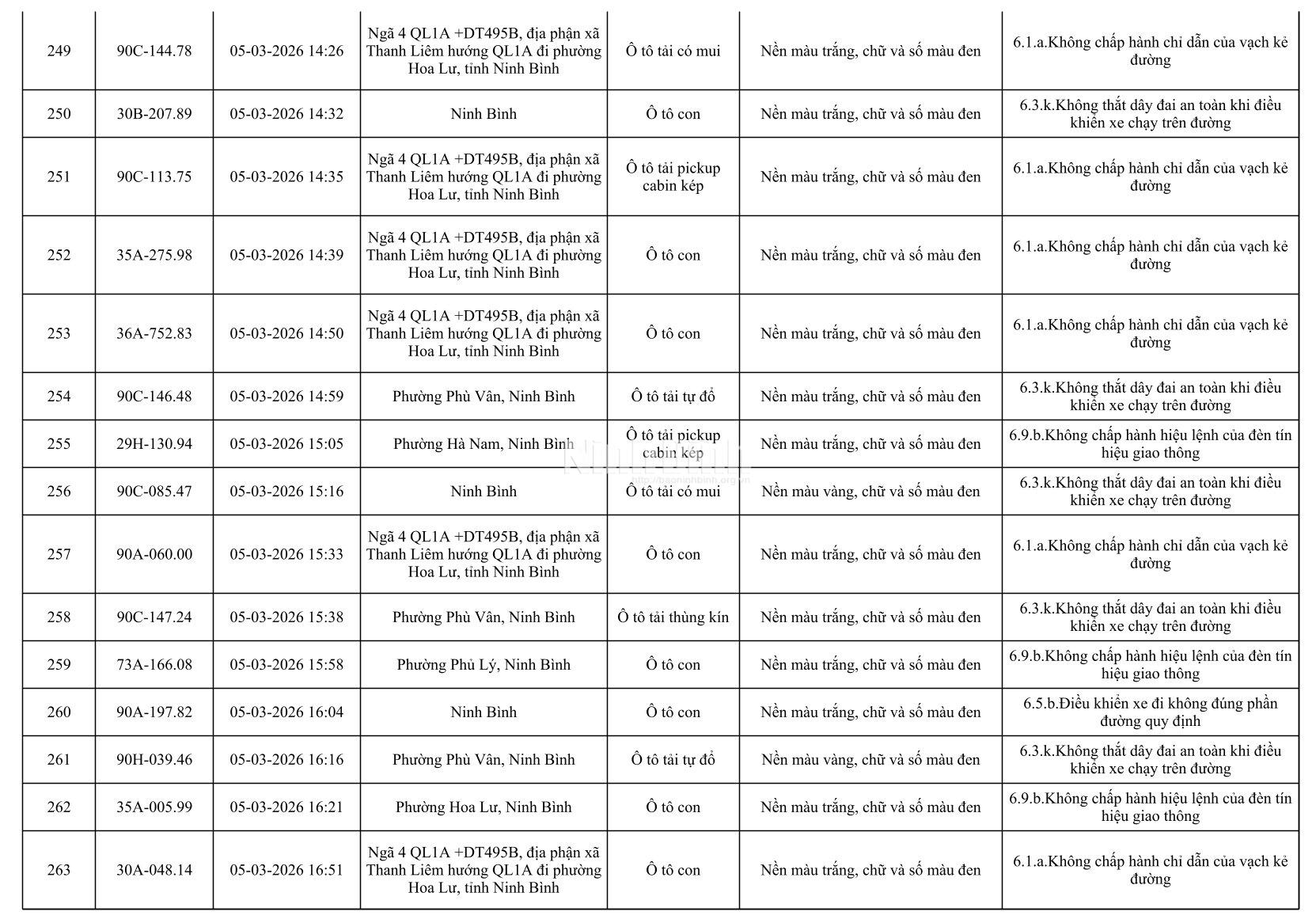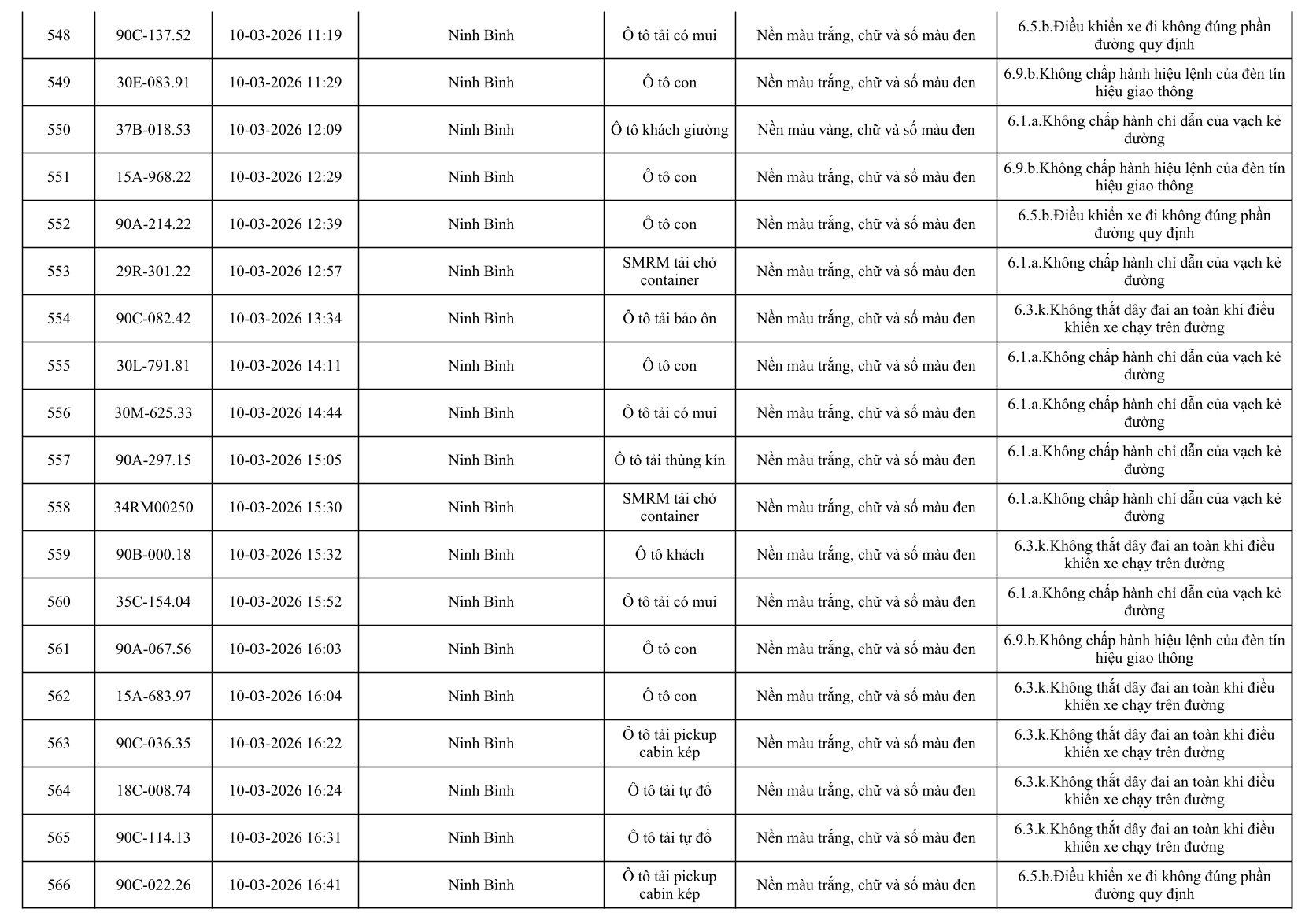 Danh sách phương tiện vi phạm giao thông được phát hiện qua hệ thống giám sát và thiết bị nghiệp vụ từ ngày 1-10/3/2026