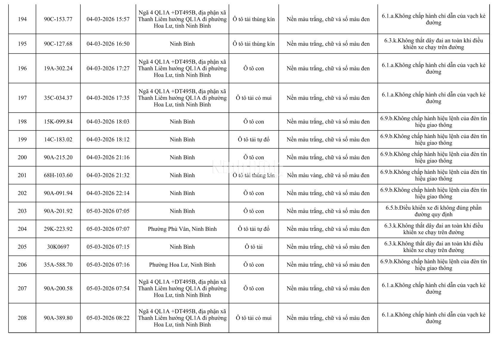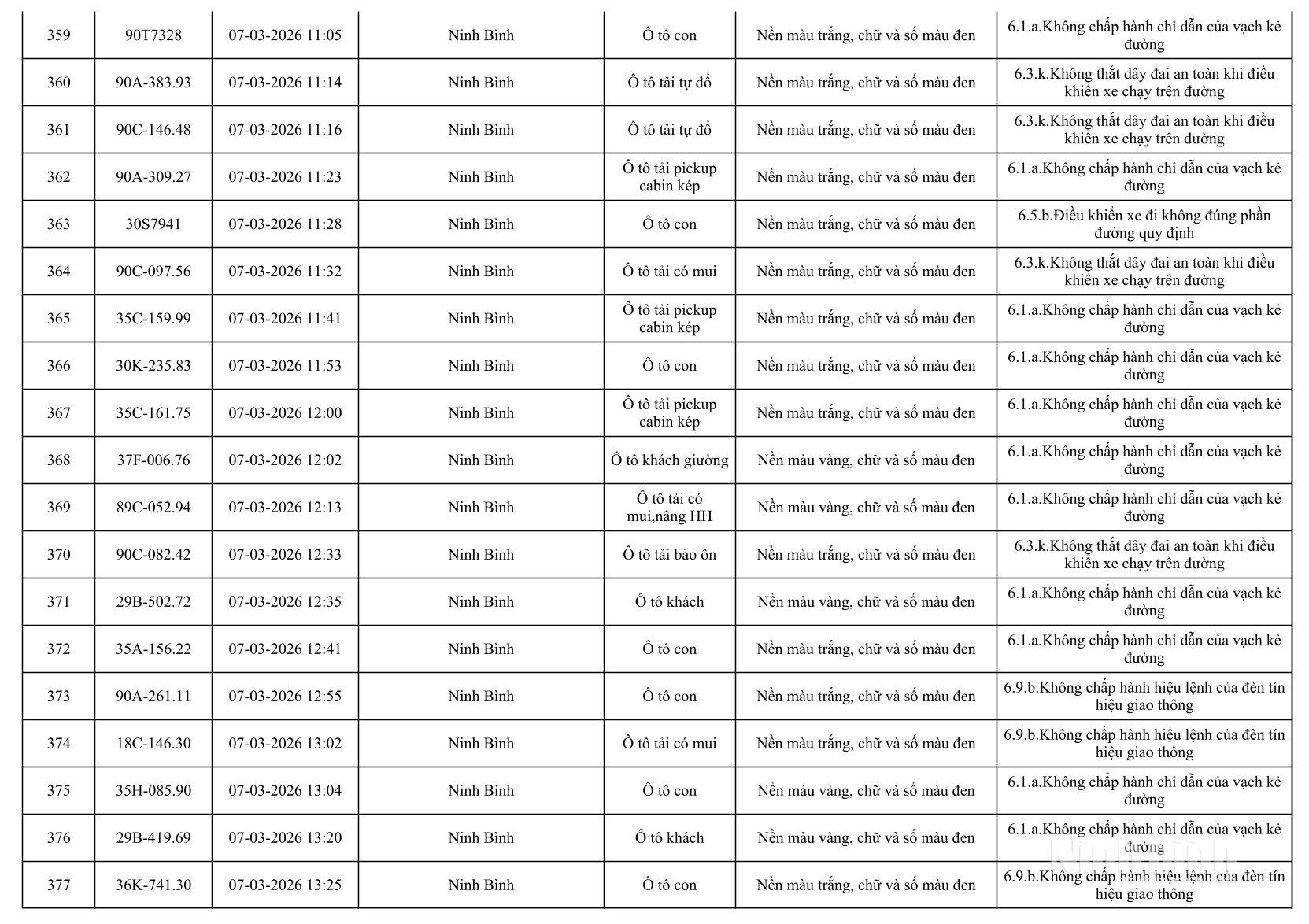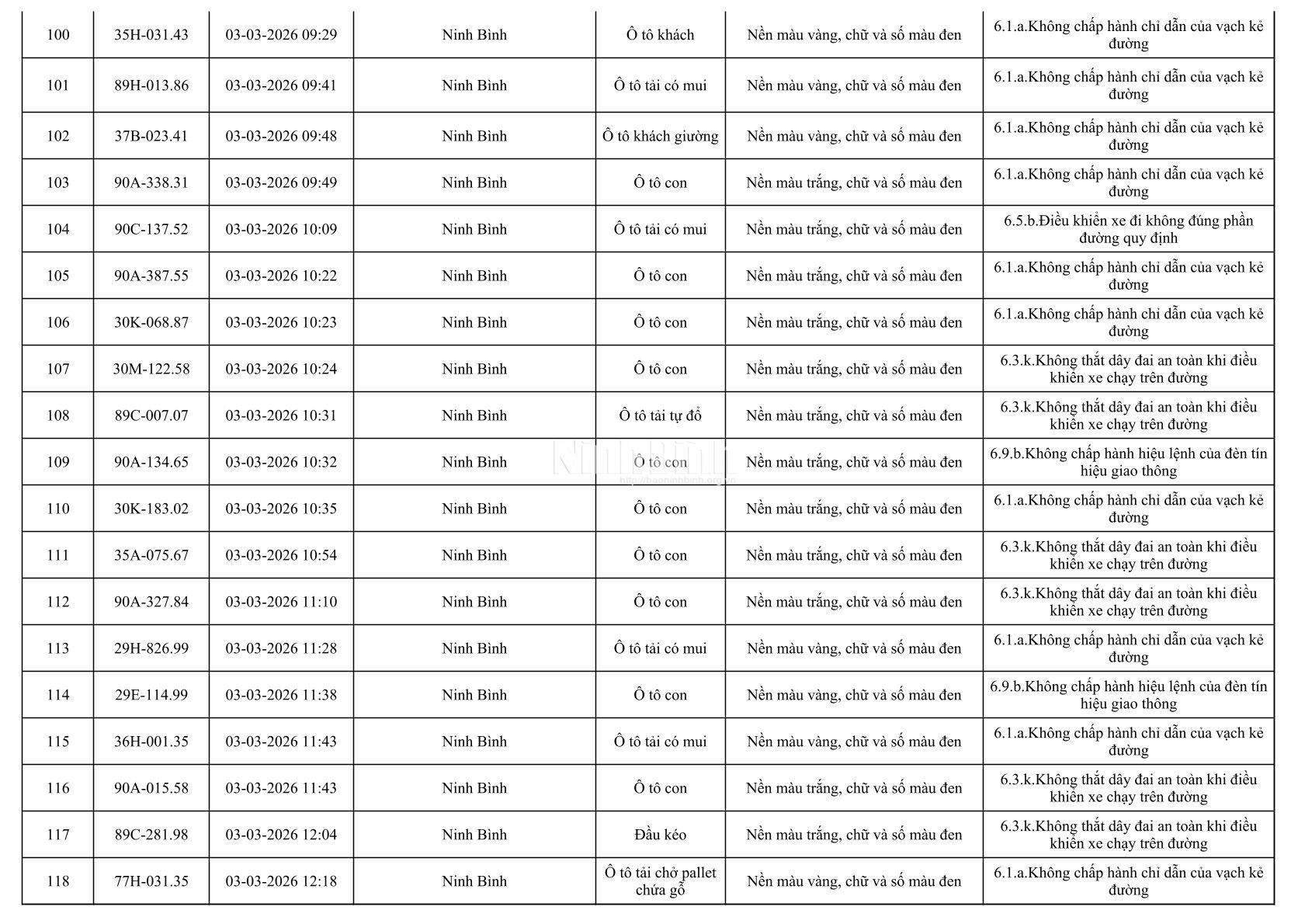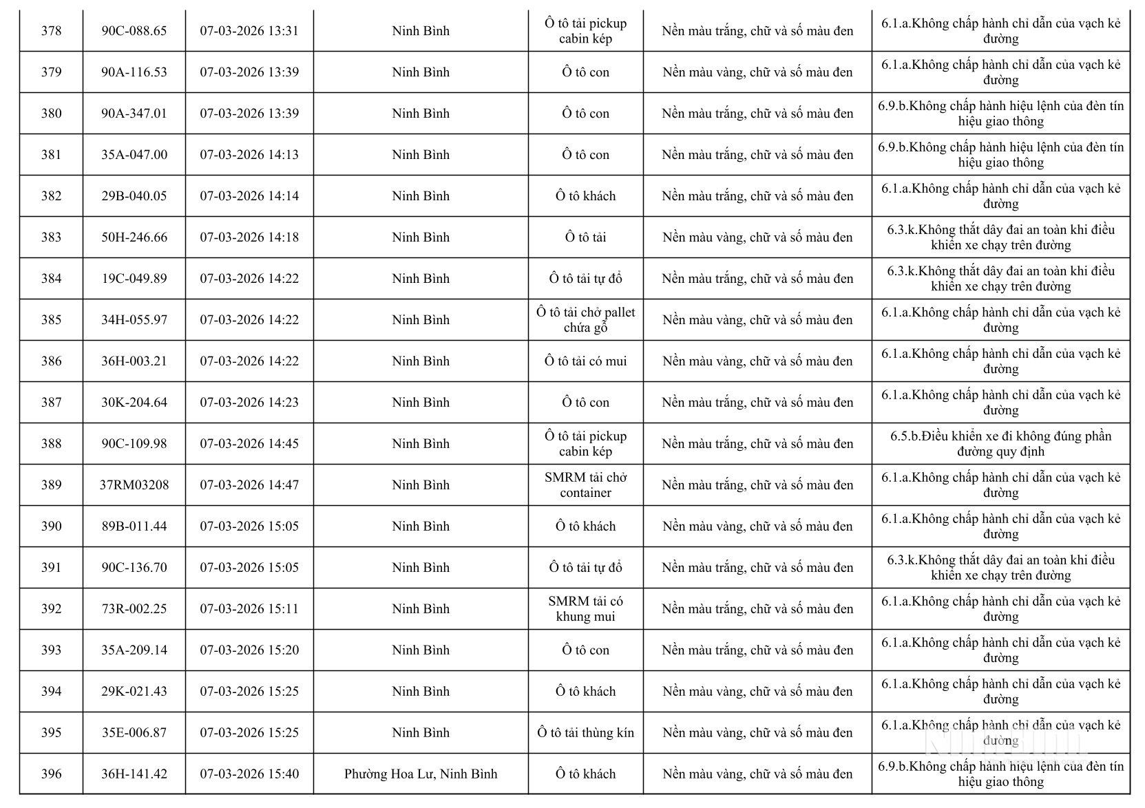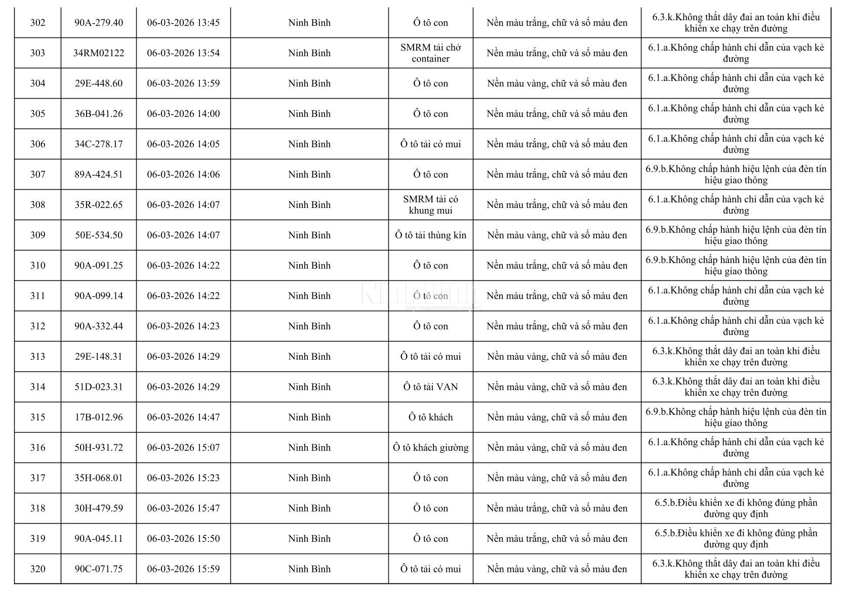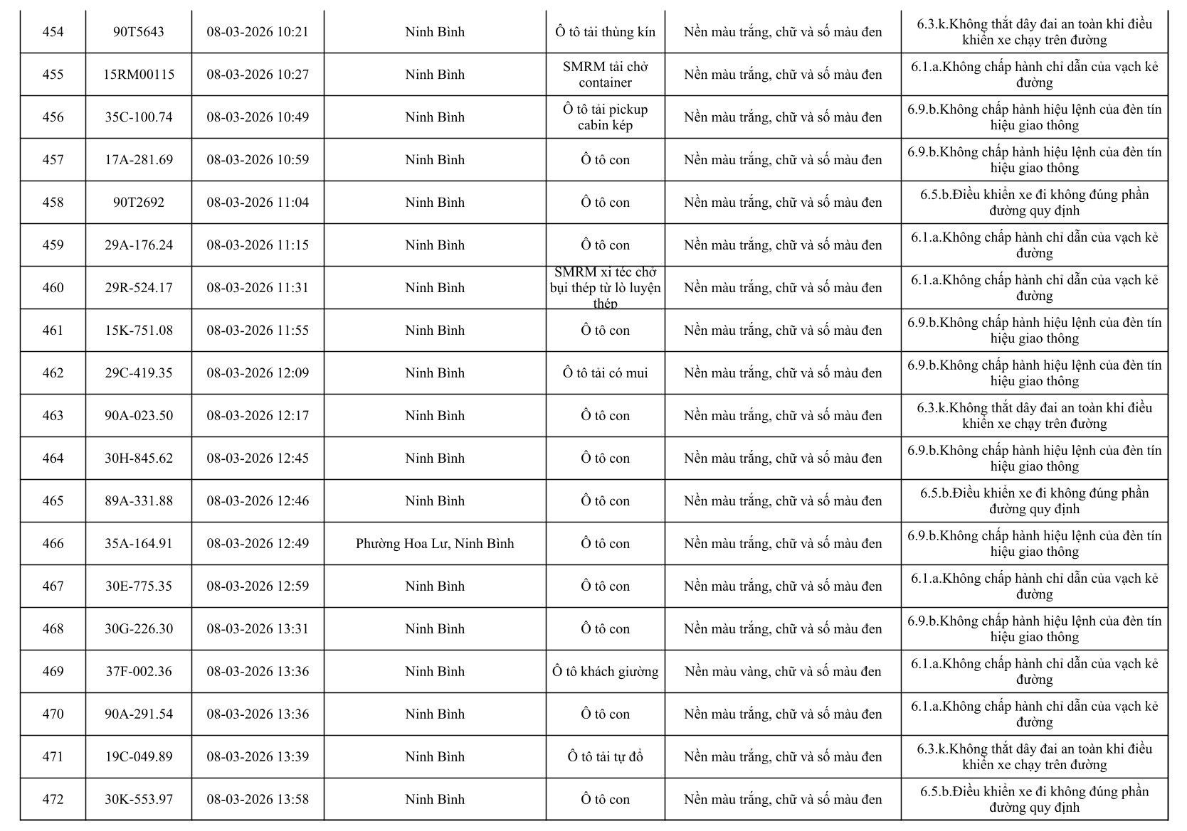 Danh sách phương tiện vi phạm giao thông được phát hiện qua hệ thống giám sát và thiết bị nghiệp vụ từ ngày 1-10/3/2026
