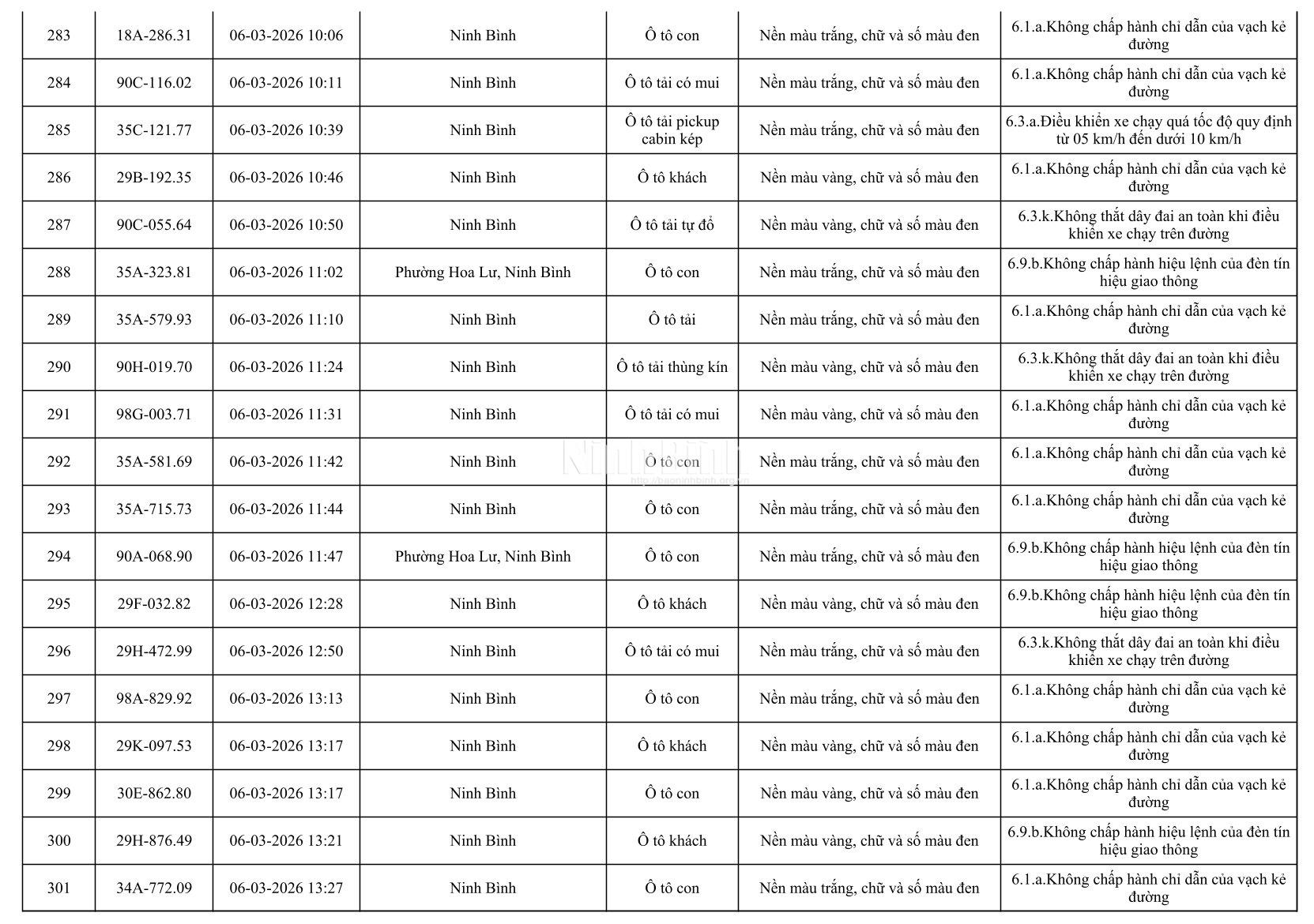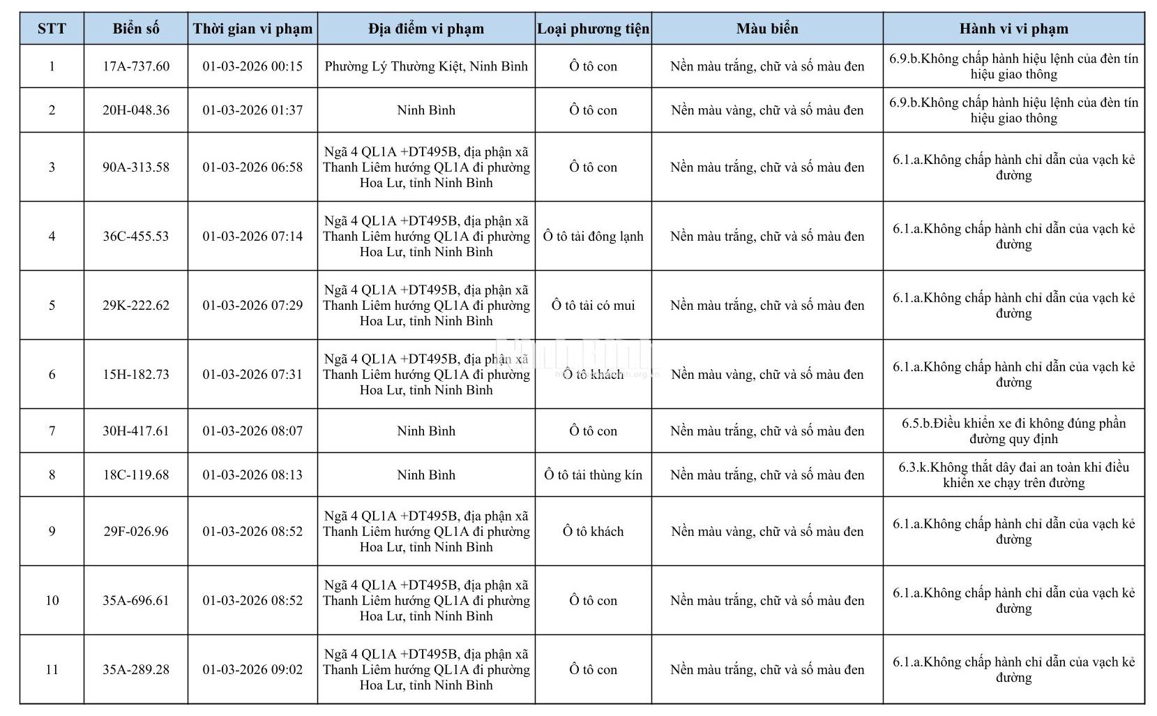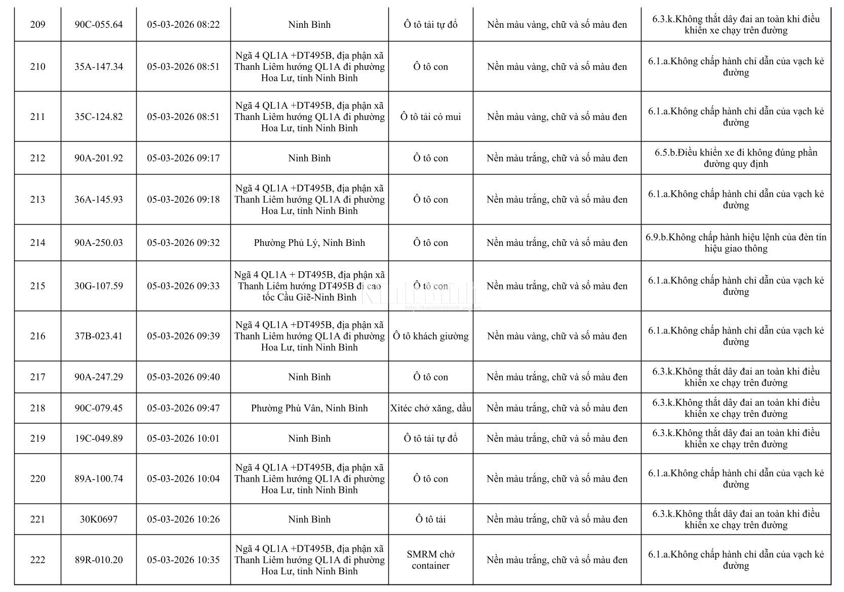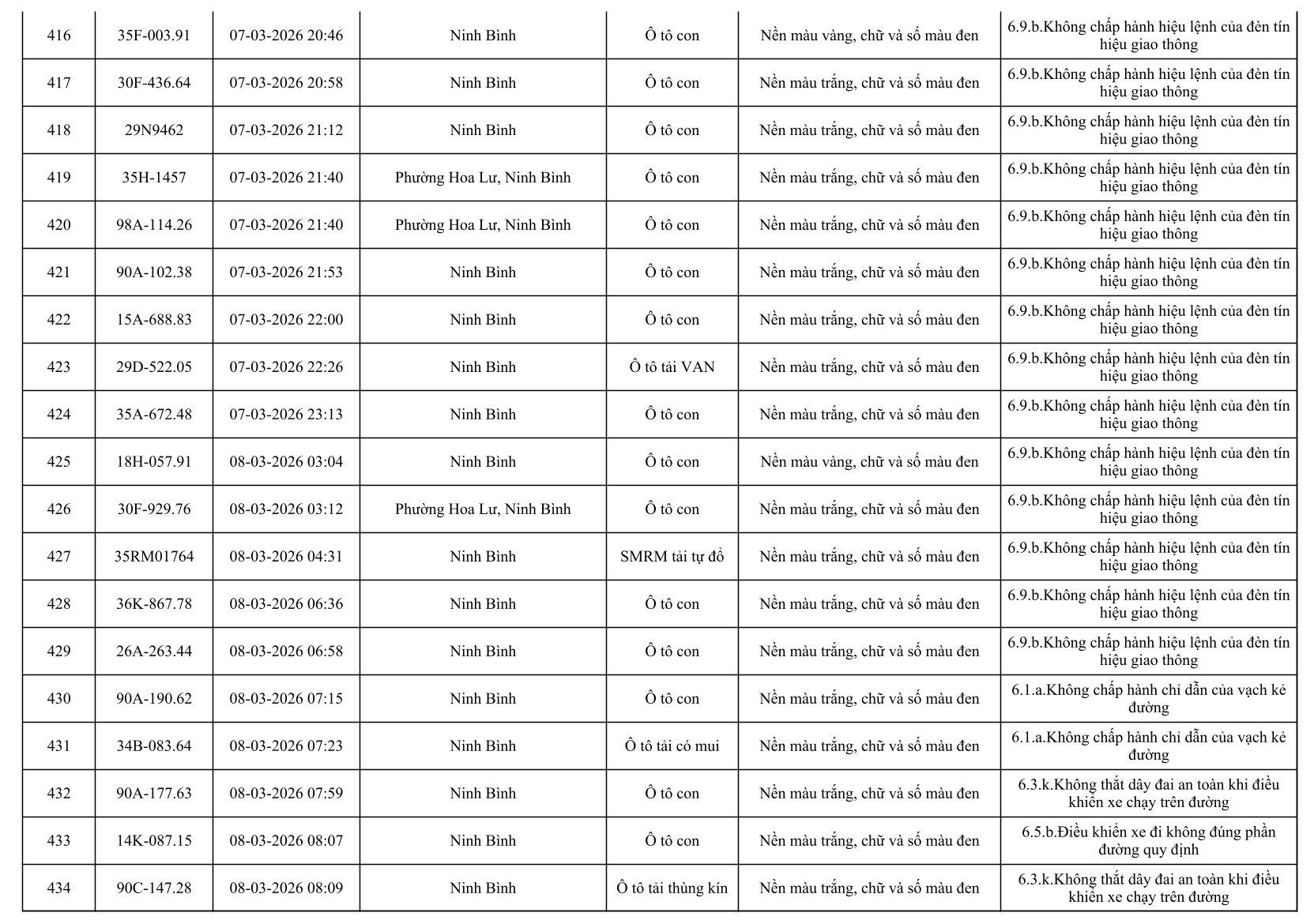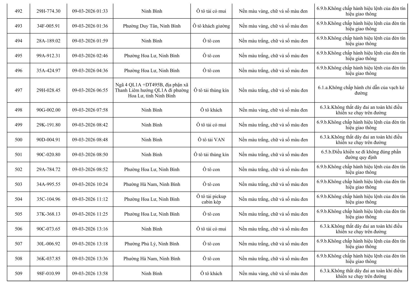 Danh sách phương tiện vi phạm giao thông được phát hiện qua hệ thống giám sát và thiết bị nghiệp vụ từ ngày 1-10/3/2026