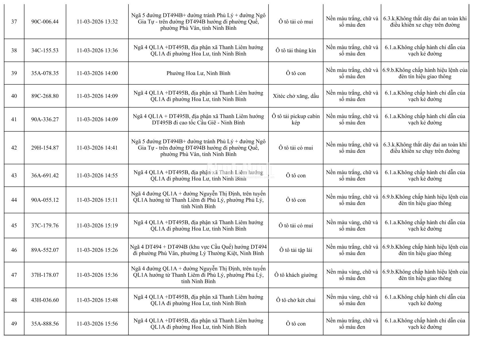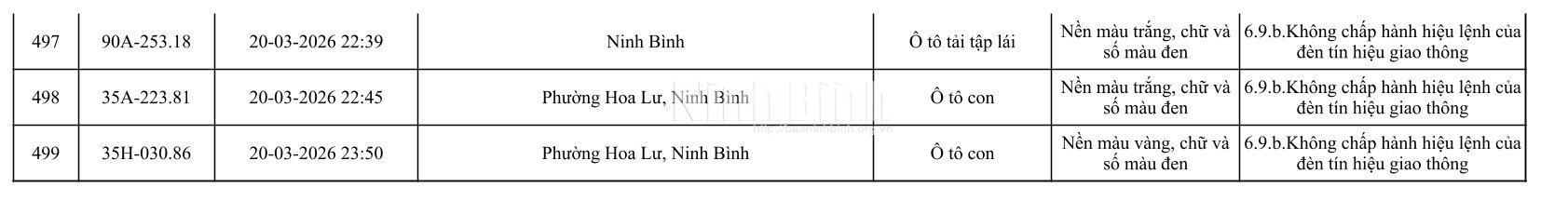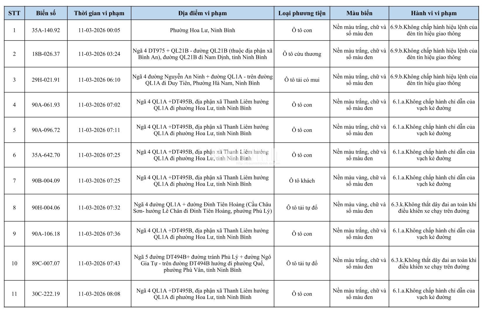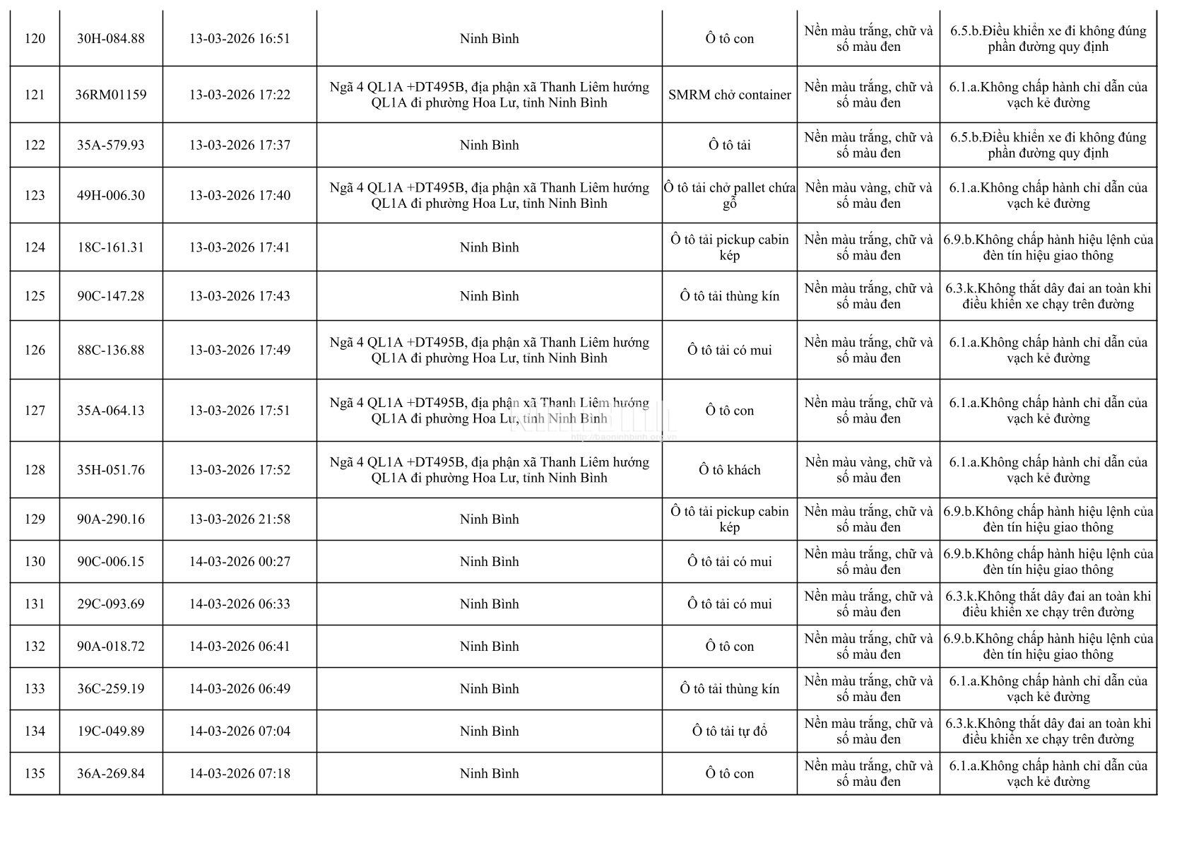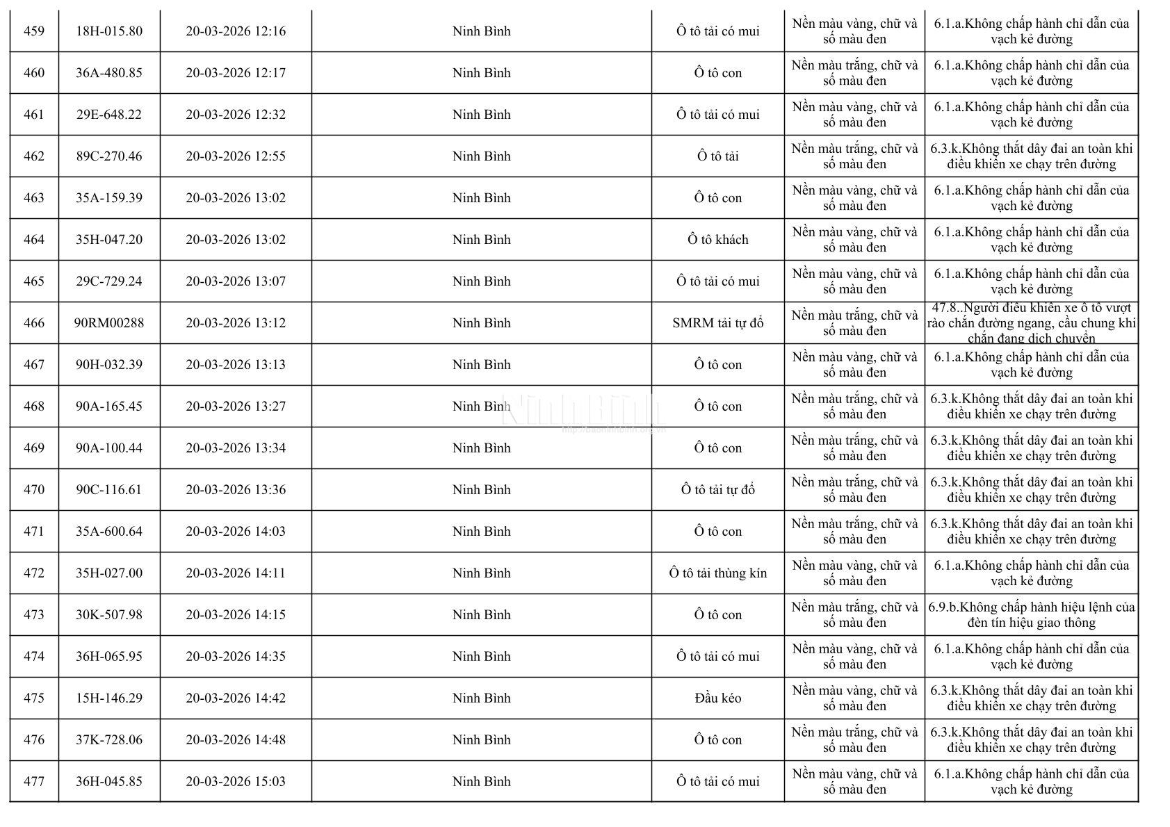 Danh sách phương tiện vi phạm giao thông được phát hiện qua hệ thống giám sát và thiết bị nghiệp vụ từ ngày 11-20/3/2026