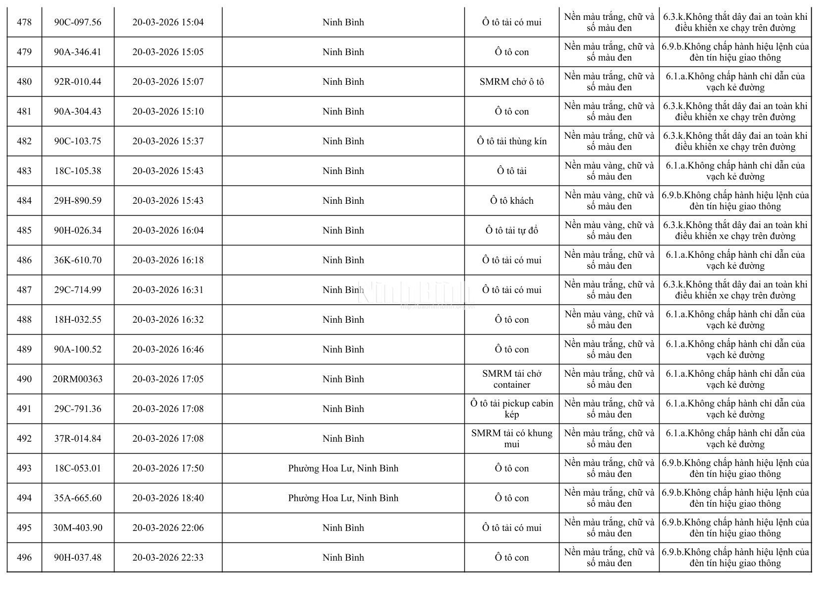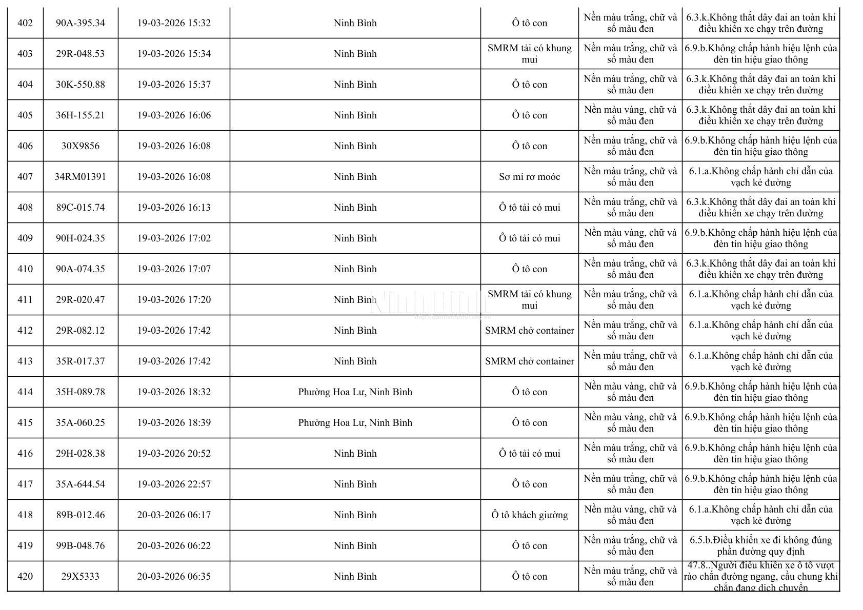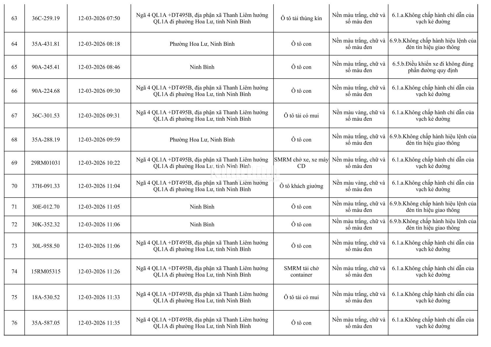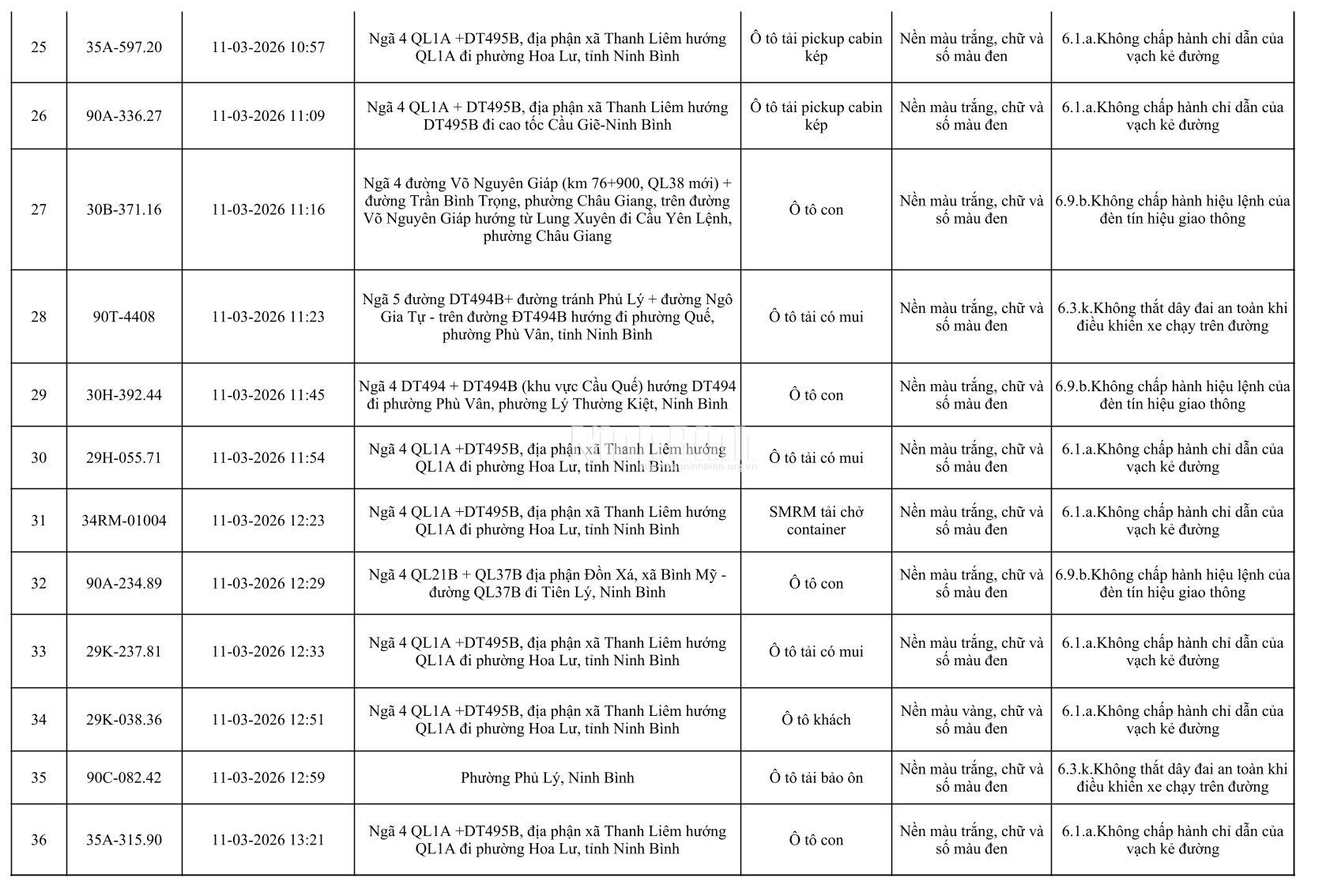 Danh sách phương tiện vi phạm giao thông được phát hiện qua hệ thống giám sát và thiết bị nghiệp vụ từ ngày 11-20/3/2026