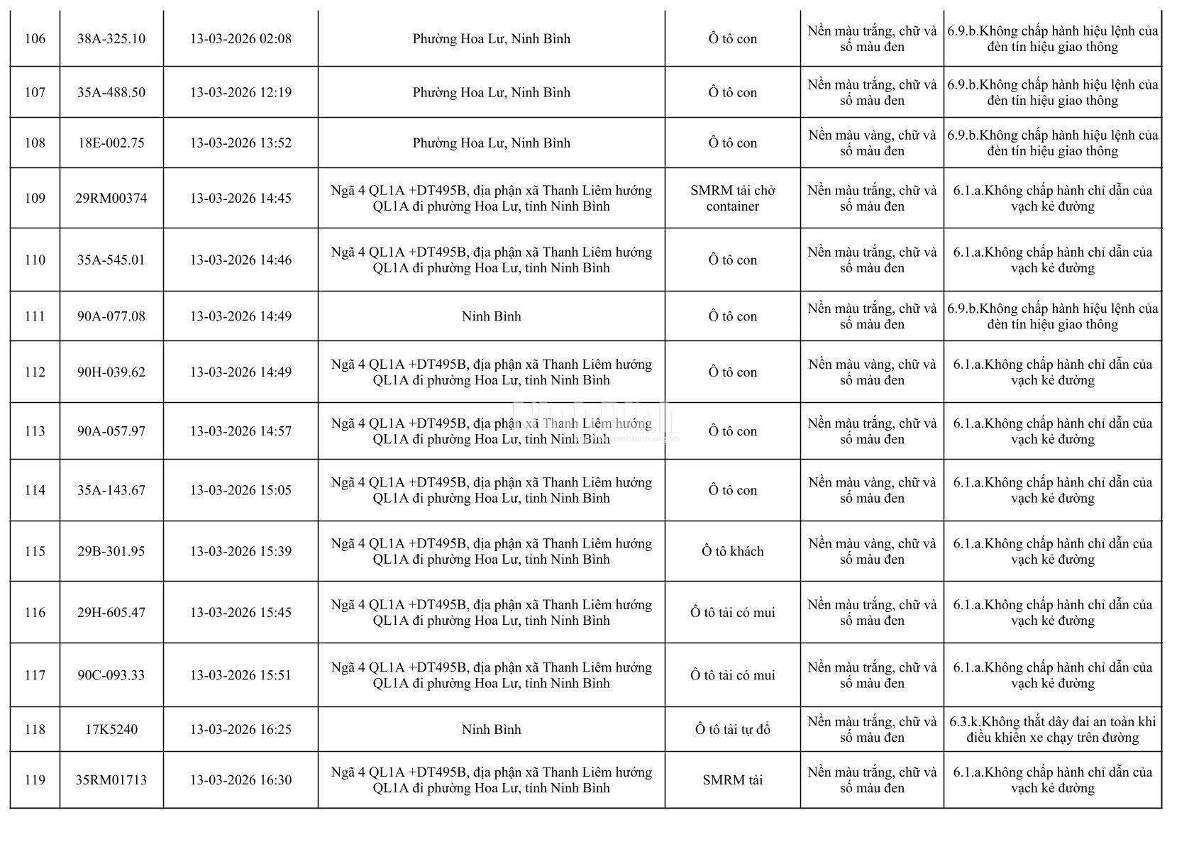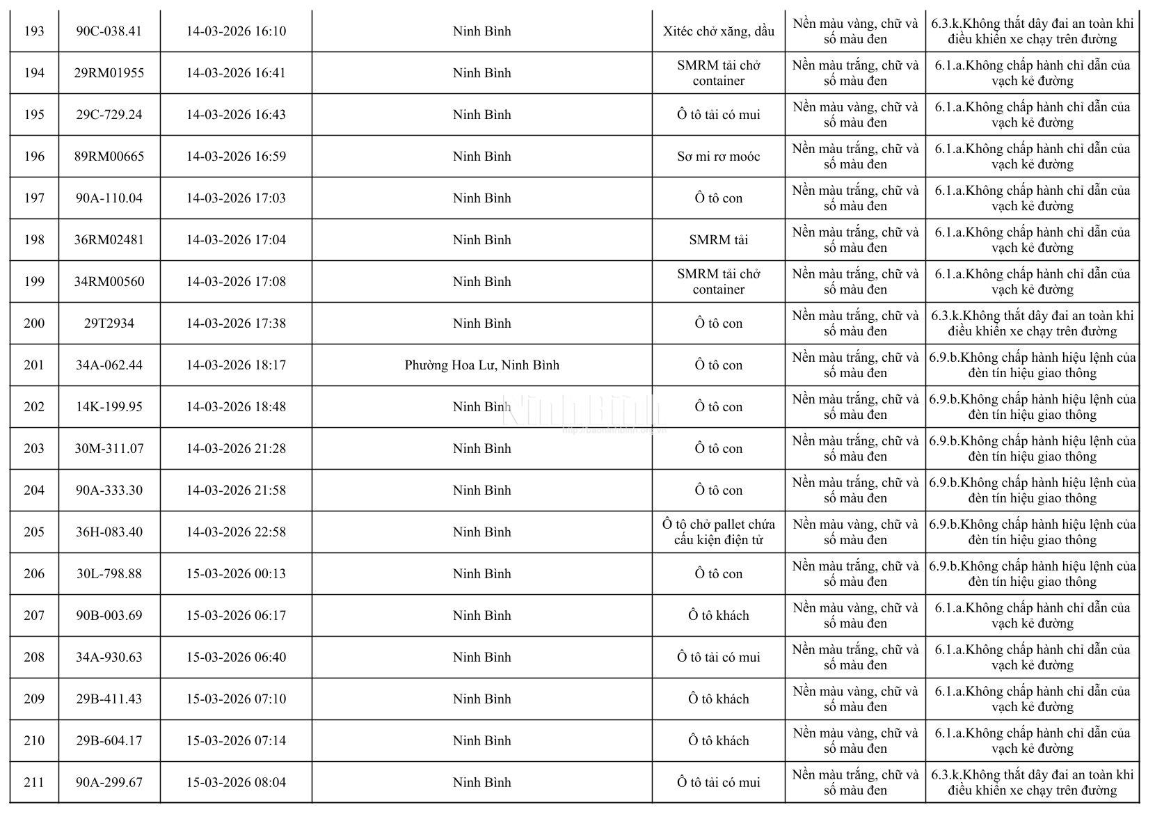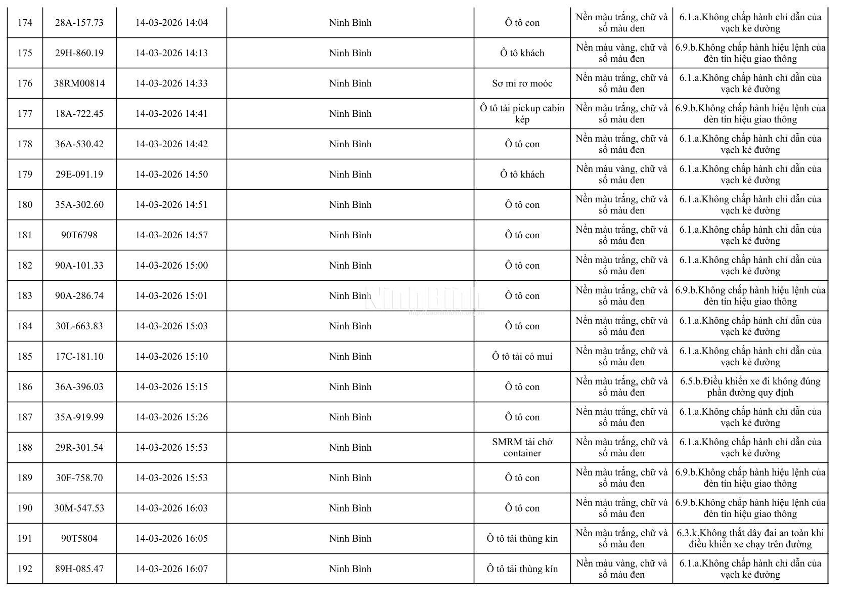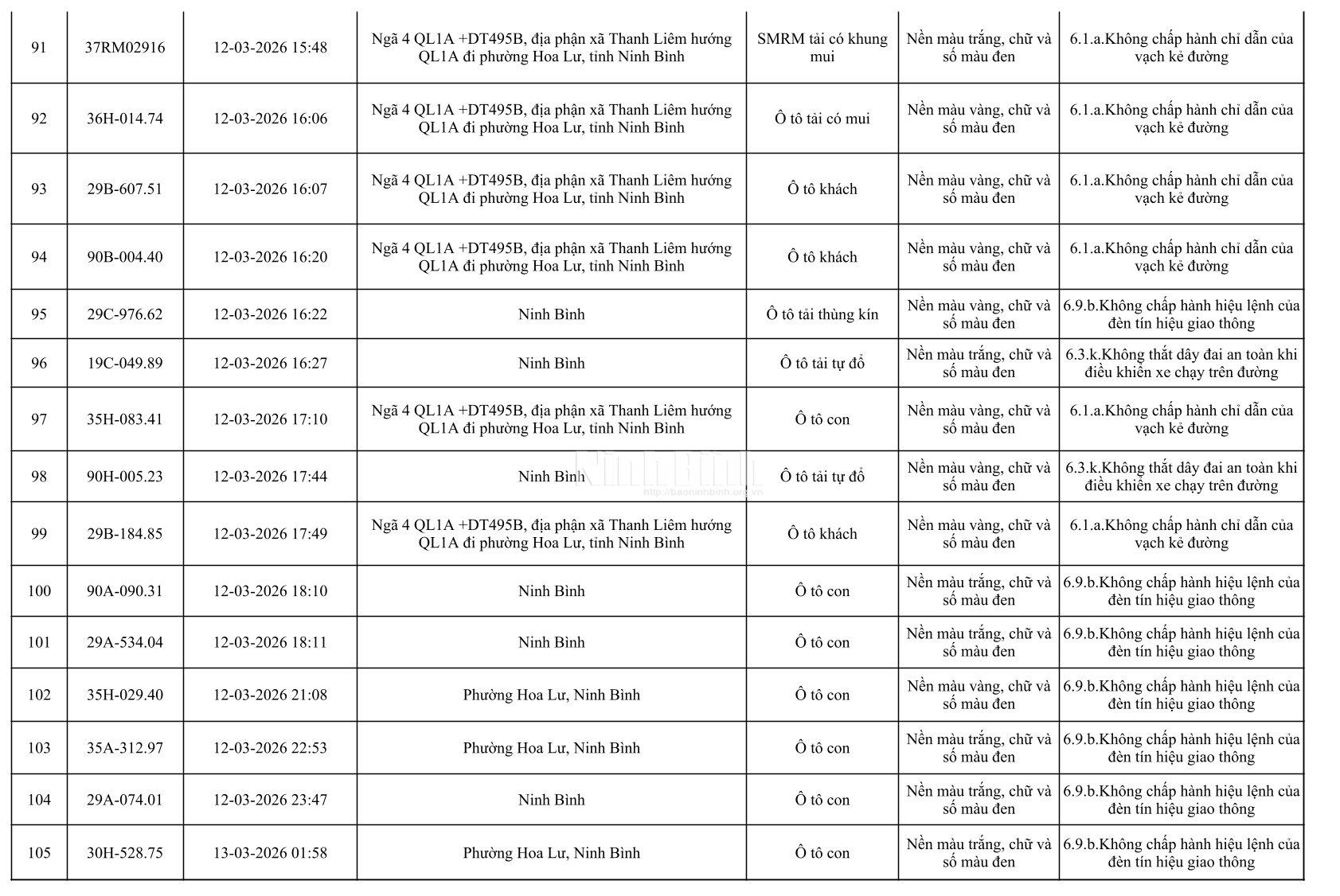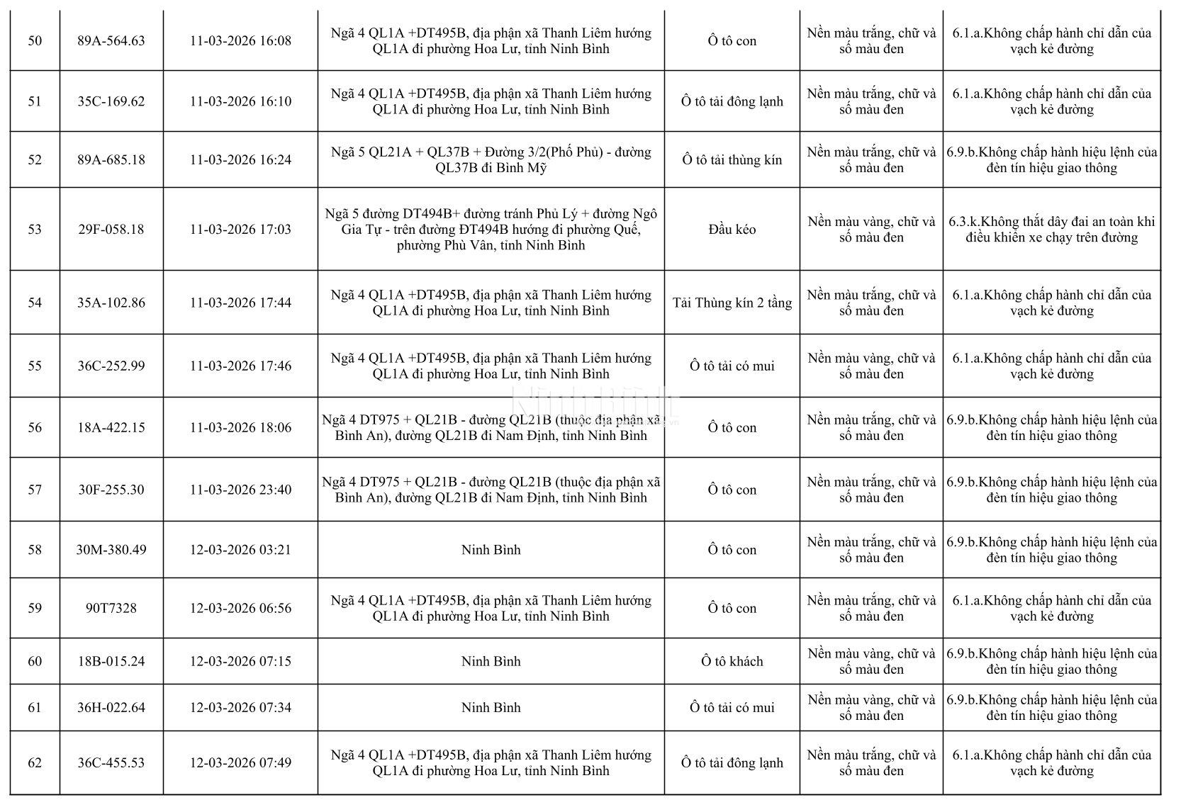 Danh sách phương tiện vi phạm giao thông được phát hiện qua hệ thống giám sát và thiết bị nghiệp vụ từ ngày 11-20/3/2026