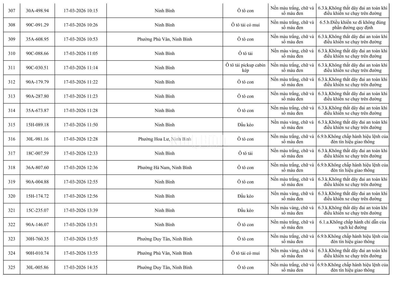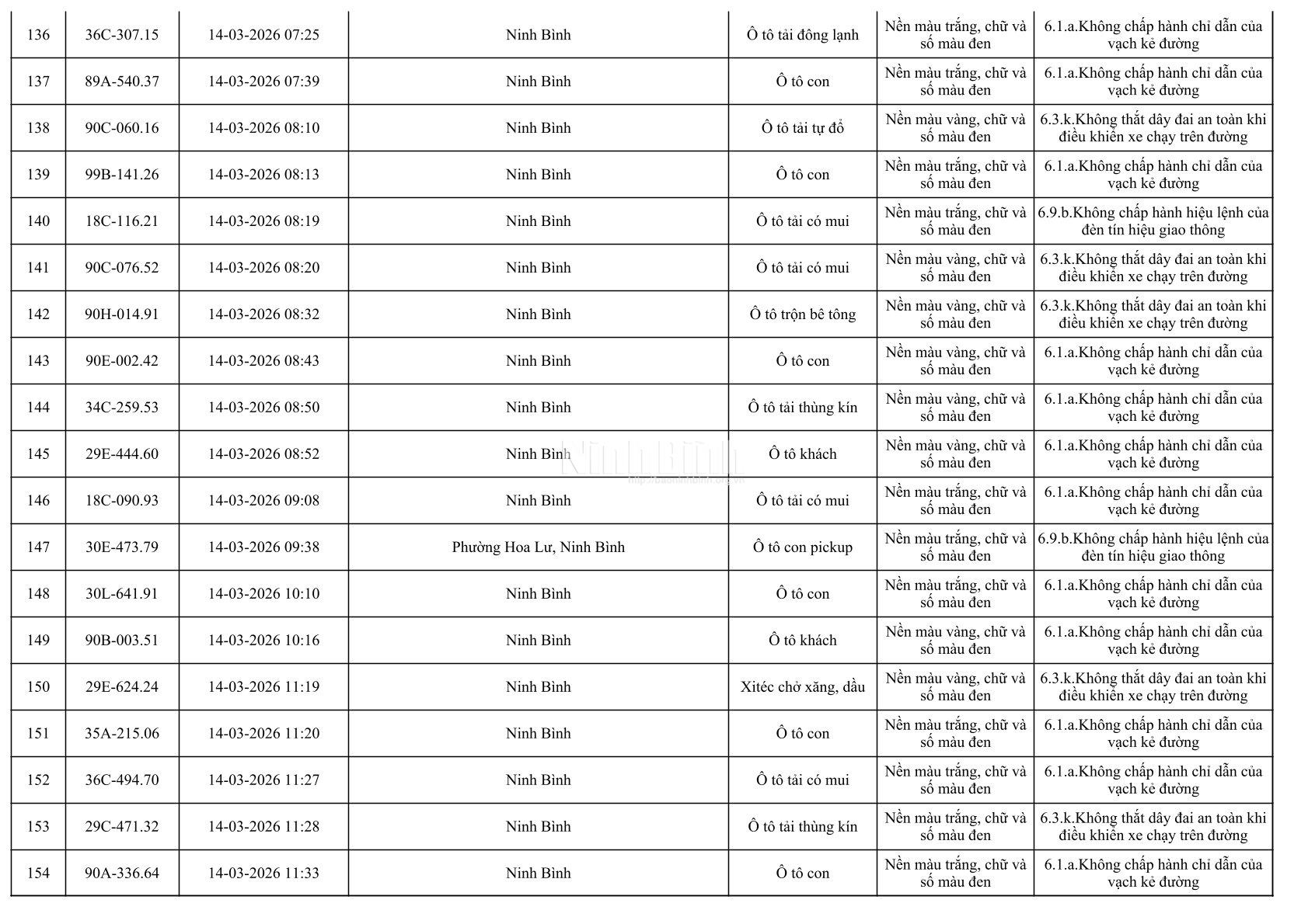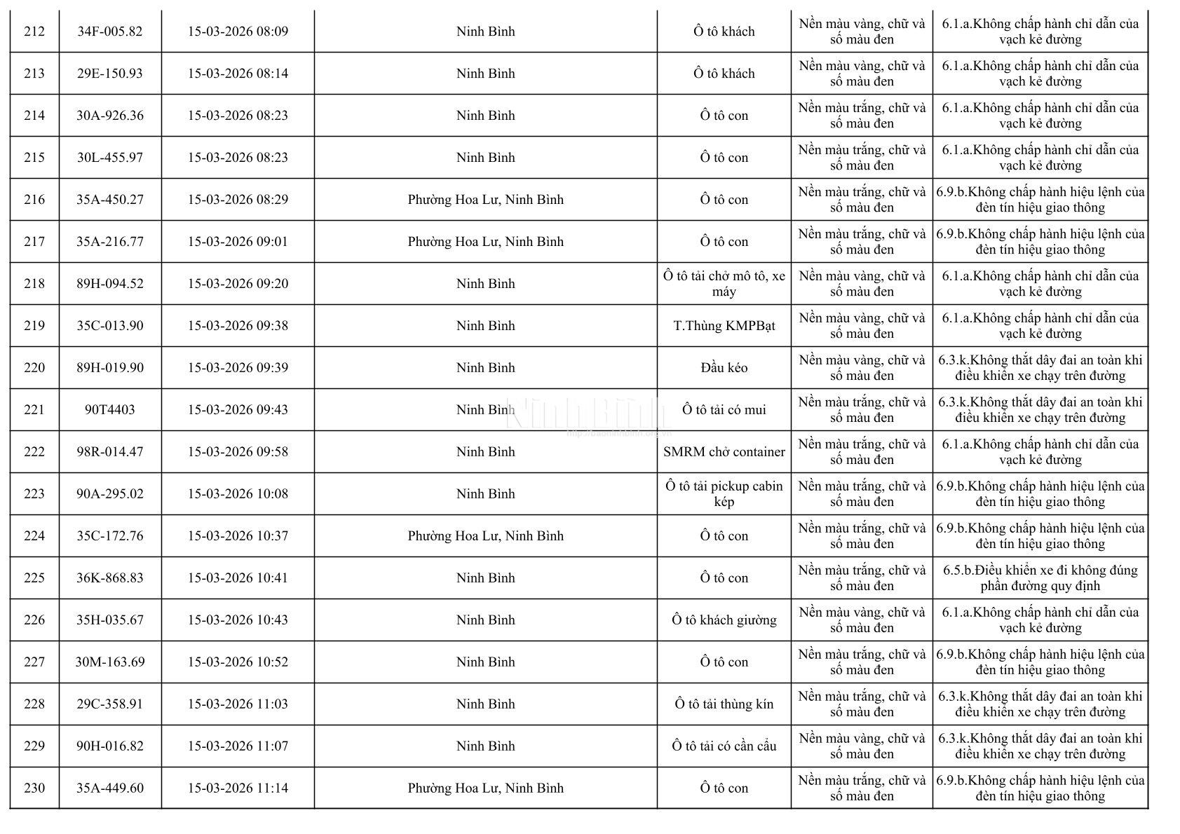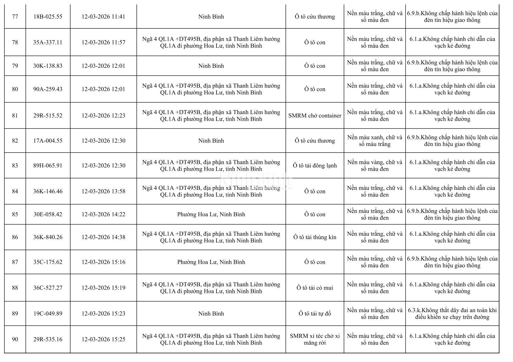 Danh sách phương tiện vi phạm giao thông được phát hiện qua hệ thống giám sát và thiết bị nghiệp vụ từ ngày 11-20/3/2026
