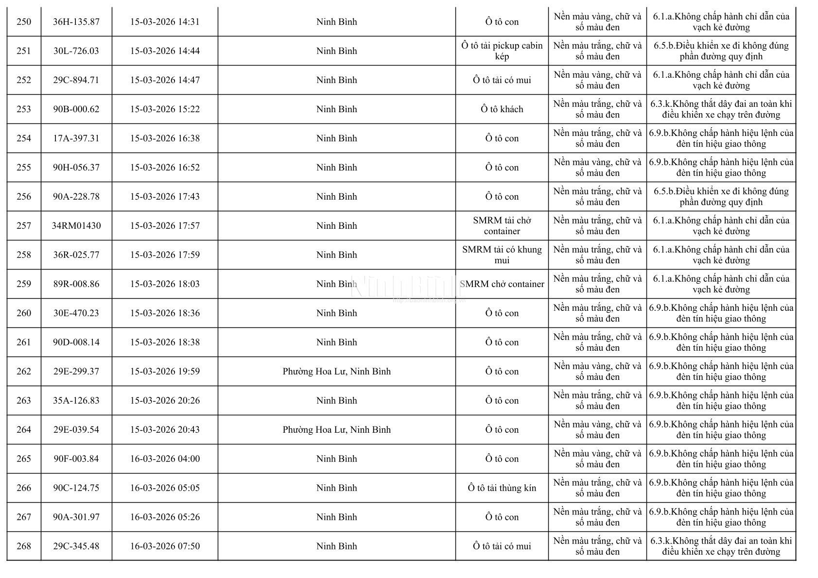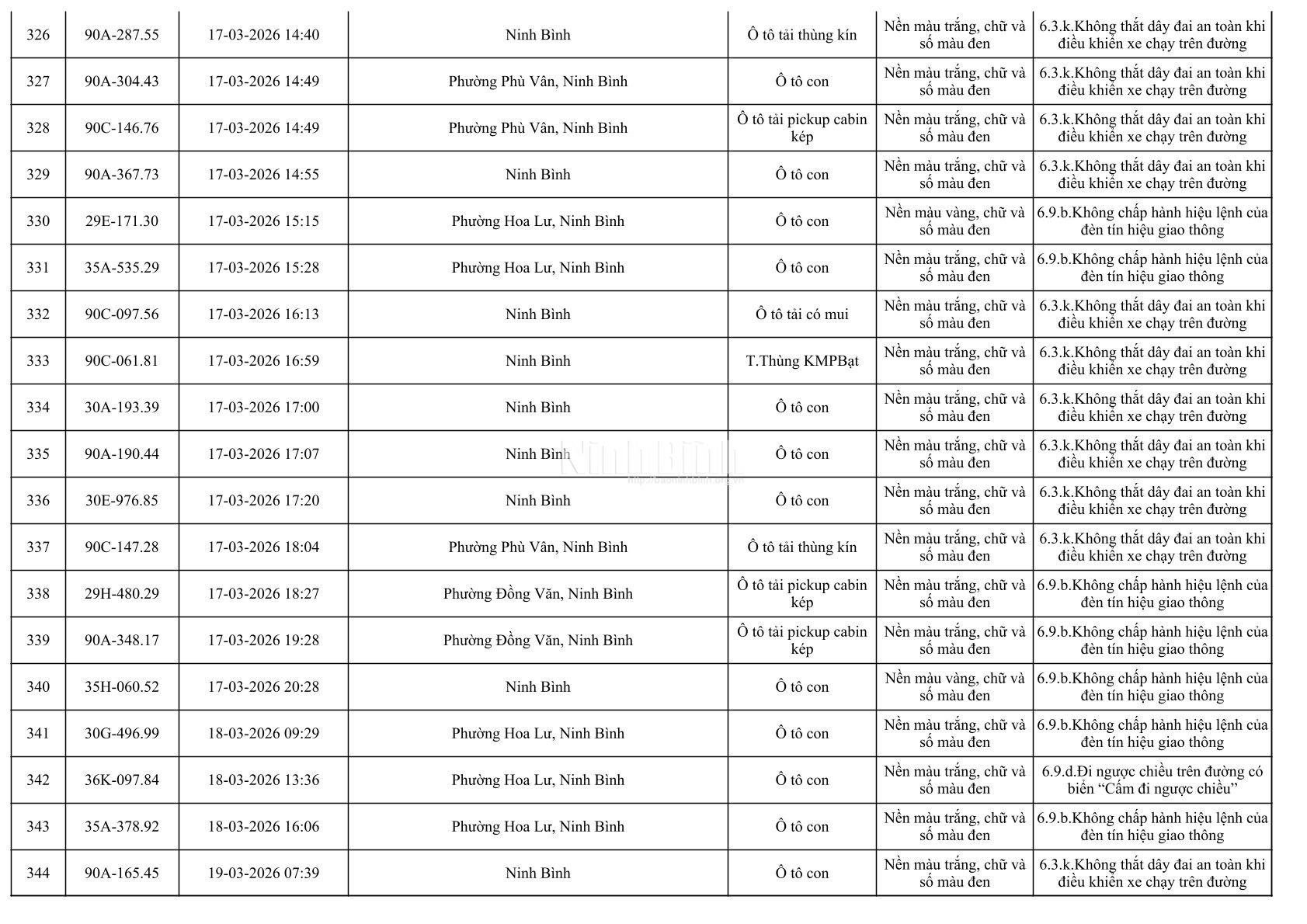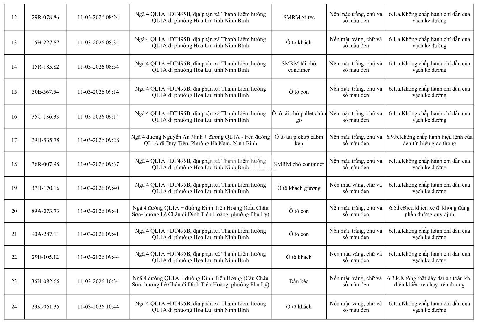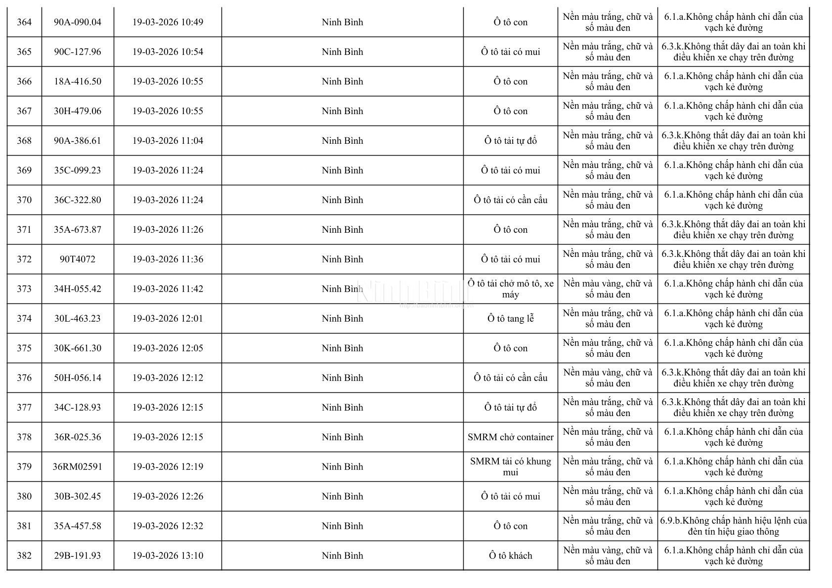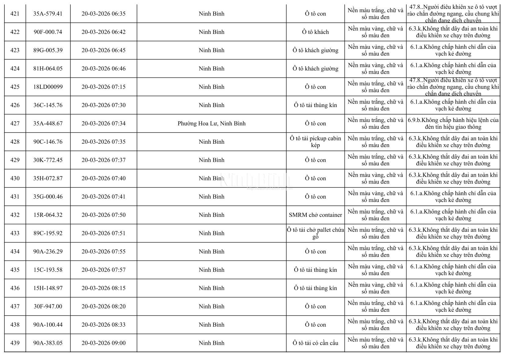Danh sách phương tiện vi phạm giao thông được phát hiện qua hệ thống giám sát và thiết bị nghiệp vụ từ ngày 11-20/3/2026