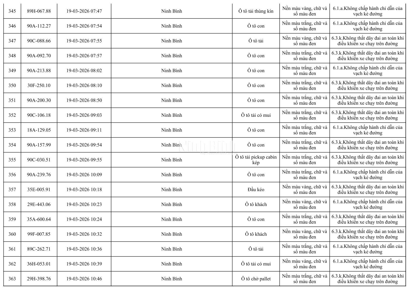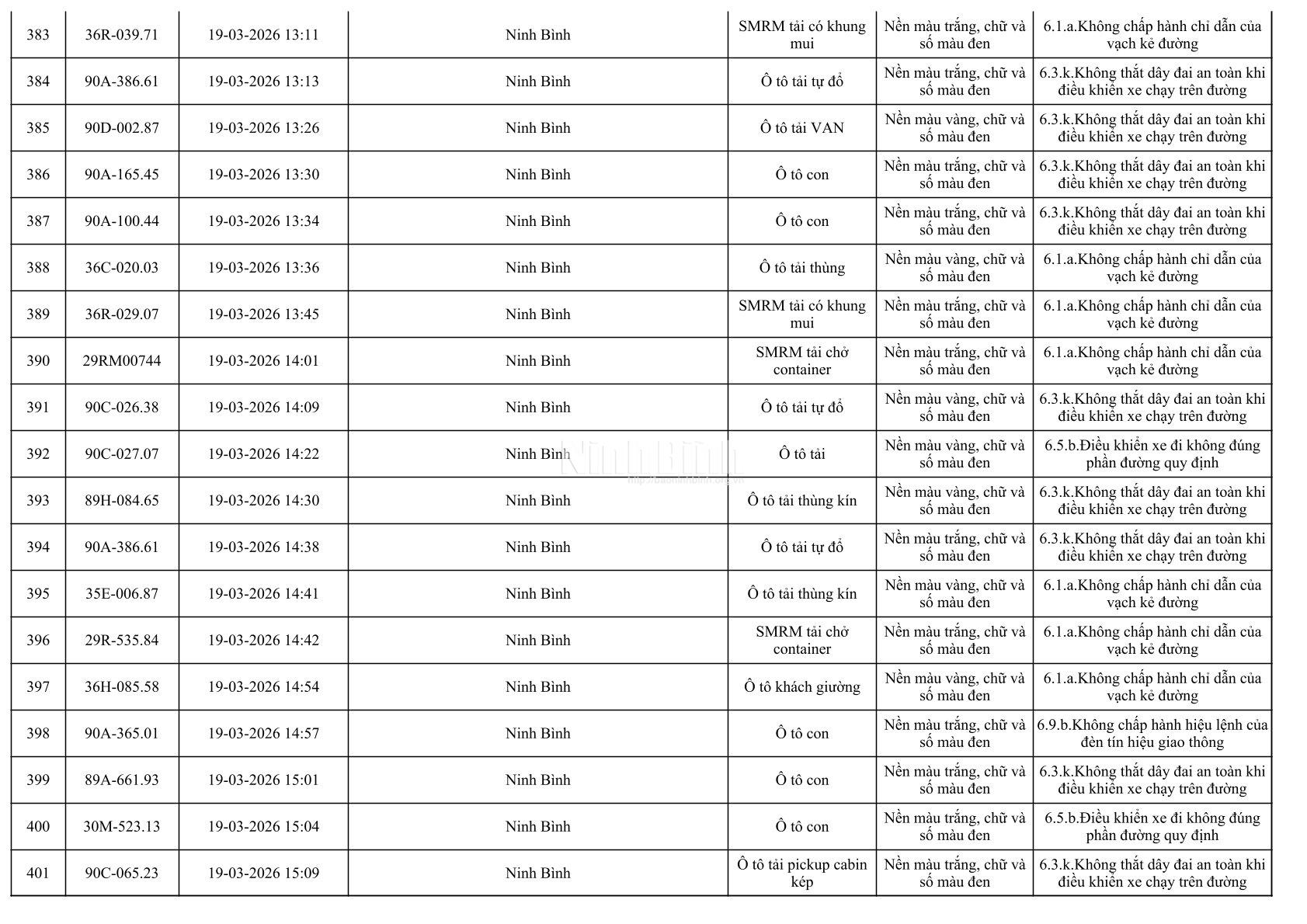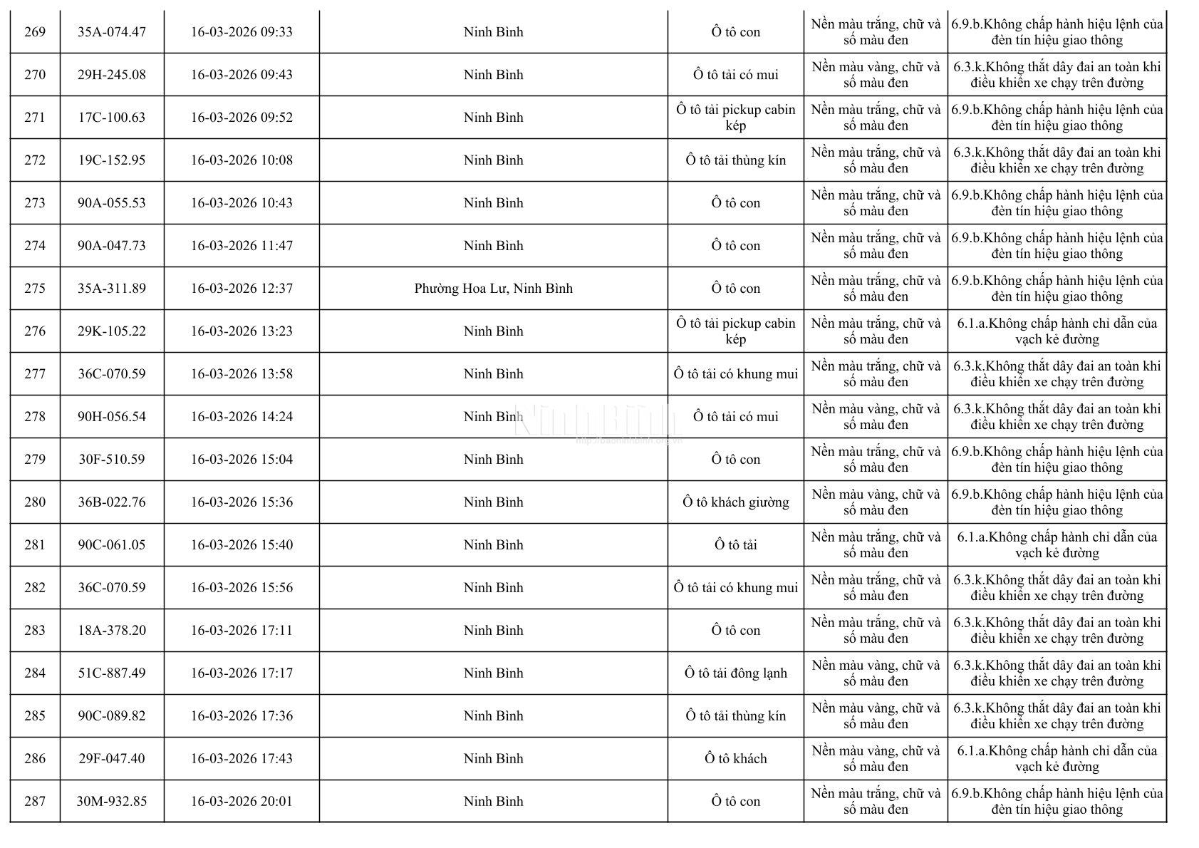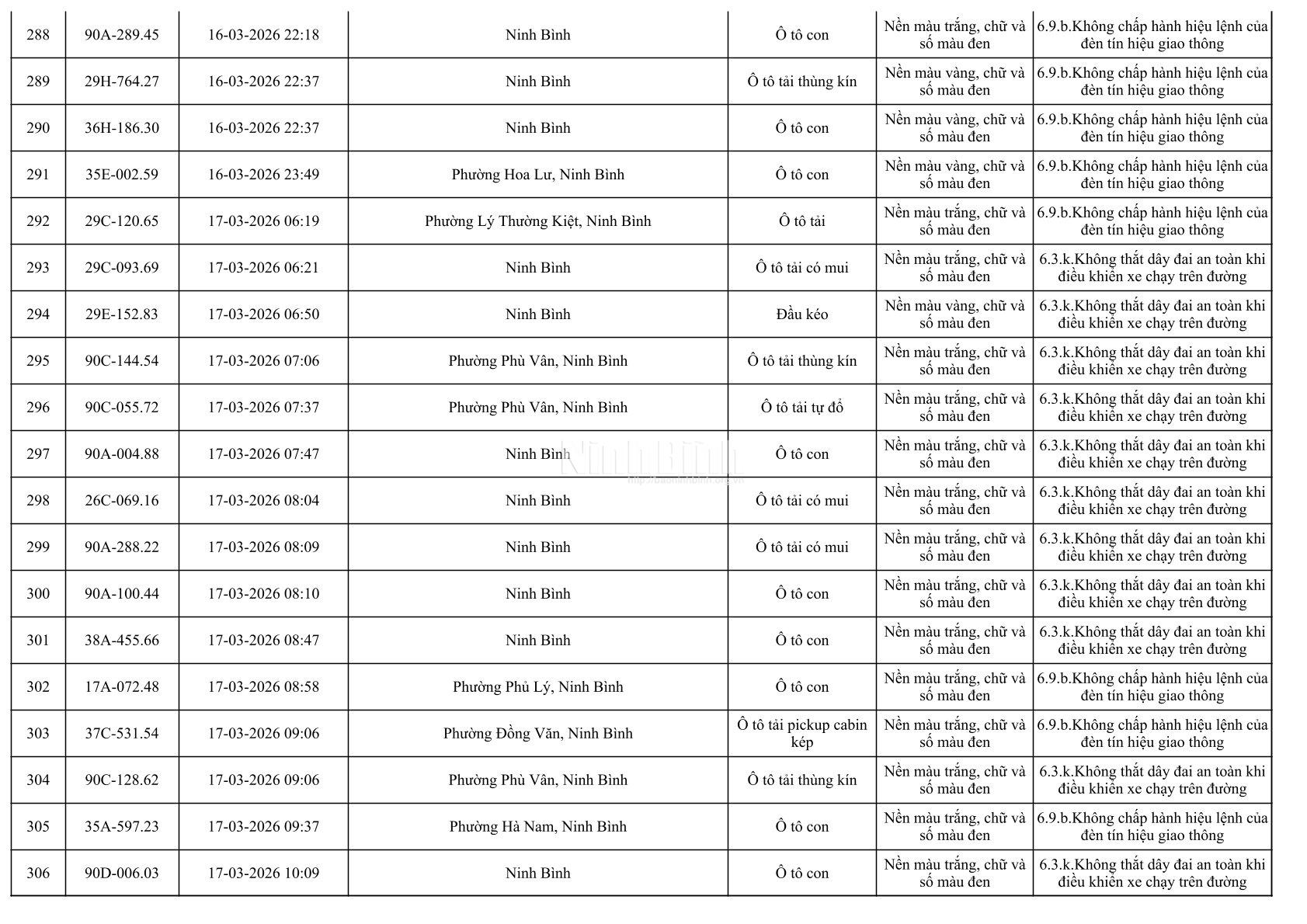 Danh sách phương tiện vi phạm giao thông được phát hiện qua hệ thống giám sát và thiết bị nghiệp vụ từ ngày 11-20/3/2026