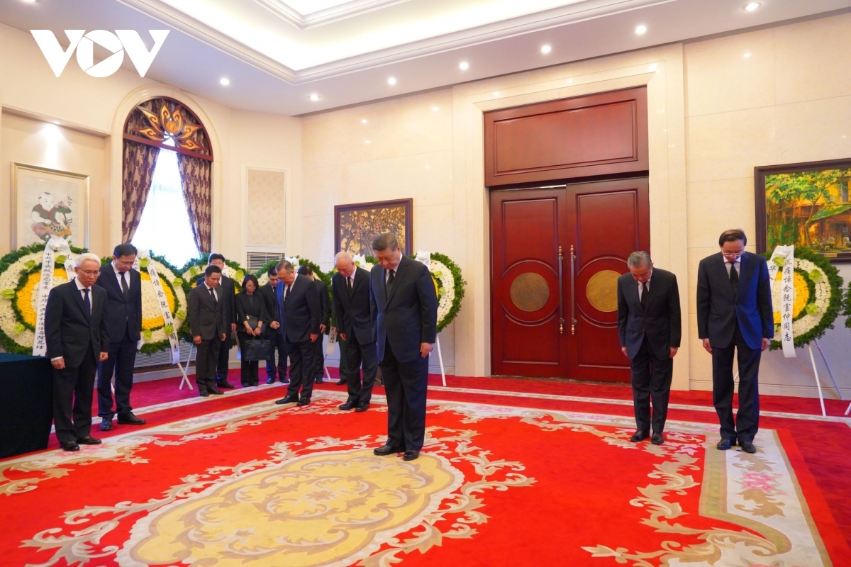 Chỉ 1 ngày sau khi Tổng Bí thư Nguyễn Phú Trọng từ trần, chiều 20/7, Tổng Bí thư, Chủ tịch nước Trung Quốc Tập Cận Bình đã đến Đại sứ quán Việt Nam tại Bắc Kinh viếng Tổng Bí thư Nguyễn Phú Trọng. Ông Tập Cận Bình ghi dòng chữ trong sổ tang: "Vô cùng thương tiếc đồng chí Nguyễn Phú Trọng, lãnh tụ kiệt xuất của nhân dân Việt Nam, người bạn vĩ đại của nhân dân Trung Quốc".