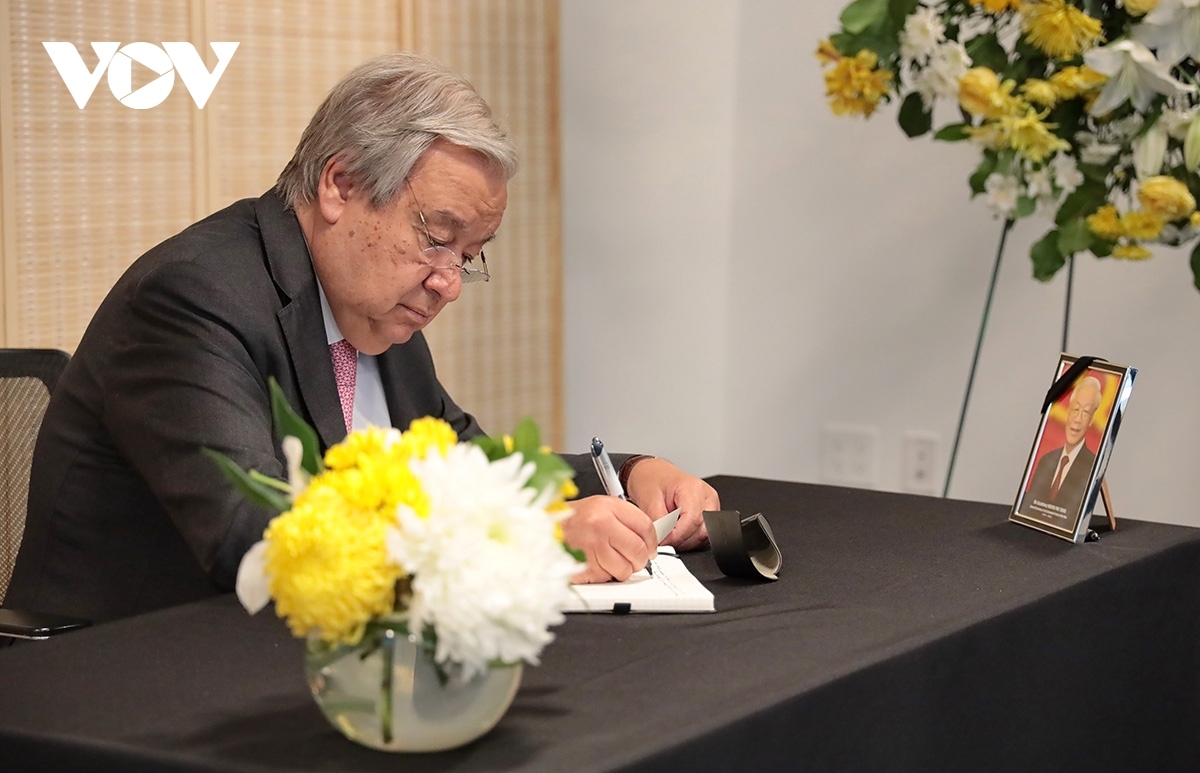 Tới viếng Tổng Bí thư Nguyễn Phú Trọng tại Phái đoàn thường trực Việt Nam tại Liên Hợp Quốc ở New York, Mỹ, Tổng Thư ký Liên Hợp Quốc Antonio Guterres đánh giá cao vai trò lãnh đạo chủ chốt của Tổng Bí thư Nguyễn Phú Trọng.