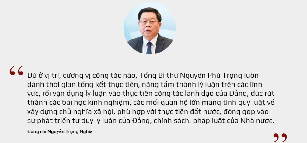 Dù ở vị trí, cương vị công tác nào, Đồng chí luôn dành thời gian tổng kết thực tiễn, nâng tầm thành lý luận trên các lĩnh vực, rồi vận dụng lý luận vào thực tiễn công tác lãnh đạo của Đảng, đúc rút thành các bài học kinh nghiệm, các mối quan hệ lớn mang tính quy luật về xây dựng chủ nghĩa xã hội, phù hợp với thực tiễn đất nước, đóng góp vào sự phát triển tư duy lý luận của Đảng, chính sách, pháp luật của Nhà nước.