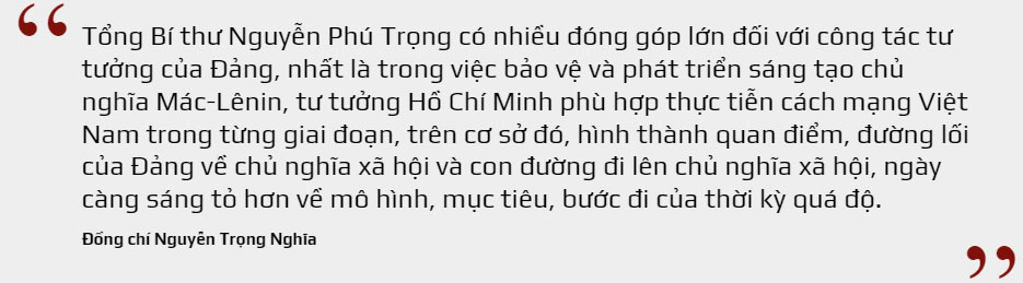 Tổng Bí thư Nguyễn Phú Trọng dành sự quan tâm lớn đối với công tác tư tưởng của Đảng. Trải qua các cương vị quan trọng: Ủy viên Ban Chấp hành Trung ương Đảng từ khóa VII đến khóa XIII; Ủy viên Bộ Chính trị từ khóa VIII đến khóa XIII; Tổng Biên tập Tạp chí Cộng sản; Bí thư Thành ủy Hà Nội; Chủ tịch Hội đồng Lý luận Trung ương; Chủ tịch Quốc hội; Chủ tịch nước; Tổng Bí thư từ khóa XI đến khóa XIII, Đồng chí đã chứng tỏ là một nhà chính trị, nhà tư tưởng đặc biệt xuất sắc. Trong mọi hoàn cảnh, Đồng chí luôn thể hiện bản lĩnh, trí tuệ của người cộng sản có tầm nhìn chiến lược; tuyệt đối trung thành với Đảng, với Tổ quốc và Nhân dân; kiên định chủ nghĩa Mác-Lênin, tư tưởng Hồ Chí Minh, mục tiêu, lý tưởng cách mạng của Đảng và dân tộc, các nguyên tắc của Đảng; giữ gìn, nêu cao và lan tỏa phẩm chất đạo đức cách mạng trong sáng, tiền phong, gương mẫu, khiêm tốn, bình dị, gần gũi nhân dân.