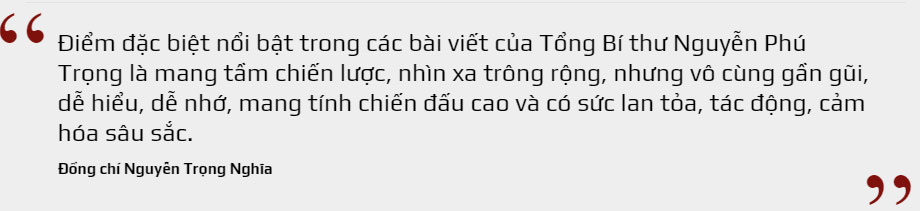 Nhiều câu thơ, ca dao, tục ngữ, lời dạy của Chủ tịch Hồ Chí Minh đã được Tổng Bí thư vận dụng trong lối viết báo, vừa thể hiện tính sắc sảo, tầm vóc trí tuệ chứa đựng tư tưởng chỉ đạo lớn lao của người đứng đầu Đảng Cộng sản Việt Nam, vừa thể hiện bút pháp phong phú, đa dạng của người chiến sĩ trên mặt trận tư tưởng văn hóa. Bởi vậy, nội dung thông điệp dù rất trừu tượng, từ học thuyết Mác-Lênin, tư tưởng Hồ Chí Minh, đến lý luận xây dựng Đảng, đường lối phát triển kinh tế-xã hội, phát triển kinh tế thị trường định hướng xã hội chủ nghĩa, đường lối văn hóa, đường lối đối ngoại, quốc phòng-an ninh… đều được truyền tải hết sức dung dị, dễ hiểu, sinh động, hấp dẫn, tạo sức lan tỏa mạnh mẽ trong cán bộ, đảng viên và Nhân dân, trở thành “cẩm nang” sinh hoạt chính trị sâu rộng trong các cấp ủy, tổ chức đảng, chính quyền, địa phương, cơ quan, đơn vị.