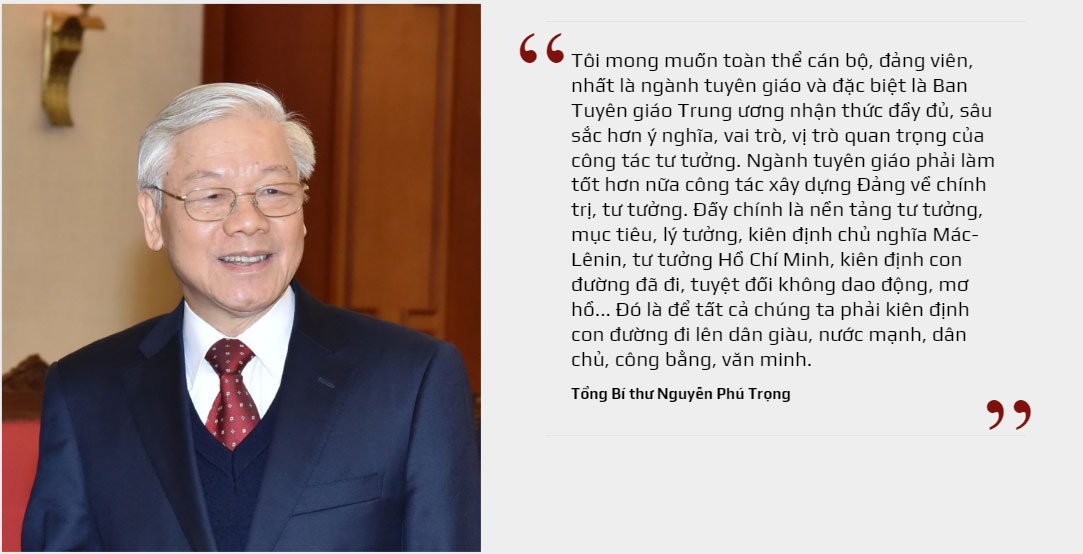 Đồng thời, Đồng chí cũng chỉ rõ: “Công tác tư tưởng là công tác quan trọng hàng đầu, nhưng khó ở chỗ tư tưởng rất trừu tượng... Điều đáng sợ nhất bây giờ là trong một bộ phận cán bộ, đảng viên, nhân dân, kể cả trong cán bộ tuyên giáo là sự mơ hồ, không phân biệt đúng sai, phai nhạt lý tưởng, giảm sút ý chí chiến đấu, mất hết nhuệ khí đấu tranh... Chính vì vậy, tôi mong muốn toàn thể cán bộ, đảng viên, nhất là ngành tuyên giáo và đặc biệt là Ban Tuyên giáo Trung ương nhận thức đầy đủ, sâu sắc hơn ý nghĩa, vai trò, vị trò quan trọng của công tác tư tưởng. Ngành tuyên giáo phải làm tốt hơn nữa công tác xây dựng Đảng về chính trị, tư tưởng. Đấy chính là nền tảng tư tưởng, mục tiêu, lý tưởng, kiên định chủ nghĩa Mác-Lênin, tư tưởng Hồ Chí Minh, kiên định con đường đã đi, tuyệt đối không dao động, mơ hồ... Đó là để tất cả chúng ta phải kiên định con đường đi lên dân giàu, nước mạnh, dân chủ, công bằng, văn minh”[6].